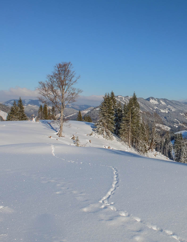 Hier zieht sich vor uns eine Wildspur den Hang hinauf, der wir folgen: