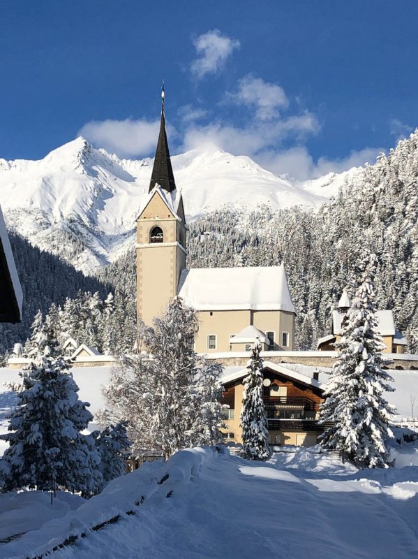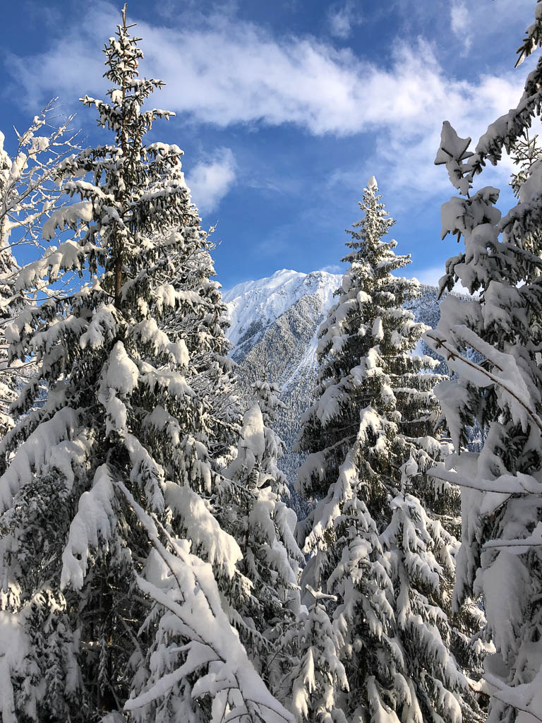 Der Blick durch schneebedeckten Fichten auf den Muchetta: