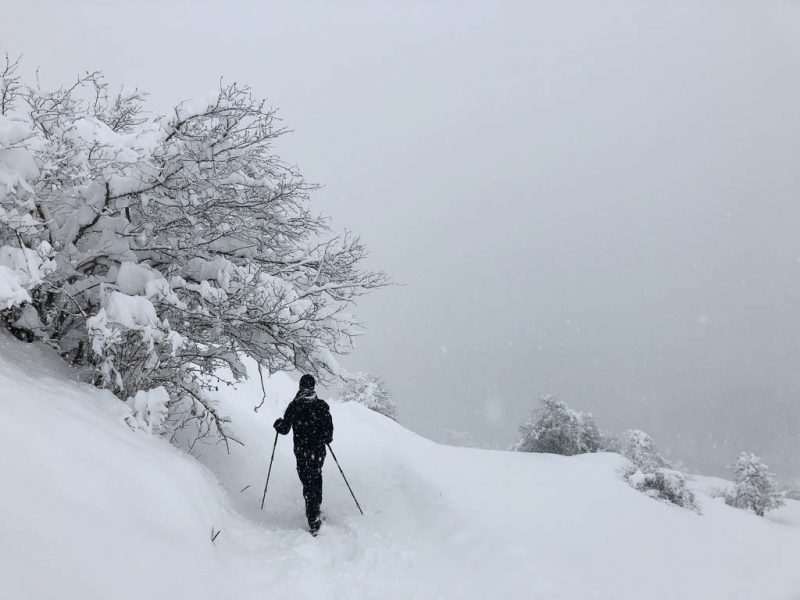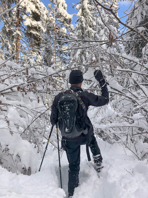 Immer wieder erschweren durch die Schneelast niedergedrückte Bäume das Weiterkommen:
