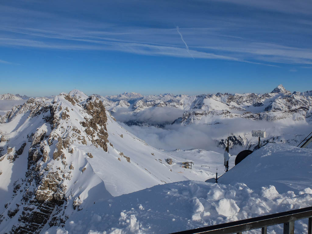 Unter der zwischen einem halben und einem Meter dicken Schneedecke war nämlich kein fester Grund, sondern nur leerer Raum. Ein Betreten hätte wahrscheinlich zum Abbruch des Überhangs geführt. Wieder auf dem Weg nach unten Richtung Station Höfatsblick: