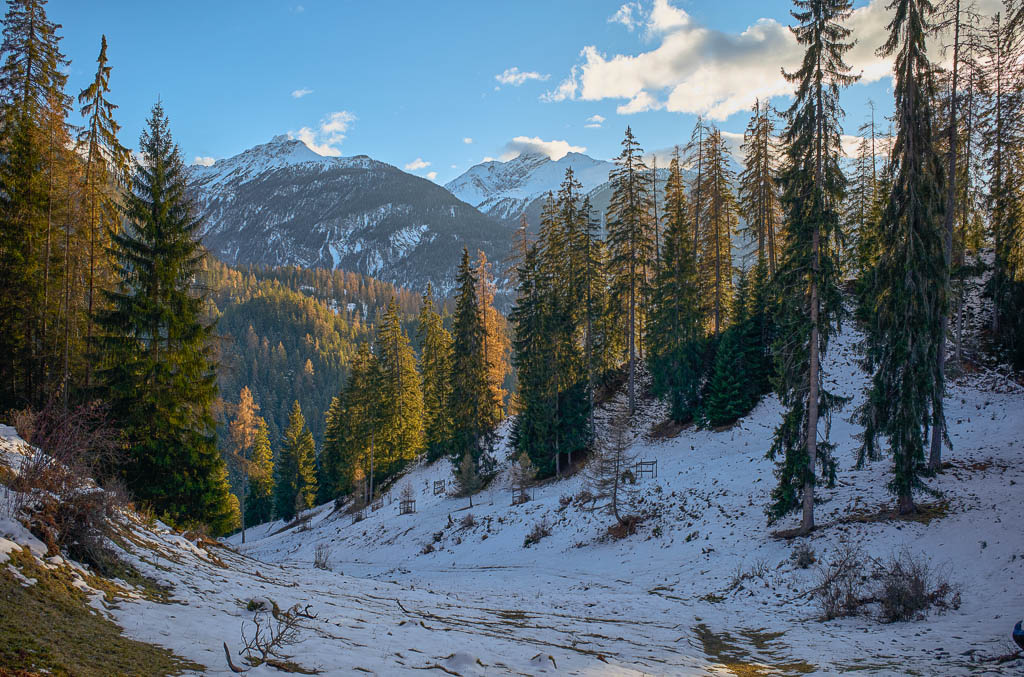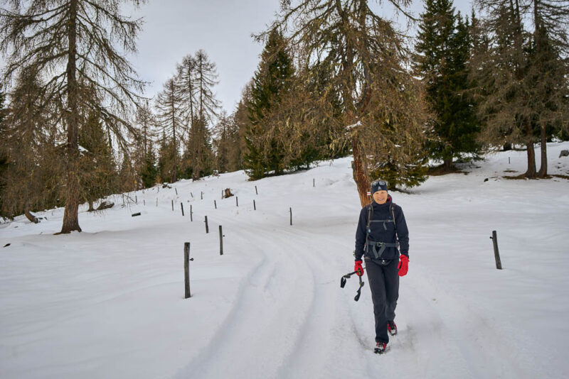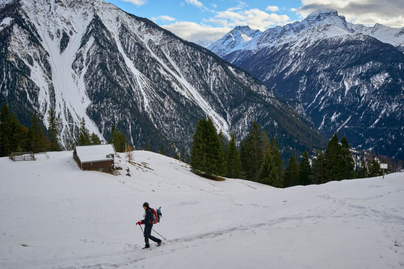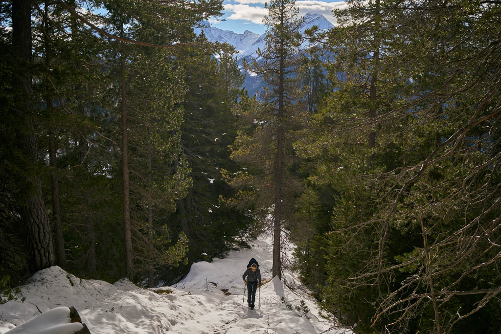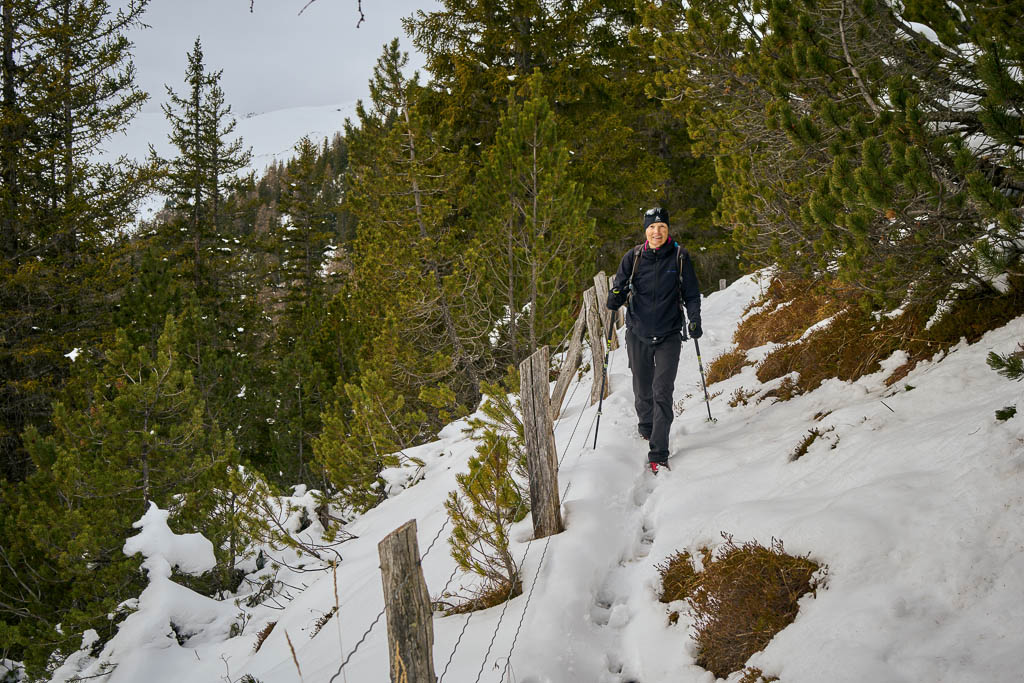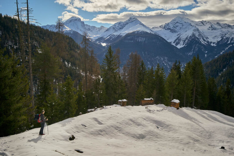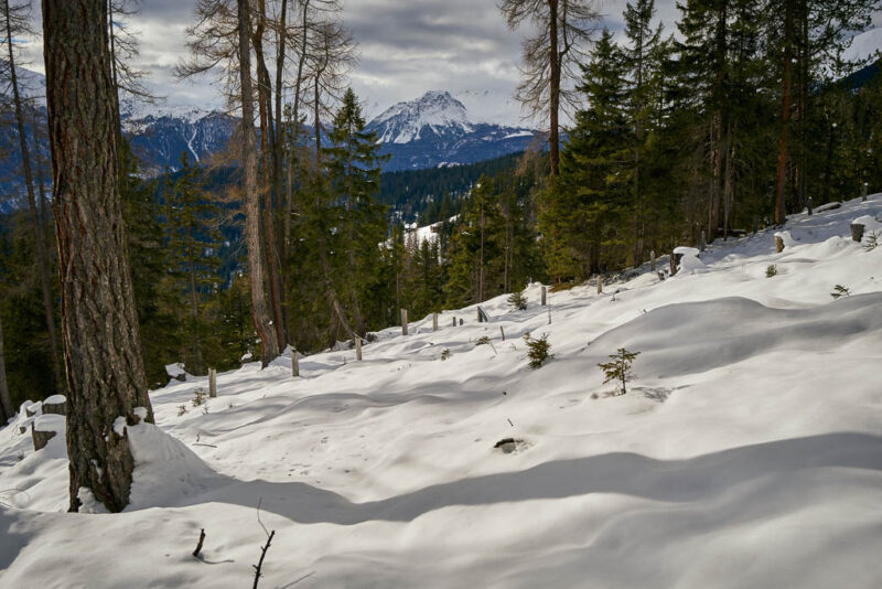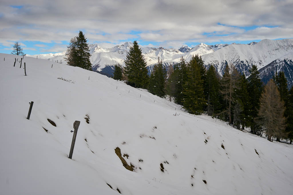 Archiv für die Kategorie ‘Schweiz’Der Schnee rund um Schmitten schmilzt aufgrund milder Temperaturen und Sonnenschein langsam, und im Dorf ist vom Winter kaum noch etwas zu sehen. Um dennoch in den Genuss einer echten Winterlandschaft zu kommen, steigen wir heute in die höheren Lagen auf. Zunächst wandern wir hinauf nach Acla: Ankunft bei Acla: Von Acla führt ein steiler Wanderweg direkt hinauf nach Zaplina: Bei Zaplina zeigt sich der Winter dann in voller Pracht, die Hänge sind tief verschneit: Von Zaplina aus queren wir hinüber zur Schmittner Alp: Wir haben zwar Schneeschuhe dabei, doch auch wenn wir hin und wieder einsinken, lässt sich der Weg noch gut ohne zusätzliche Ausrüstung bewältigen: Ankunft oberhalb der Schmittner Alp: Von hier sind es nur noch wenige Schritte hinauf zur Alp Afiein. Der Blick über die verschneiten Weiden der Alp: Anschließend laufen wir gemütlich über den Fahrweg hinunter zur Schmittner Alp: Hütten der Schmittner Alp: Von dort geht es weiter nach Pardela: Und schließlich laufen wir über den alten Pardelaweg zurück nach Schmitten. Mein Fazit: Toureninfos: