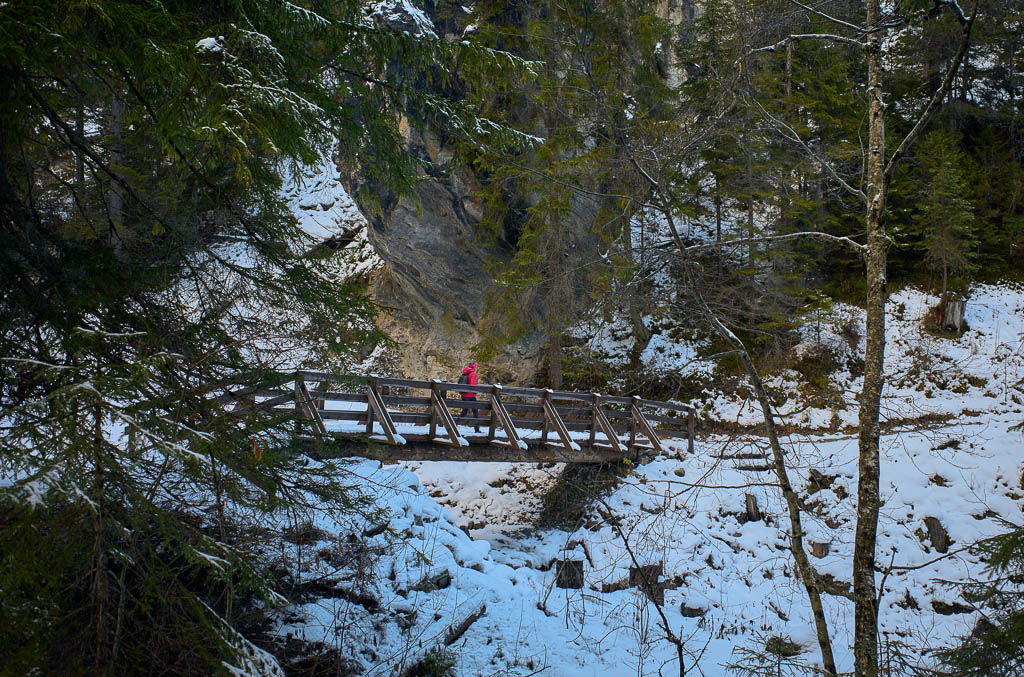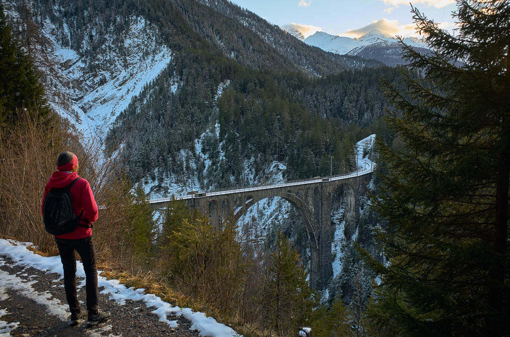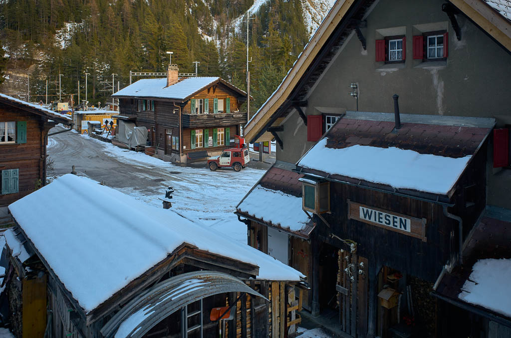 Ein Hauch von Winter liegt über Schmitten, als wir uns am späten Nachmittag auf den Weg zum Wiesner Bahnhof machen. Von einer Aussichtsbank am Ende des Dorfes blicken wir auf die Bergüner Stöcke: Von hier geht es leicht abwärts Richtung Schluocht: Eine Brücke führt über den Tieftobel: Von hier aus geht es kleines Stück des Weges steil bergauf, bevor der Weg weiter flach zum Wiesner Bahnhof führt: Immer wieder beindruckend ist der Blick aufs Wiesner Viadukt: Ankunft am Wiesner Bahnhof: Am Wiesner Bahnhof genießen wir einen letzten Blick auf die winterliche Szenerie, bevor die Rhätische Bahn heranrollt und uns nach Davos bringt. Es ist kalt geworden, und die Landschaft rund um Schmitten präsentiert sich nach leichten Schneefällen bereits in einem sanften Winterkleid. Wir genießen diese Stimmung während eines Spaziergangs über Acla und Pardela. Hier sind wir noch in der Dorfmitte unterhalb der Kirche; im Hintergrund thront der schneebedeckte Guggernellgrat: Auf dem Weg nach Acla: Kurz vor Acla folgen wir Fußspuren, die den offiziellen Weg verlassen. Neugierig schließen wir uns ihnen an: So entdecken wir einen uns bisher unbekannten Pfad, der an Acla vorbeiführt, schlussendlich aber doch wieder auf dem Fahrweg nach Acla mündet: Bei Grünwald: Auf dem Weg von Grünwald nach Pardela: Blick vom Wanderweg hinunter nach Filisur und auf Piz Ela und Tinzenhorn: Im Licht der Nachmittagssonne kehren wir über den alten Pardelaweg zurück nach Schmitten. Mein Fazit: Am Freitag ist das Skigebiet „Parsenn Davos“ in die Wintersaison gestartet, zwar nur fürs Wochenende, aber immerhin. Noch haben wir keine Lust, selbst auf die Skier zu steigen, doch das Zuschauen lassen wir uns nicht nehmen. Wir fahren mit der Parsennbahn hinauf zum Weissfluhjoch, drehen dort eine kleine Runde und werfen einen Blick auf die Pisten und über die verschneite Landschaft. Blick über die Totalp: Das Obersäsställi: Um uns herum wuseln die Skifahrer: Das Haupter Tälli: Blick hinauf zur Weissfluh: Die Bergstation des Parsenn Rapid: Blick über das Dorftälli, im Hintergrund ist das Dischmatal zu sehen: An die Minustemperaturen hier oben sind wir noch nicht wirklich gewöhnt, deshalb fahren wir bald wieder hinunter zum Höhenweg und laufen von dort aus nach Davos: Weglos über die zukünftige Talabfahrt: Immer wieder fährt die Parsennbahn an uns vorbei: Davos Dorf zu unseren Füßen: Über uns thront das Schiahorn: Weiter auf der Piste: Kurz darauf treffen wir auf einen schmalen Pfad, dem wir folgen: Unterwegs auf dem zur Büschalp führenden Fahrweg: Blick über den Schiatobel: Weiter Richtung Davos Platz: Nach rund fünf Kilometern erreichen wir den Bahnhof von Davos Platz und treten kurze Zeit später mit dem Postbus die Heimreise an. Mein Fazit: Ein feuchtkalter Herbsttag in Davos: Im Tal fällt Regen, nur wenige hundert Höhenmeter höher verwandelt sich das Grau bereits in Schnee. Im Zentrum ist es still, kaum jemand ist unterwegs, es ist Nebensaison. Diese sieben Schwarzweißaufnahmen fangen die Stimmung des Tages ein: Auch ein grauer Novembertag hat seine Schönheit, leise, unscheinbar und doch berührend. PS: Die Aufnahmen entstanden mit der Nikon FM2n und einem 35-mm-Objektiv auf AgfaPan 400, entwickelt in Diafine. |