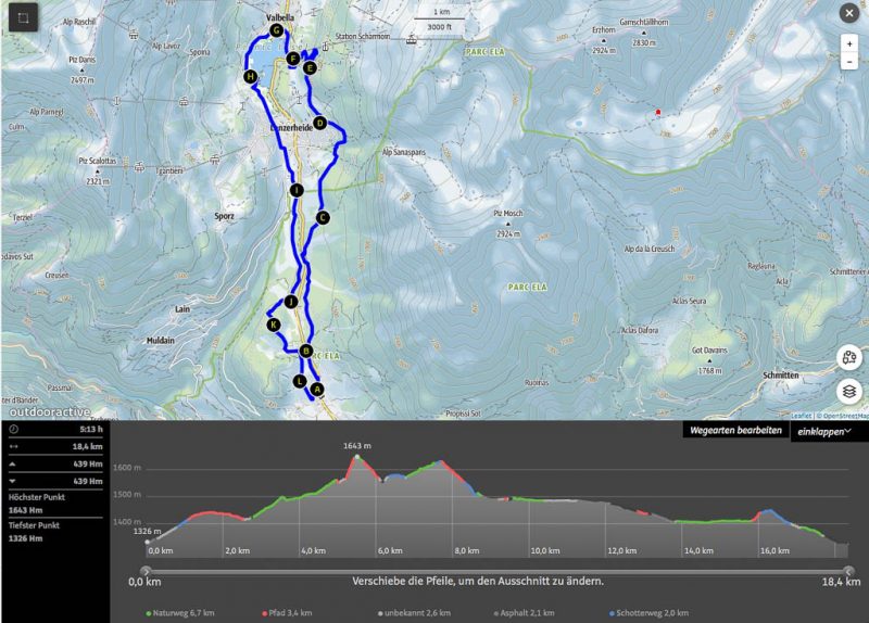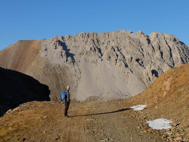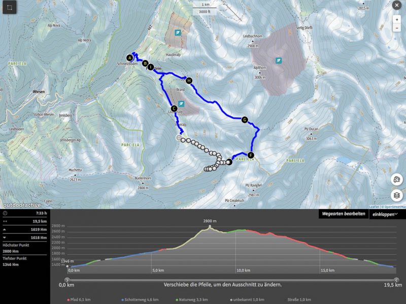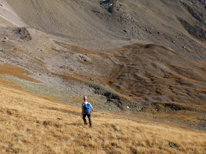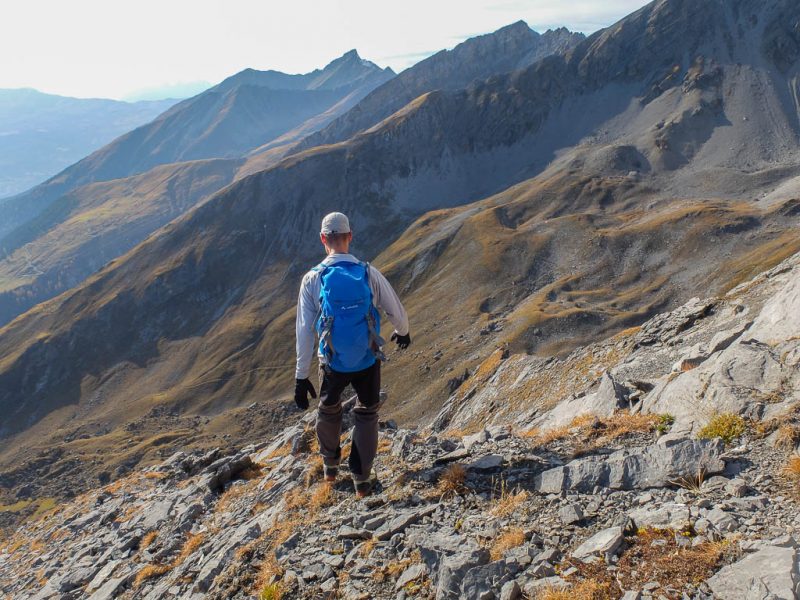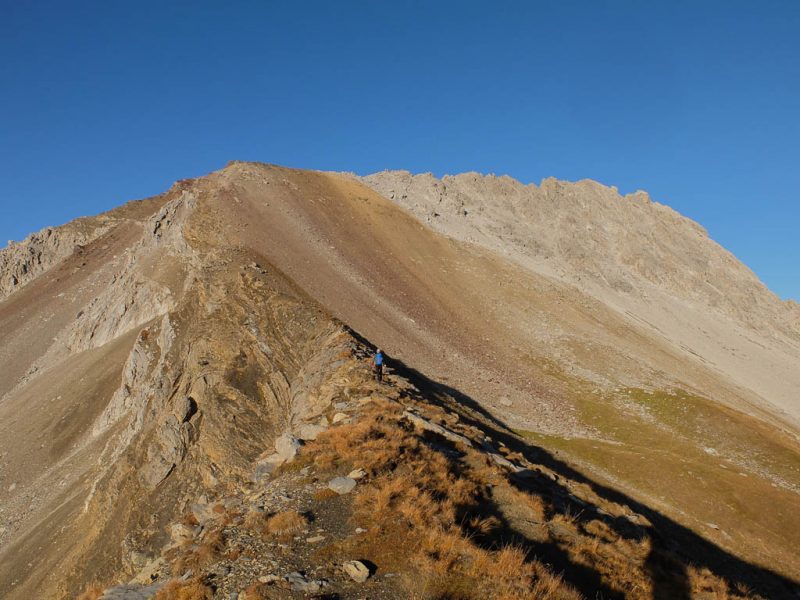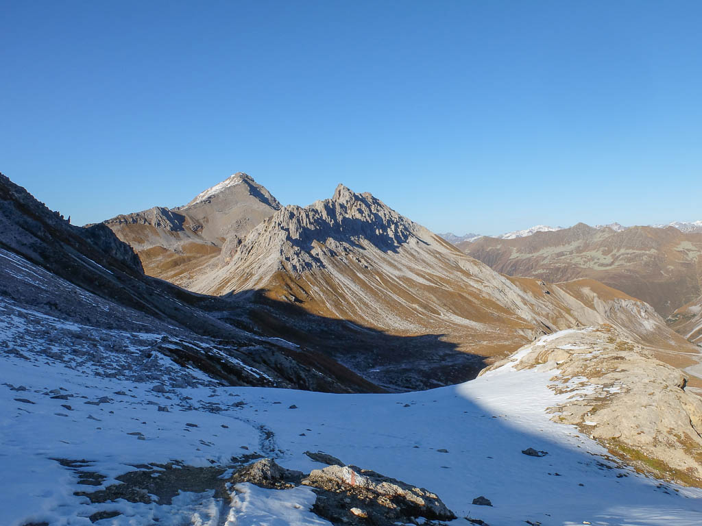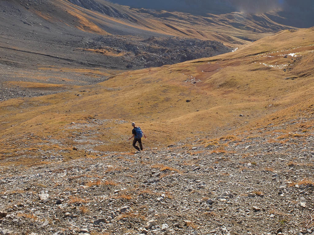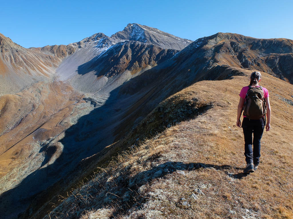 Außerdem klettern wir nicht die Geröllrinne ab, sondern folgen dem Nordwestgrat etwas weiter nach unten, bevor wir ihn verlassen. Auf diesem Weg kommt man sicherlich auch leichter noch oben als durch die Rinne. Anschließend queren wir erneut das Gipsfeld und kehren bis zur Mäschenfurgga zurück. Hier steigen wir dann aber nicht durch das Tälchen nach Mäschenboden ab, sondern wandern über Ducanfurgga, Fanezfurgga, Fanezmeder und Oberalp zurück nach Monstein. Auf dem Wanderweg zur Ducanfurgga, vor uns liegt das Chrachenhorn:
