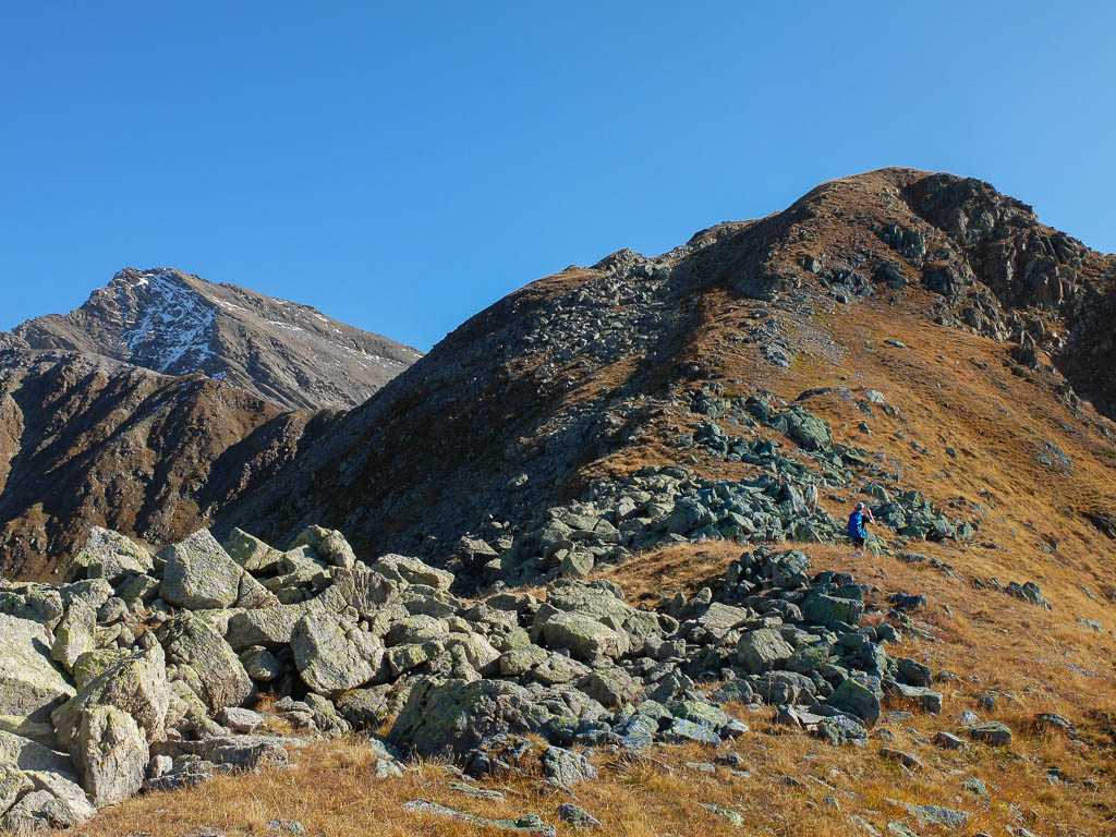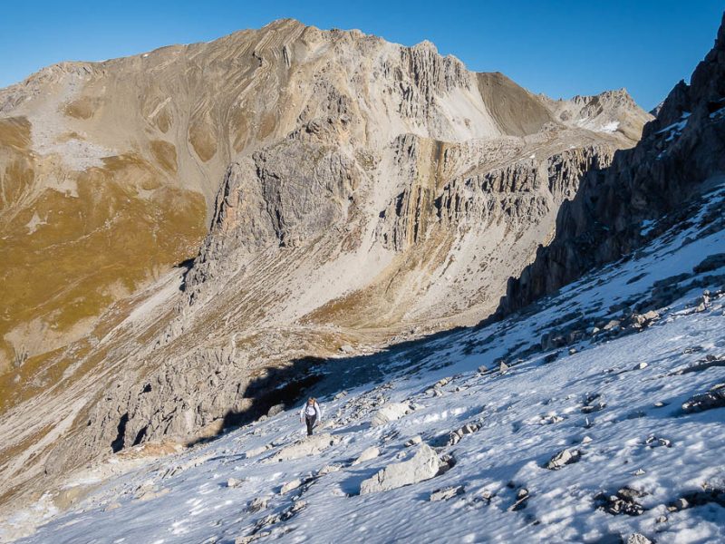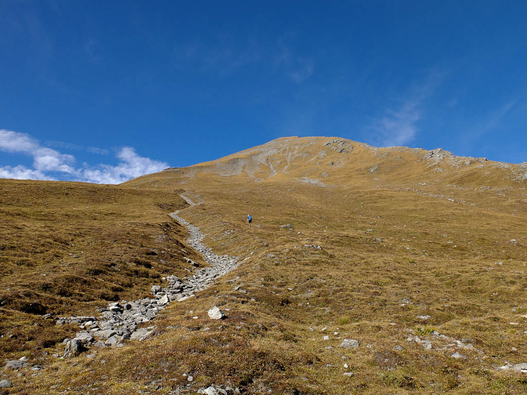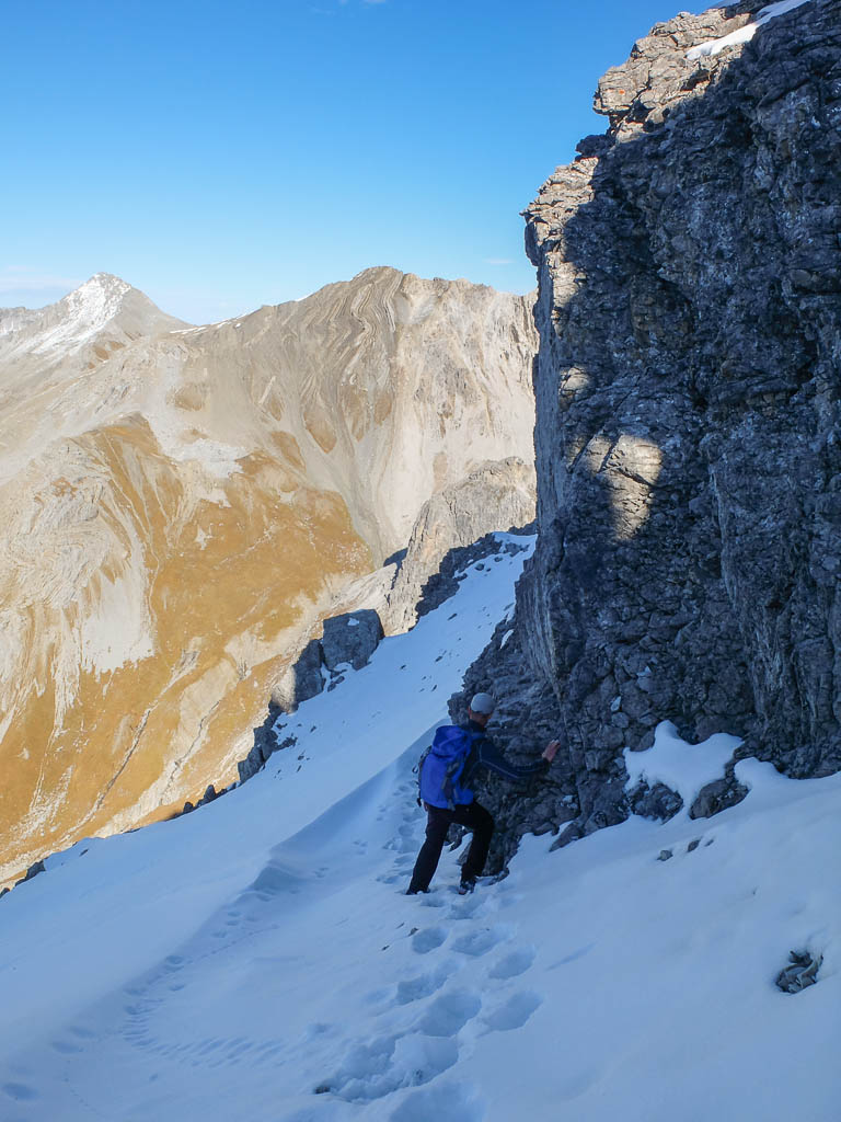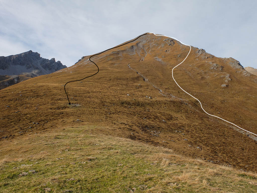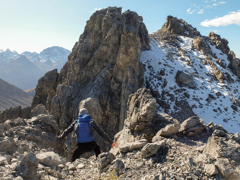 Das Chrummhüreli lassen wir weiter oben links liegen und steigen über Fels Richtung Mäschenfurgga, einem Übergang zwischen Monstein und Val da Stugl, auf. Hier stehen wir kurz unterhalb der Mäschenfurgga und blicken auf den weiteren Aufstiegsweg zum Gipfel des Gipshorns (rechts im Bild):