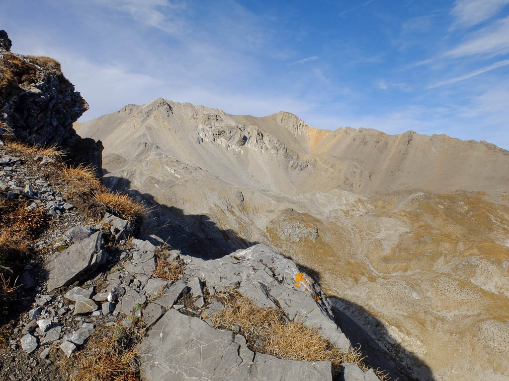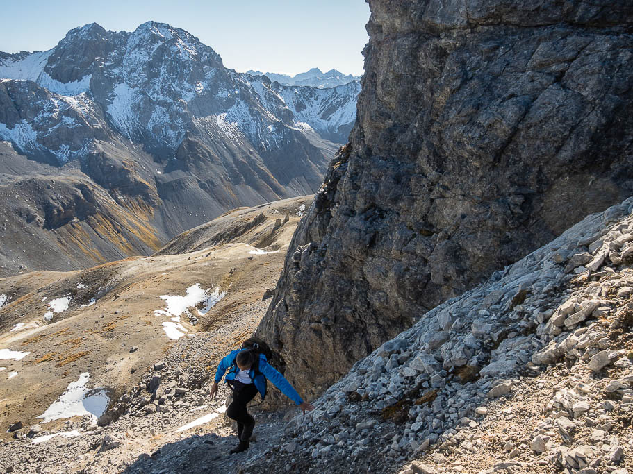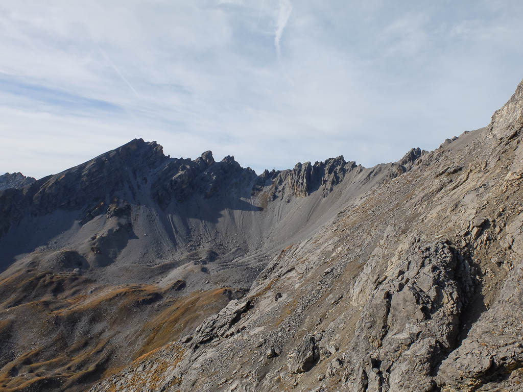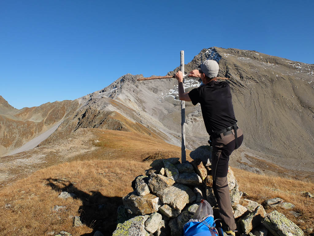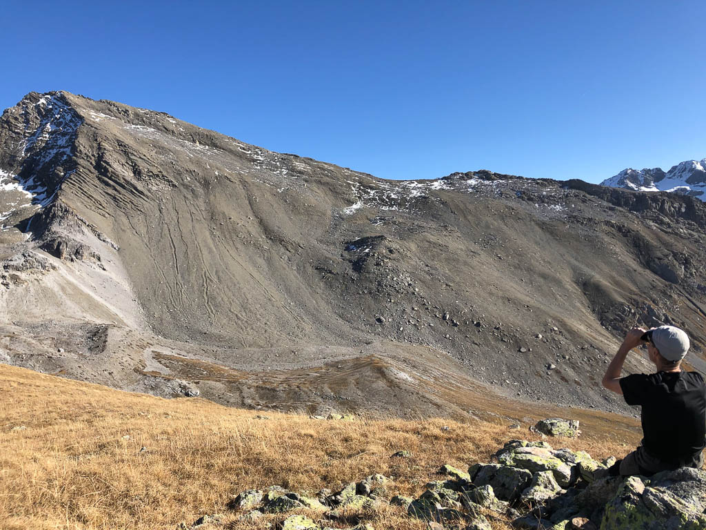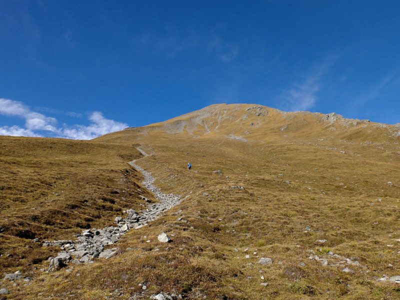 Das Chrummhüreli lassen wir weiter oben links liegen und steigen über Fels Richtung Mäschenfurgga, einem Übergang zwischen Monstein und Val da Stugl, auf. Hier stehen wir kurz unterhalb der Mäschenfurgga und blicken auf den weiteren Aufstiegsweg zum Gipfel des Gipshorns (rechts im Bild):