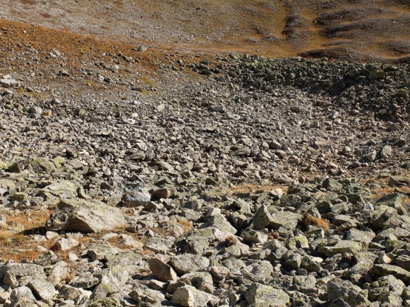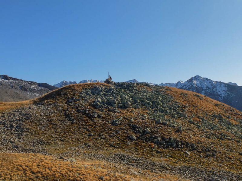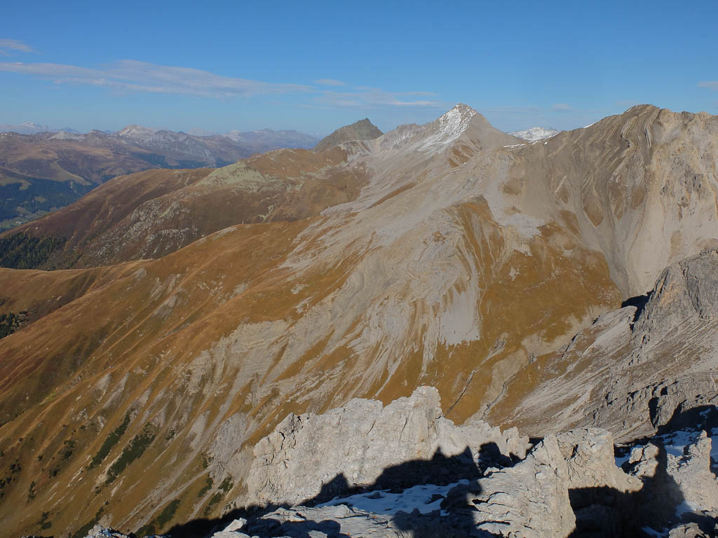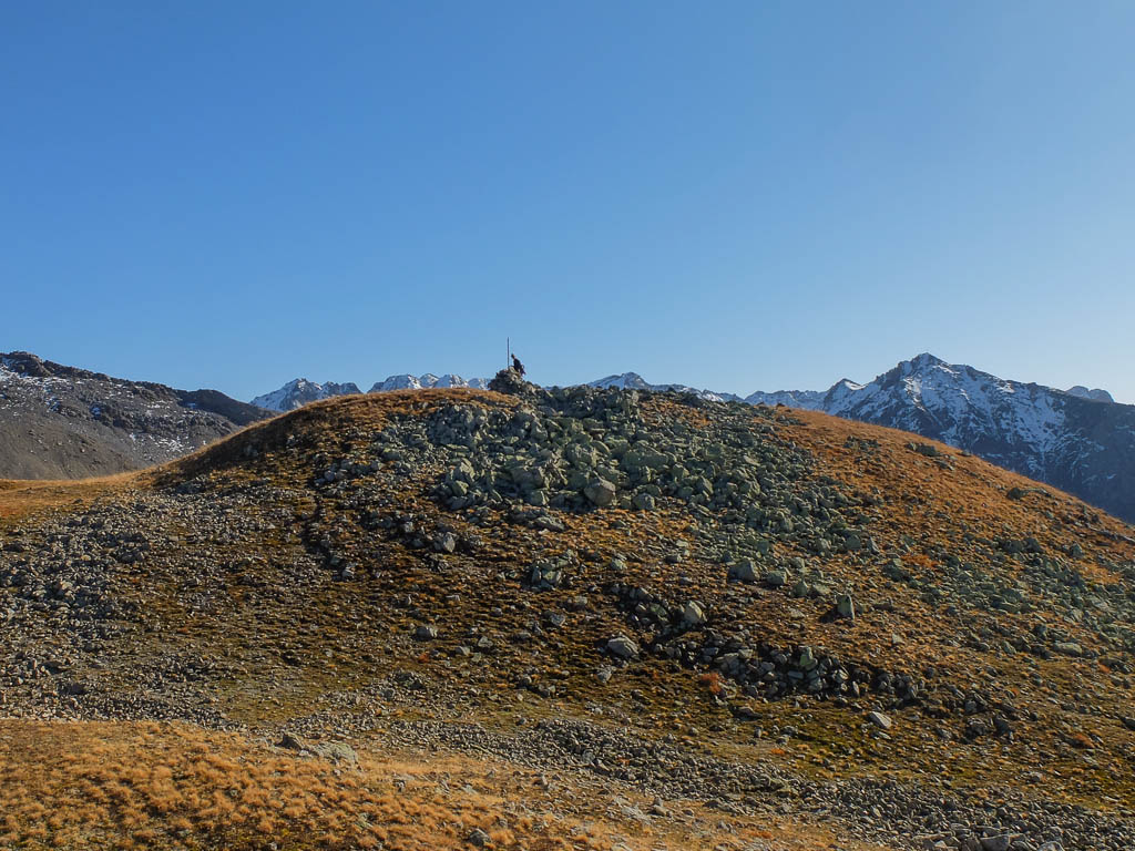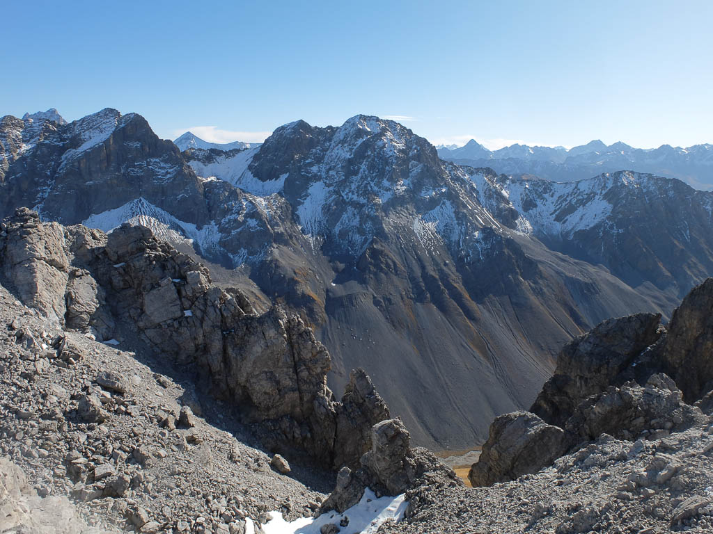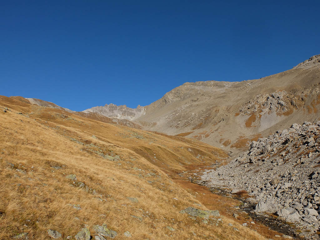 Das Chrummhüreli lassen wir weiter oben links liegen und steigen über Fels Richtung Mäschenfurgga, einem Übergang zwischen Monstein und Val da Stugl, auf. Hier stehen wir kurz unterhalb der Mäschenfurgga und blicken auf den weiteren Aufstiegsweg zum Gipfel des Gipshorns (rechts im Bild):