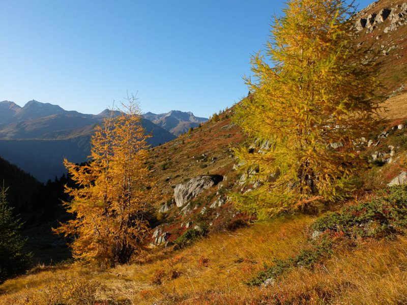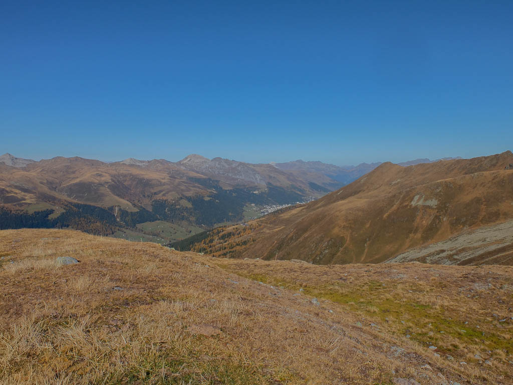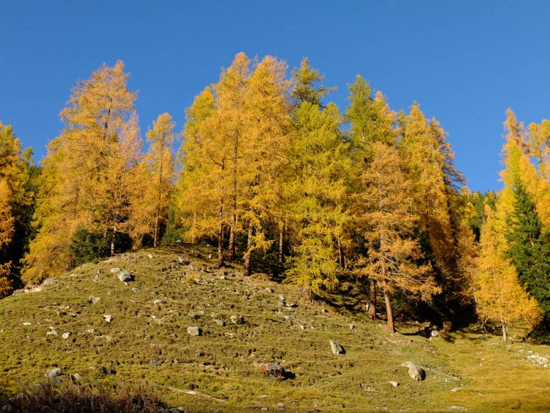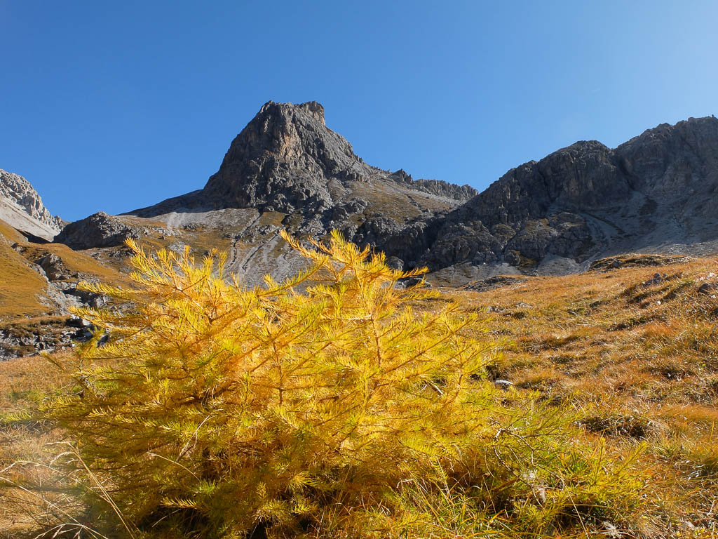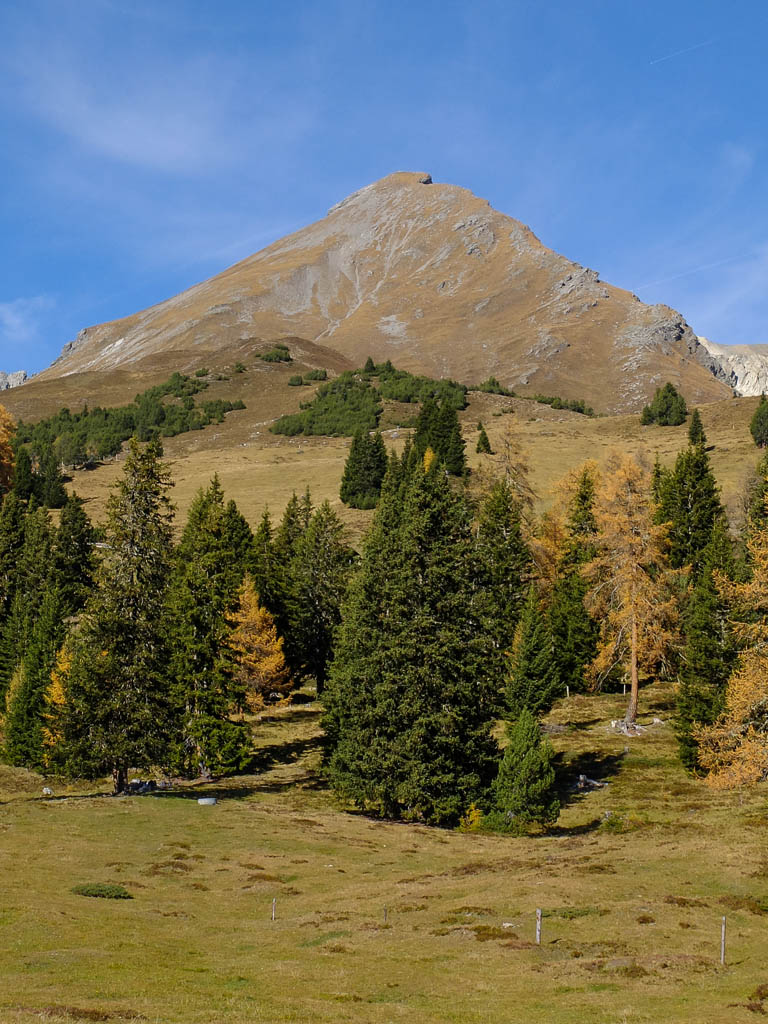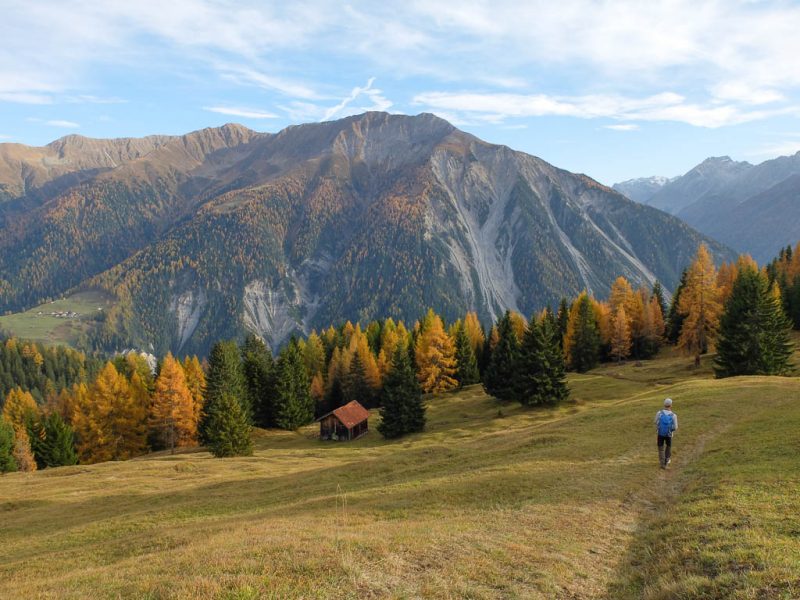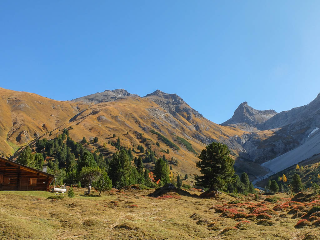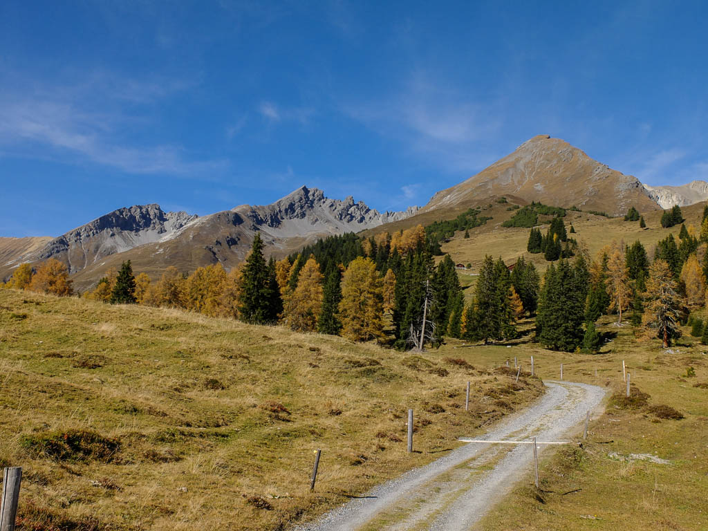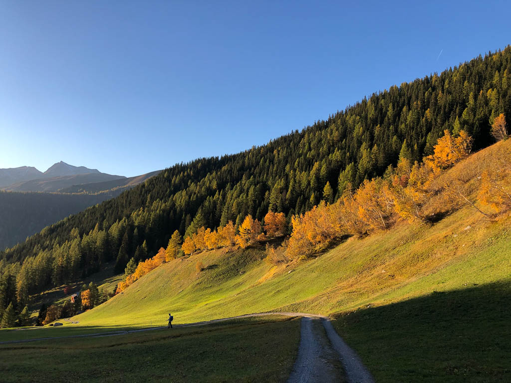 Nach der imposanten, weißgrauen Felsenlandschaft rund ums Gipshorn begrüßt uns auf dem Weg hinunter von Fanezmeder nach Monstein der goldene Herbst der Bündner Berge: