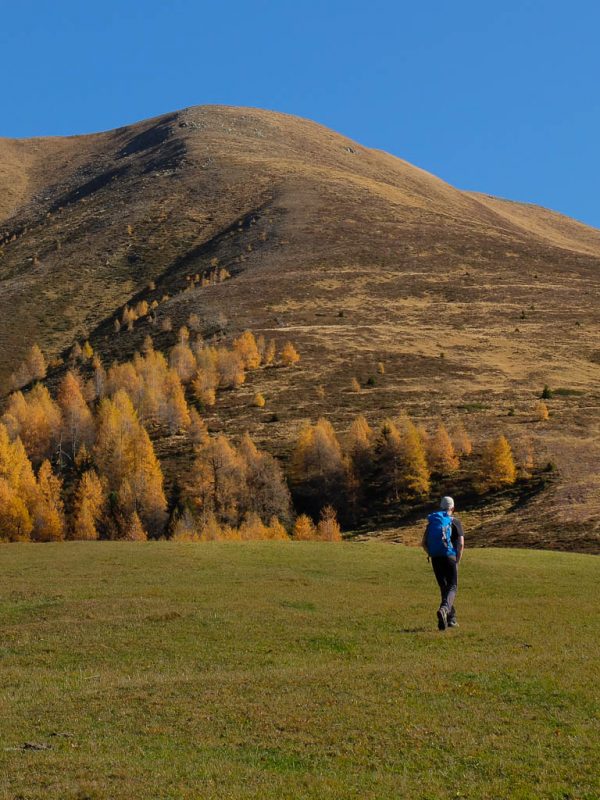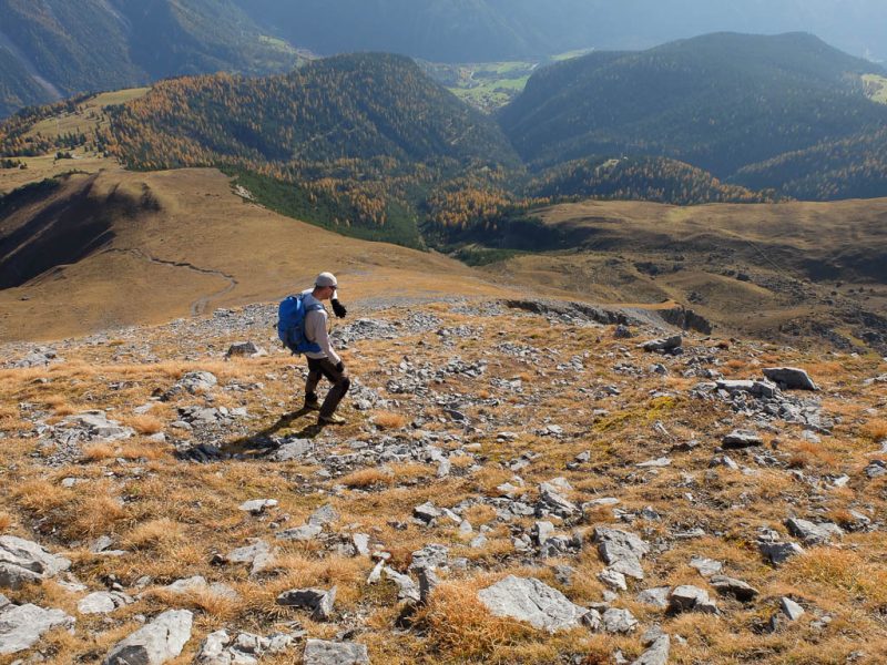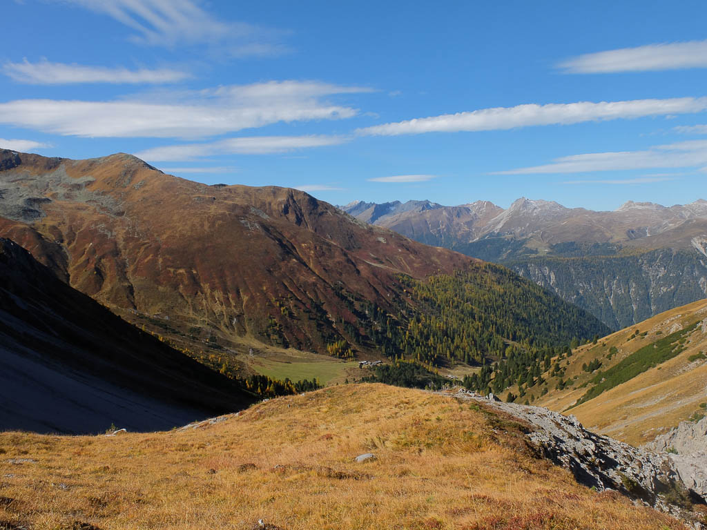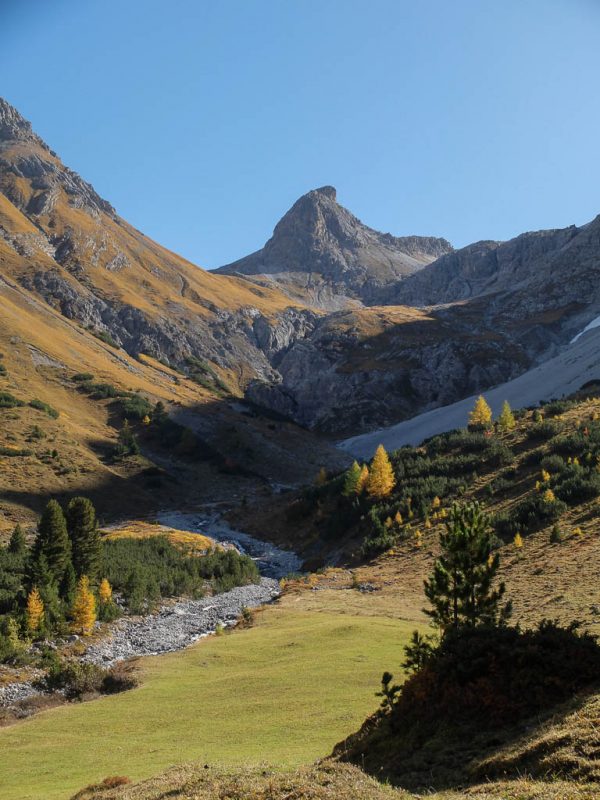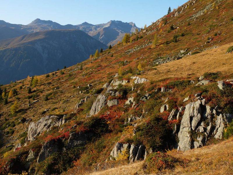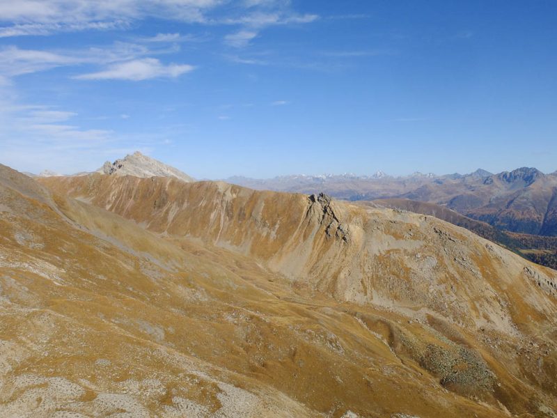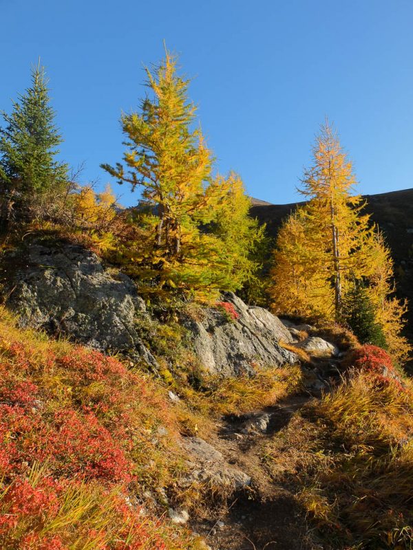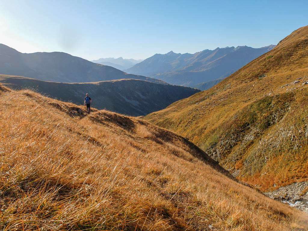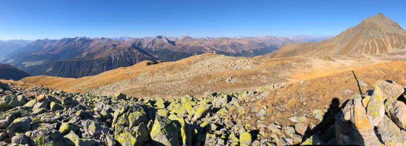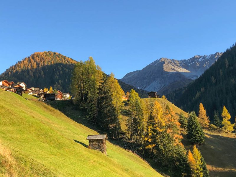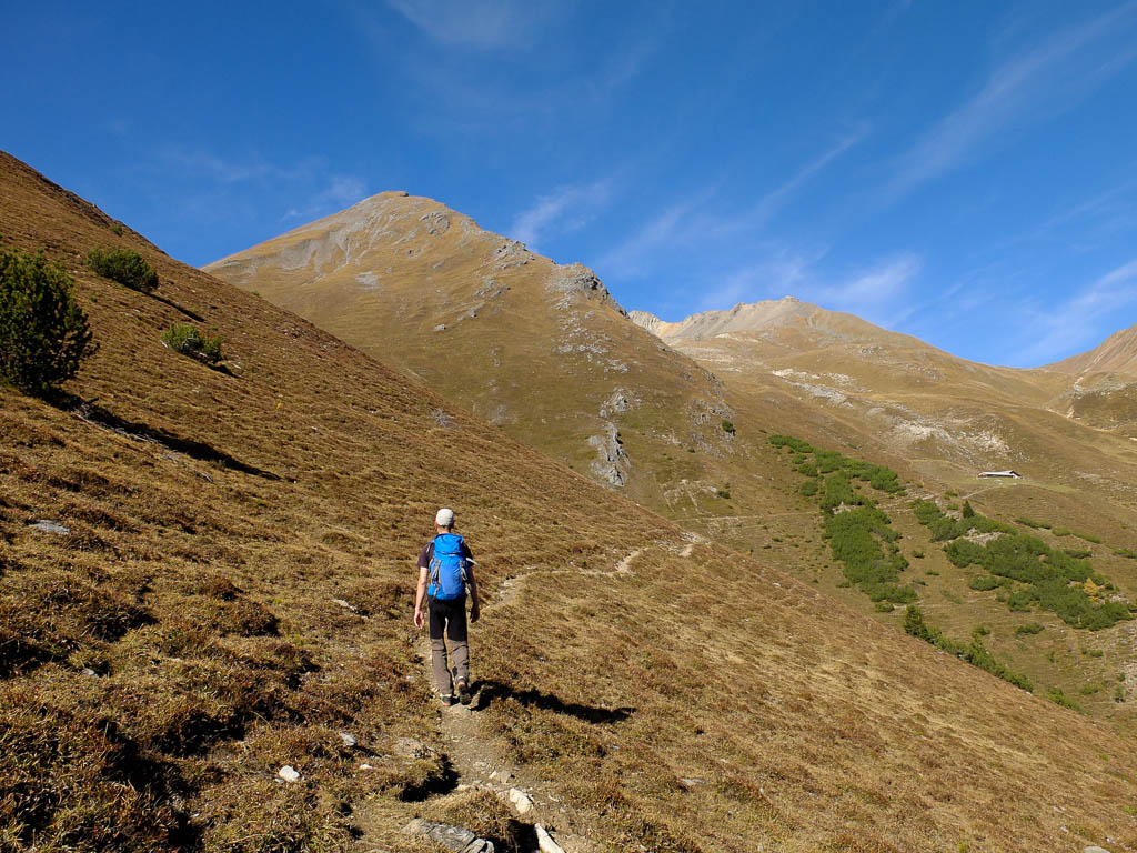 Nach der imposanten, weißgrauen Felsenlandschaft rund ums Gipshorn begrüßt uns auf dem Weg hinunter von Fanezmeder nach Monstein der goldene Herbst der Bündner Berge:
