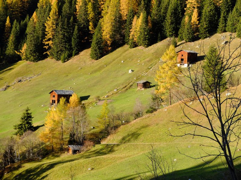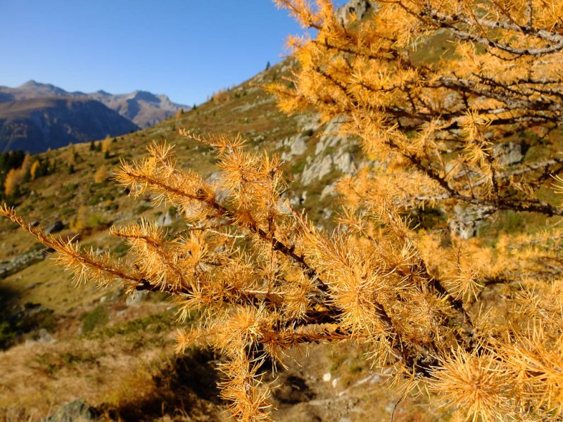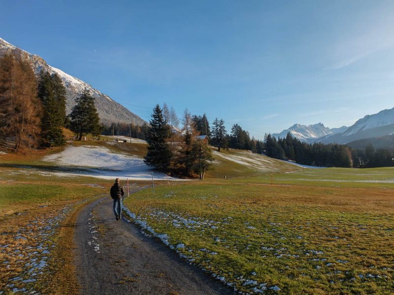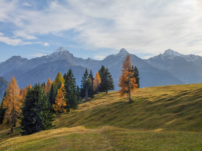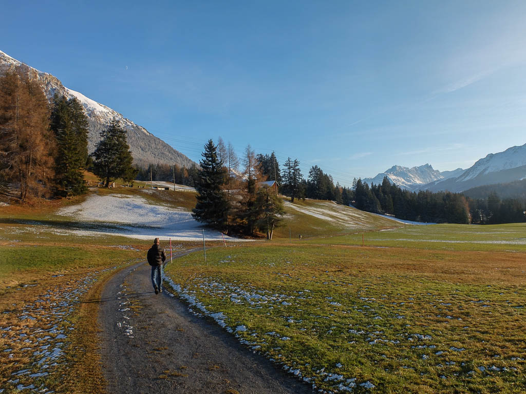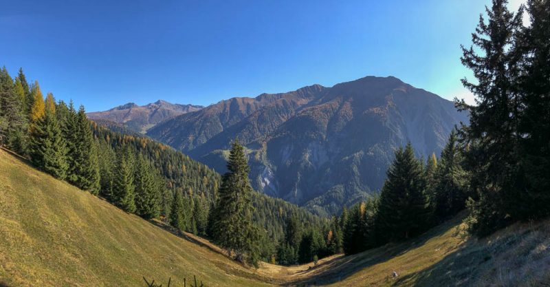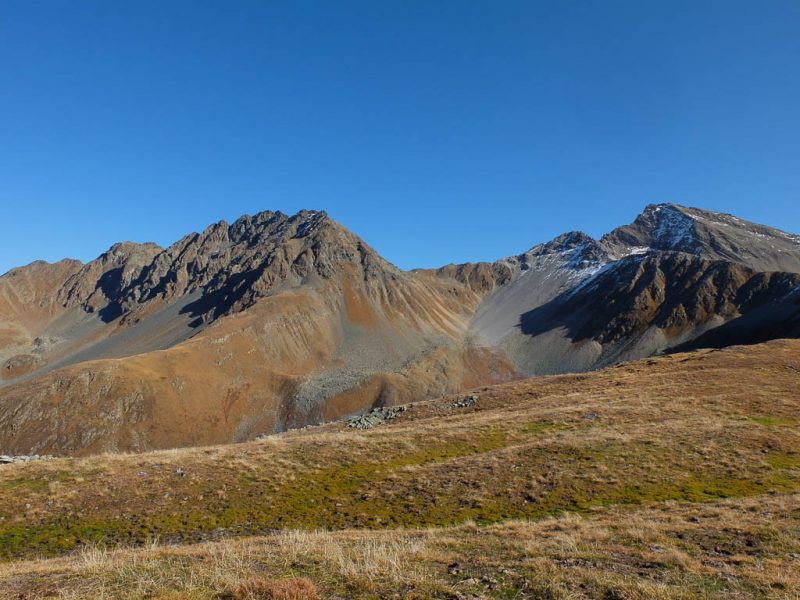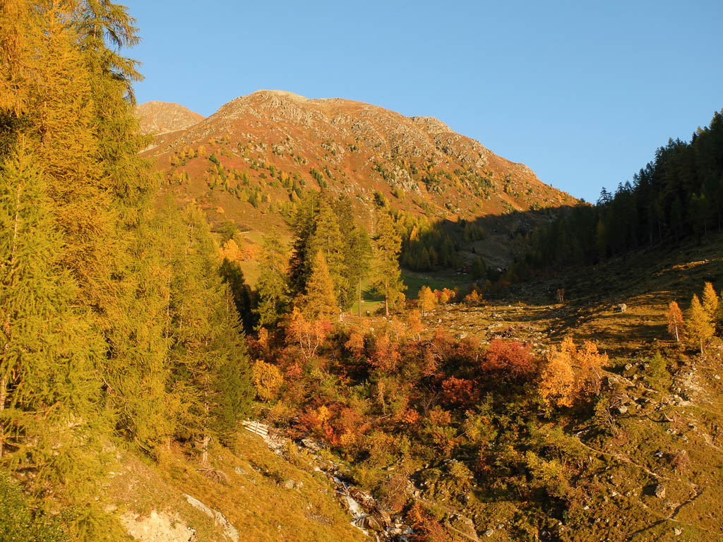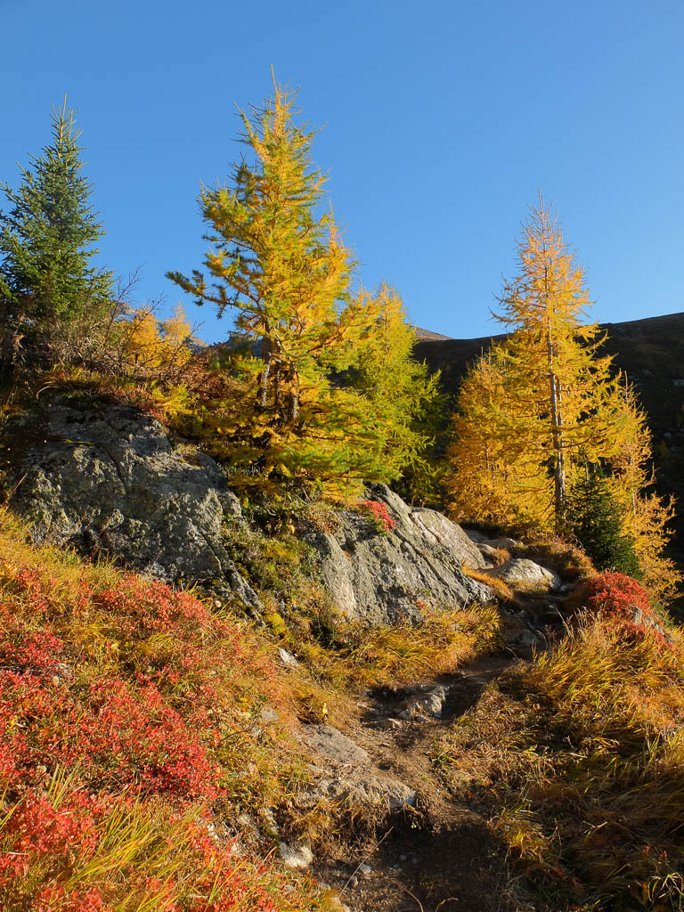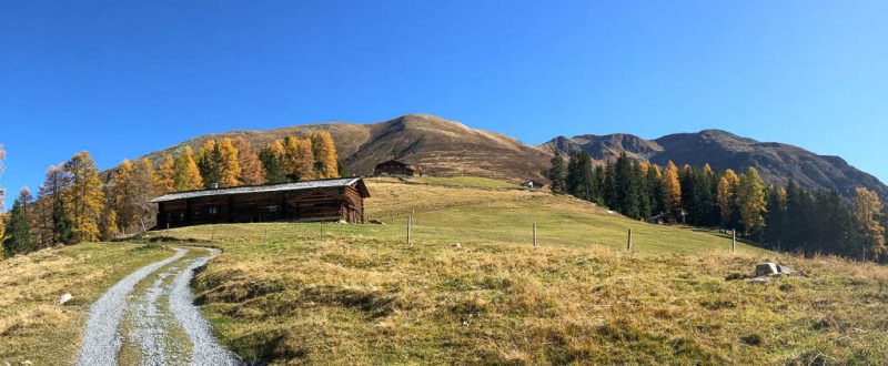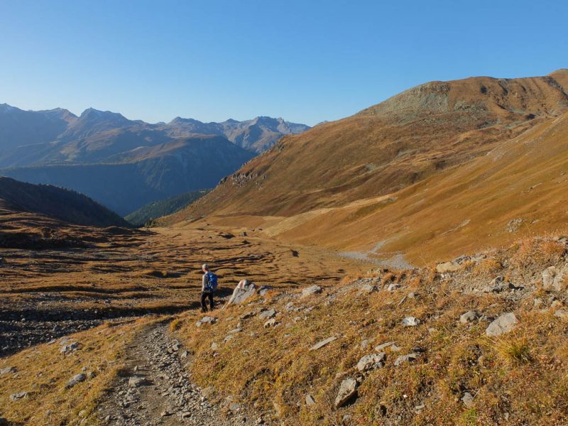 Nach der imposanten, weißgrauen Felsenlandschaft rund ums Gipshorn begrüßt uns auf dem Weg hinunter von Fanezmeder nach Monstein der goldene Herbst der Bündner Berge: