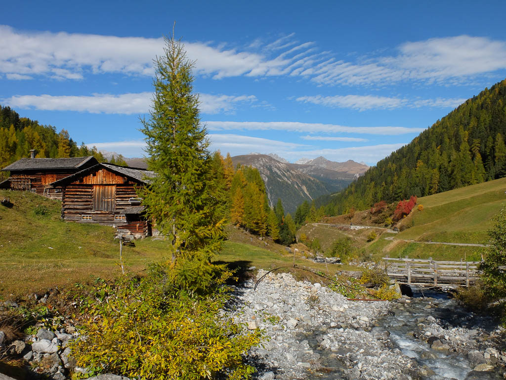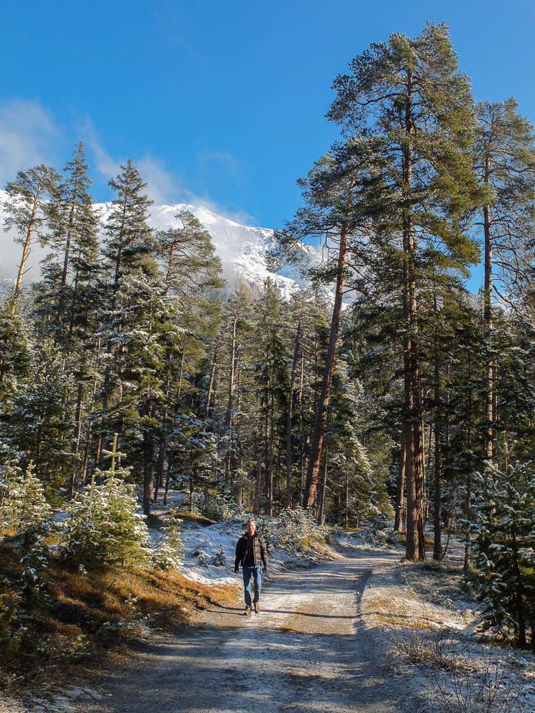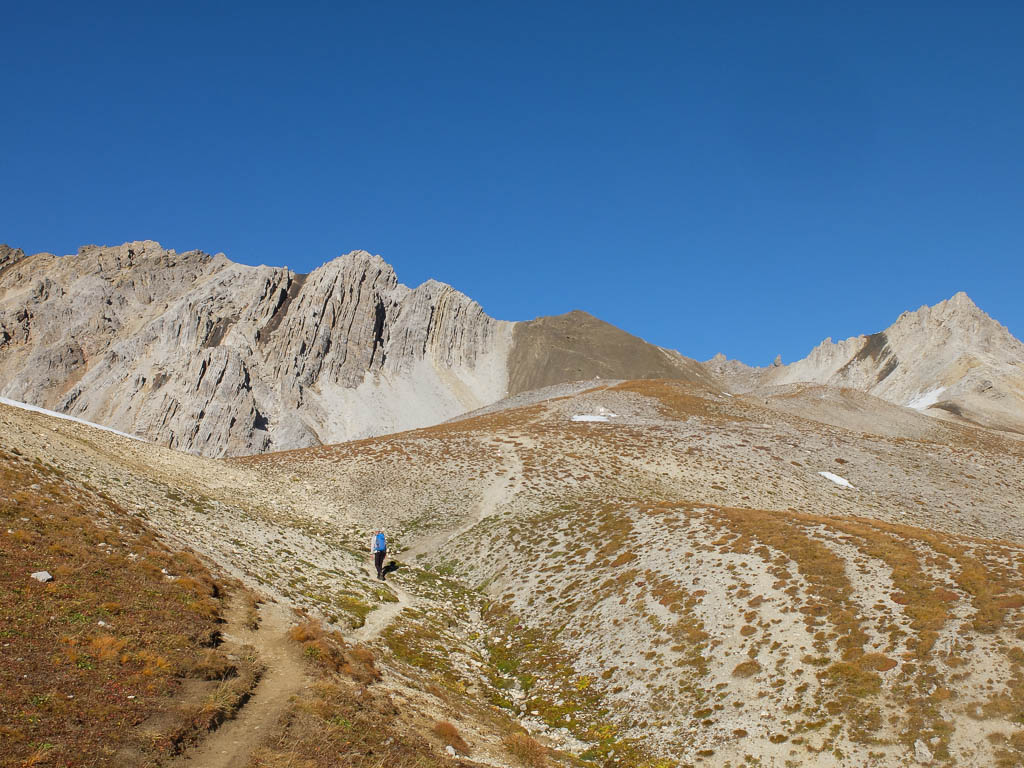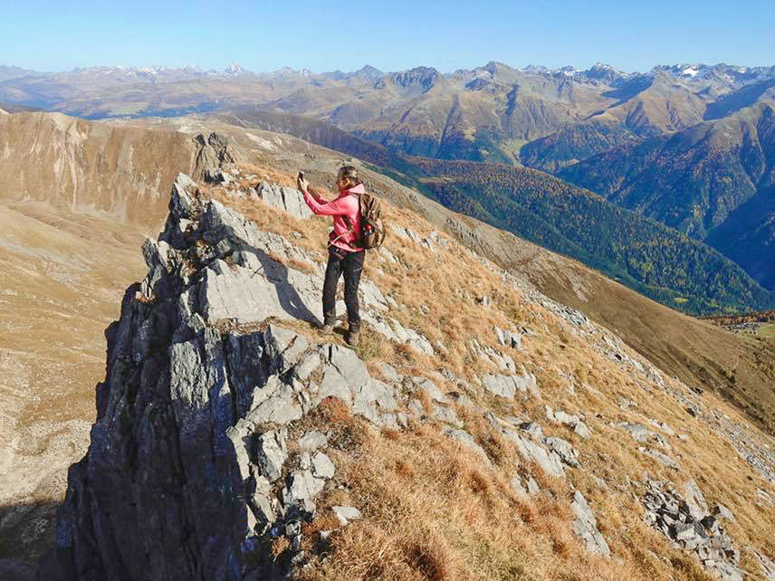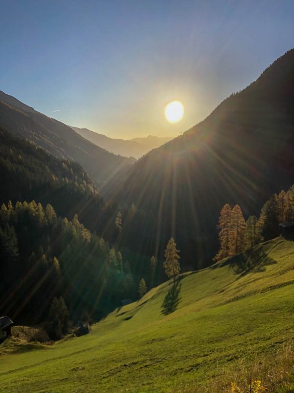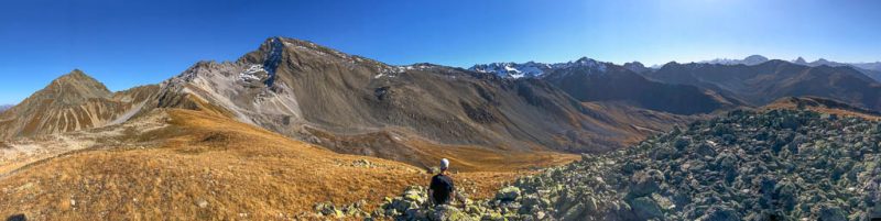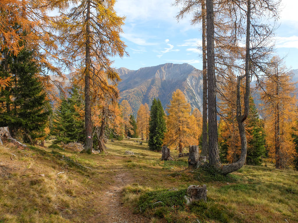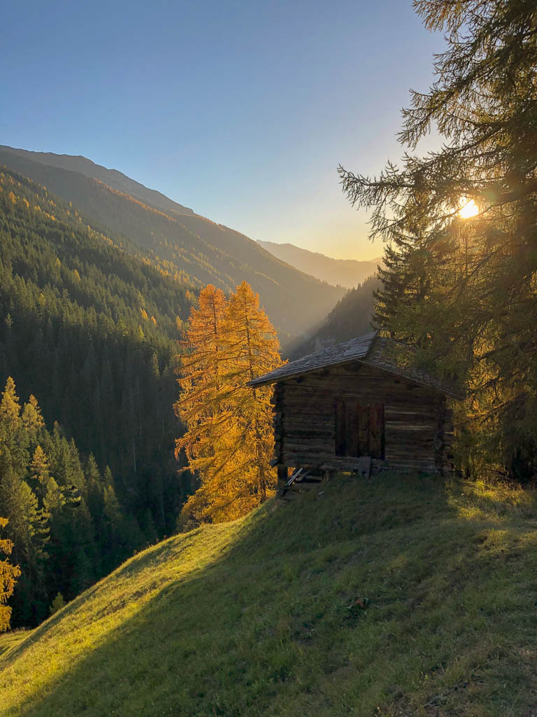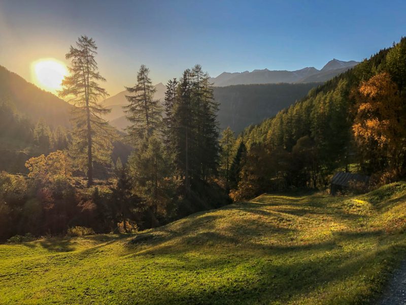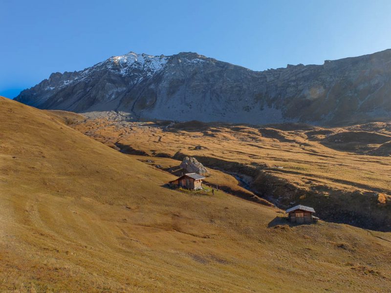 Nach der imposanten, weißgrauen Felsenlandschaft rund ums Gipshorn begrüßt uns auf dem Weg hinunter von Fanezmeder nach Monstein der goldene Herbst der Bündner Berge: