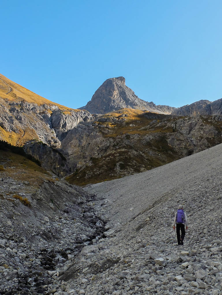 Da das Gelände steil und das Geröll klein ist, ist dieser Streckenabschnitt für mich sehr anstrengend. Vielleicht wäre der Aufstieg über die andere, grasige Bachseite doch einfacher gewesen. Am Ende des Geröllfeldes treffen wir dann tatsächlich auf Pfadspuren, die vom anderen Ufer kommen und denen wir jetzt weiter folgen. Ab und zu markieren auch Steinmänner den Weg. Der Blick zurück auf die Alpsiedlung Mäschenboden, der Bergzug links im Bild ist das Büelenhorn: