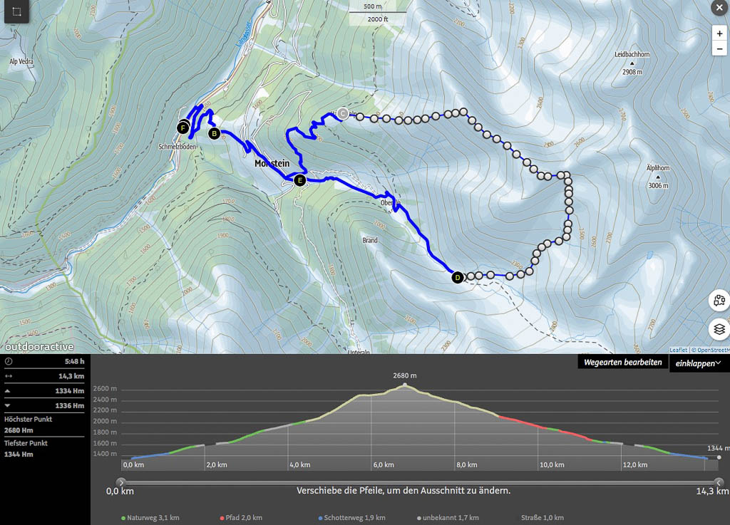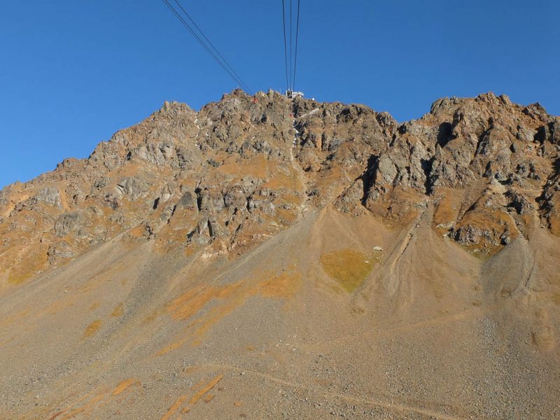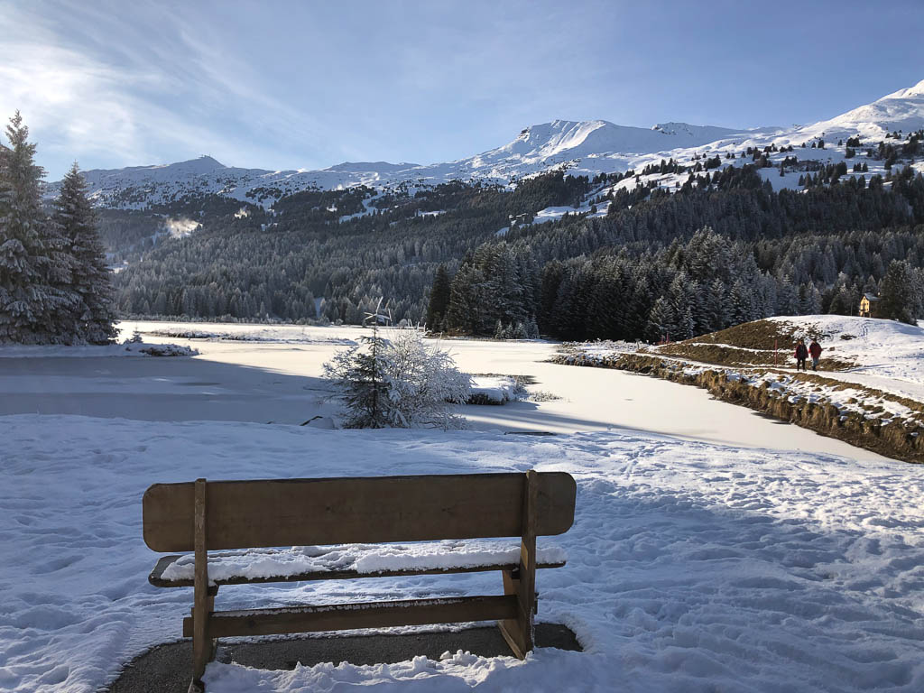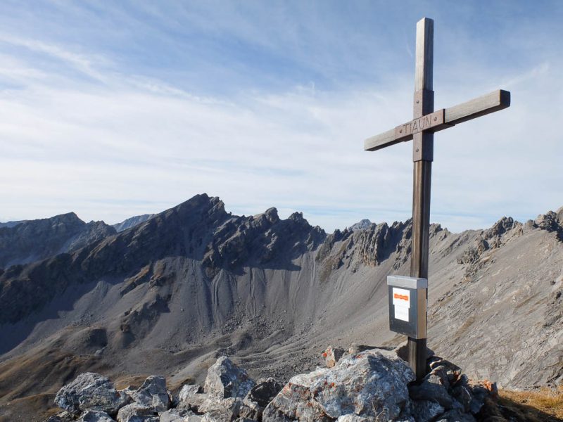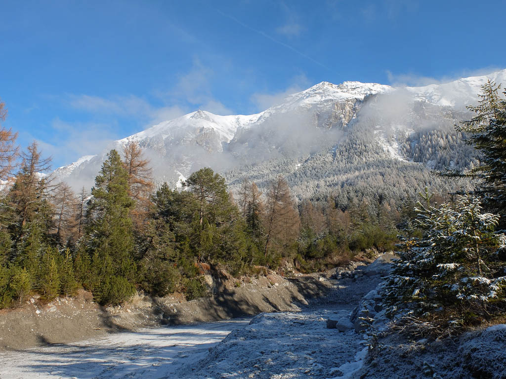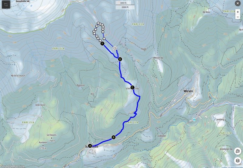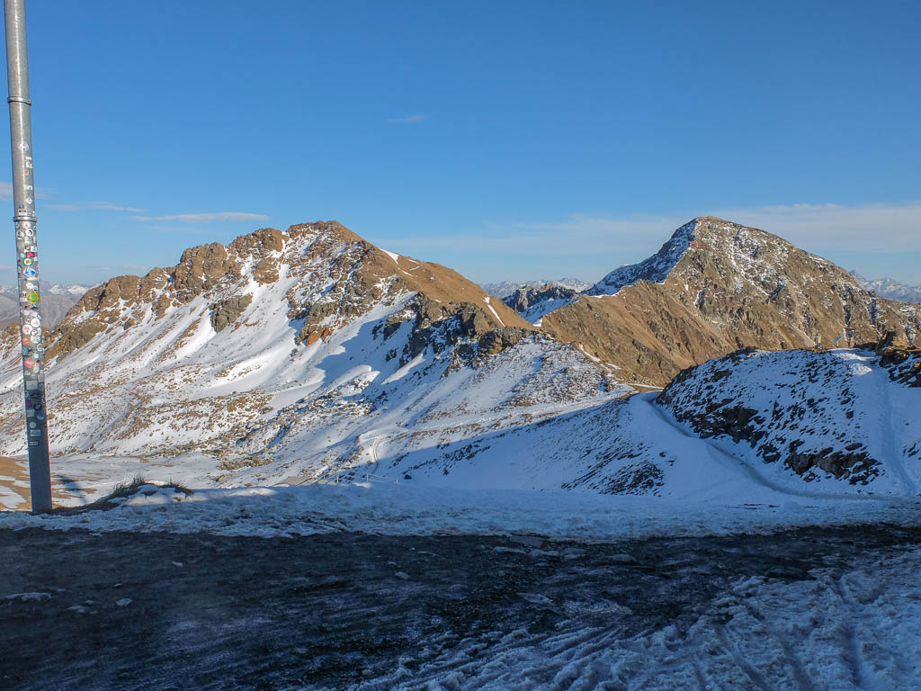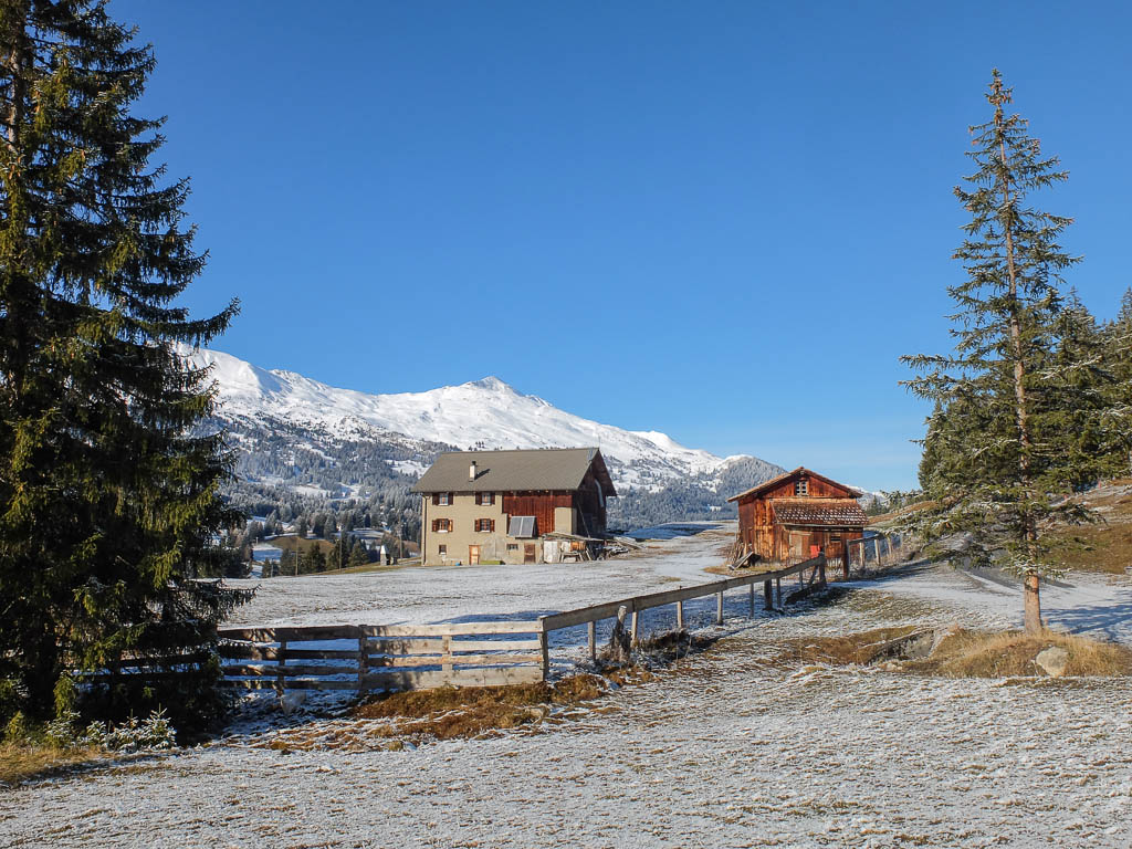 Der Pfeil zeigt auf das namensgebende Gipsfeld. Das Gipshorn ist laut SAC-Führer „Bündner Alpen 6“ über zwei Routen zu erreichen: Zum einen über den Nordostgrat, zum anderen über den Nidellöffel. Welche Route wir nehmen, wollen wir erst im Laufe der Wanderung entscheiden. Start der Tour ist wieder einmal der Bahnhof von Monstein. Von dort aus wandern wir über Monstein und Inneralp hinauf zur Alpsiedlung Mäschenboden. Der Blick von Mäschenboden talwärts: