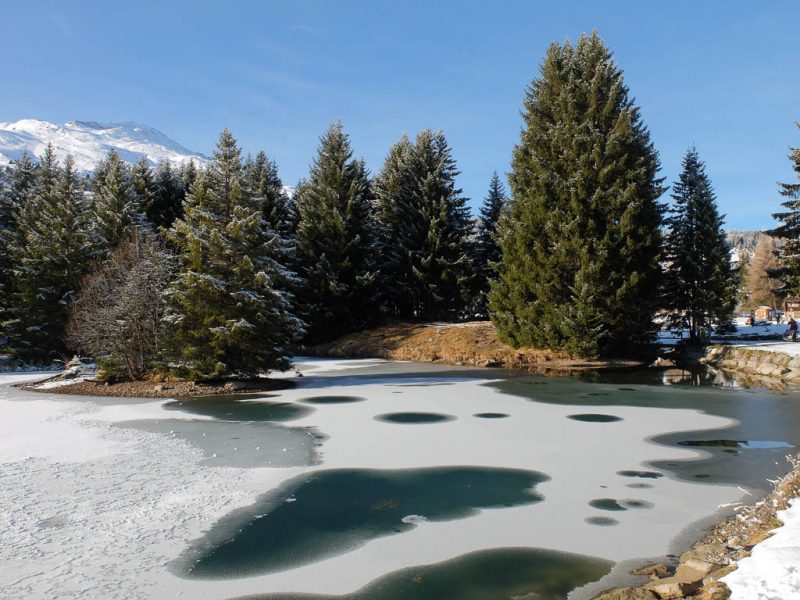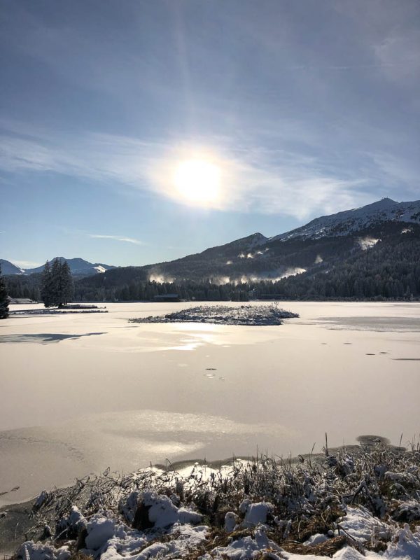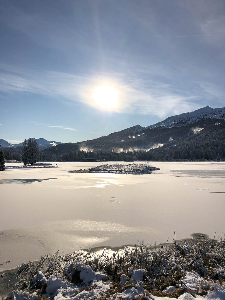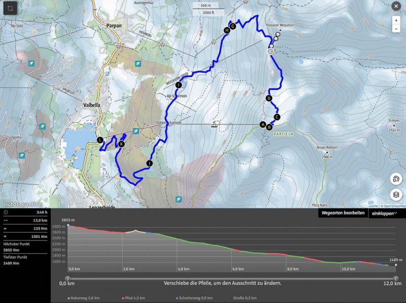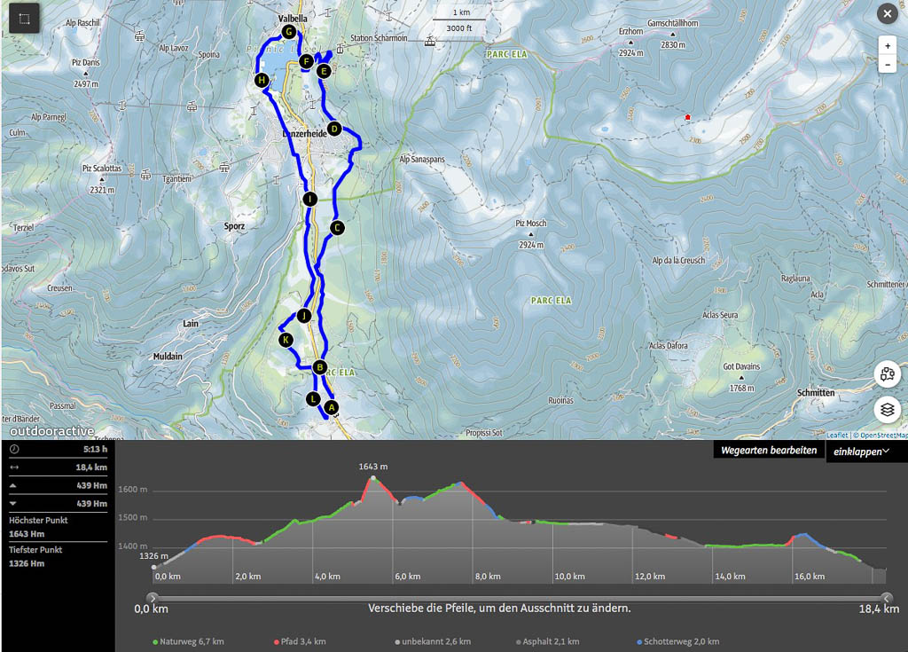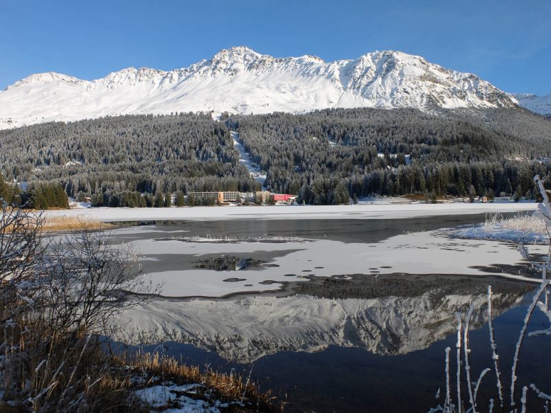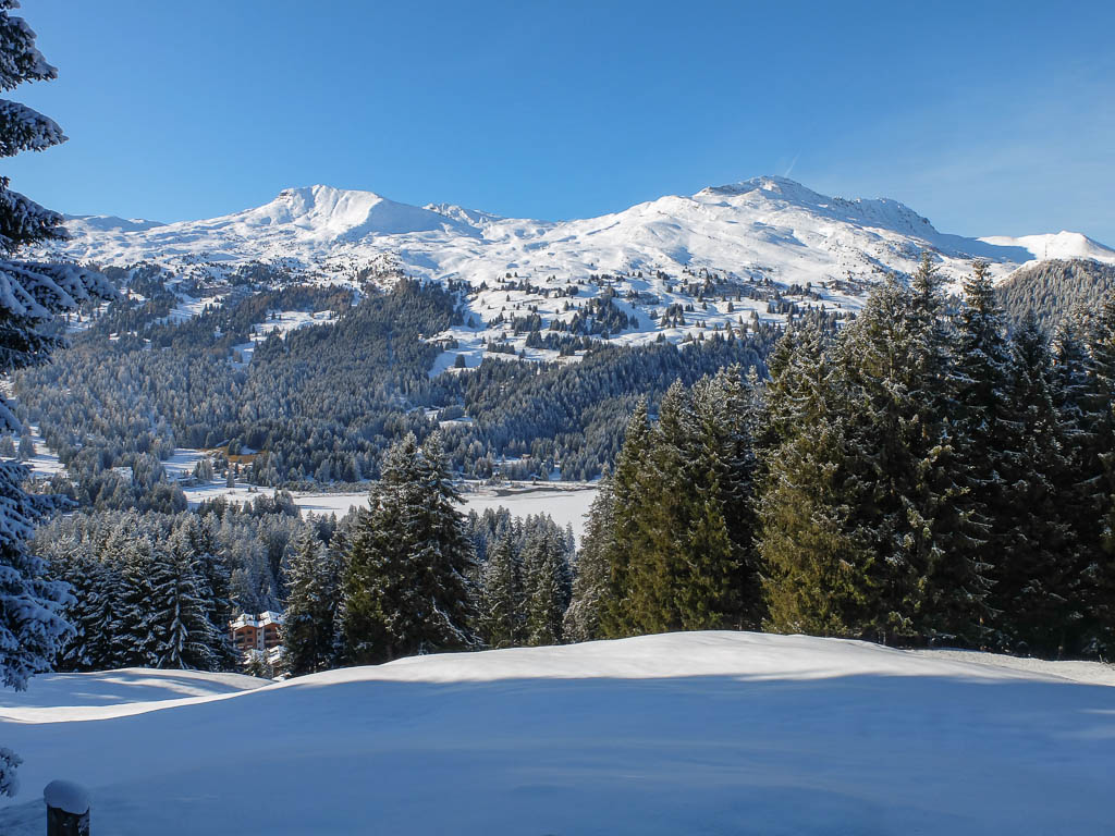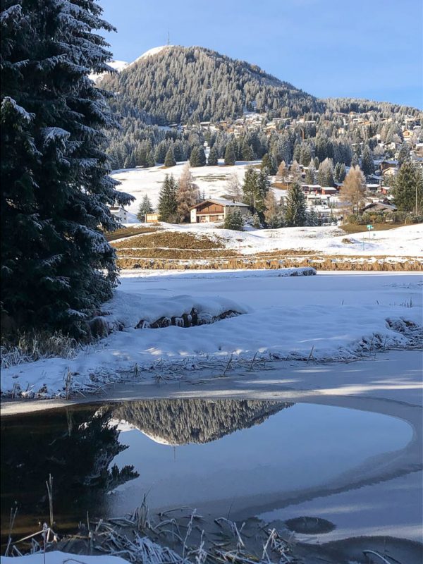 Der Pfeil zeigt auf das namensgebende Gipsfeld. Das Gipshorn ist laut SAC-Führer „Bündner Alpen 6“ über zwei Routen zu erreichen: Zum einen über den Nordostgrat, zum anderen über den Nidellöffel. Welche Route wir nehmen, wollen wir erst im Laufe der Wanderung entscheiden. Start der Tour ist wieder einmal der Bahnhof von Monstein. Von dort aus wandern wir über Monstein und Inneralp hinauf zur Alpsiedlung Mäschenboden. Der Blick von Mäschenboden talwärts: