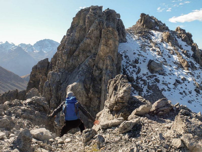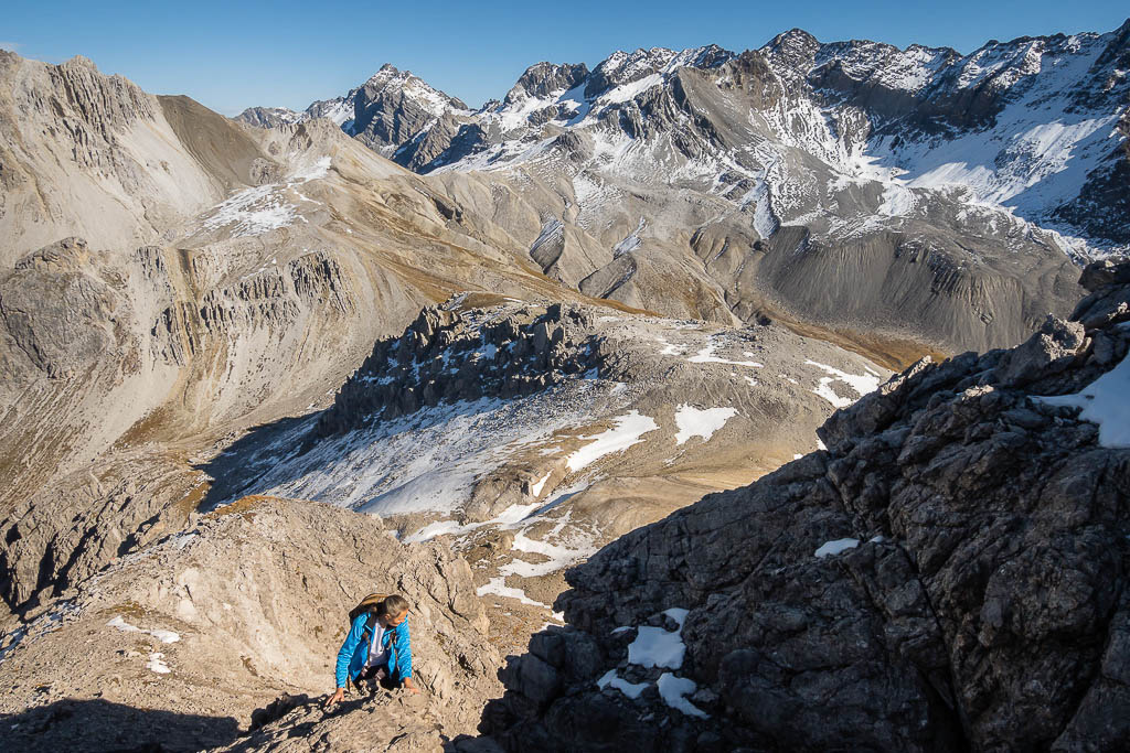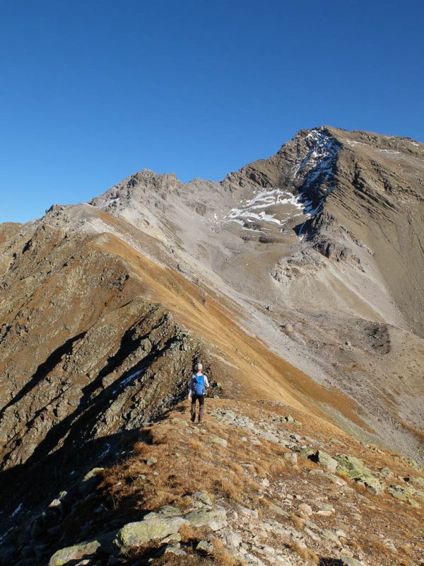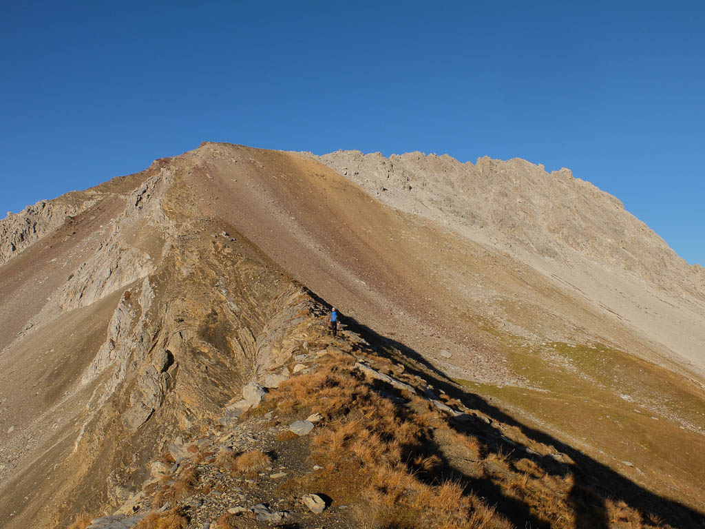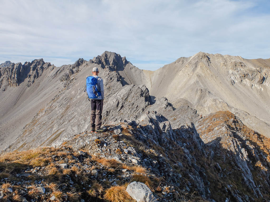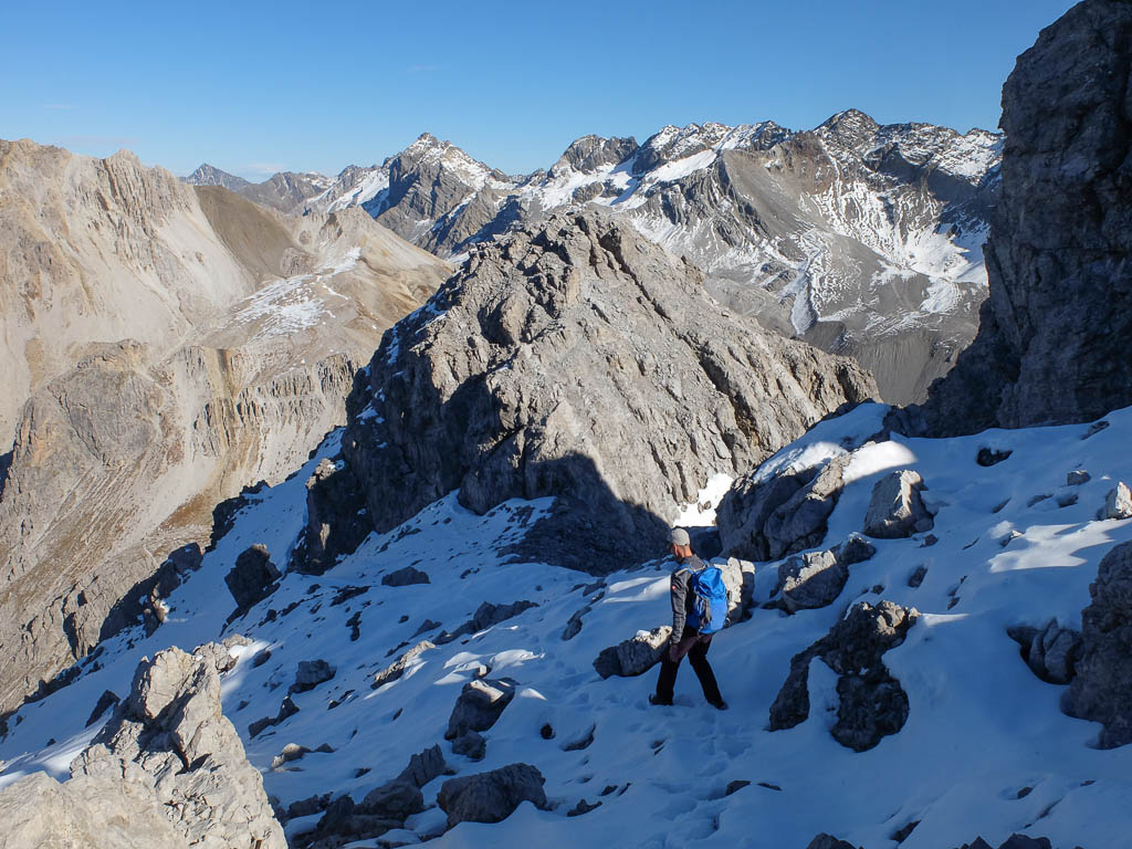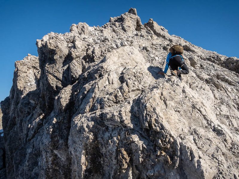 Nach einer kurzen Gipfelrast geht es auf etwa gleichem Weg zurück. Die hier vor uns liegende Erhebung auf dem Grat umgehen wir, statt sie wie auf dem Aufstieg zu überklettern: