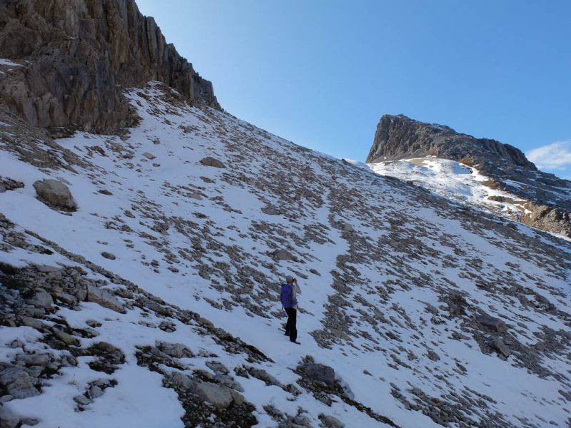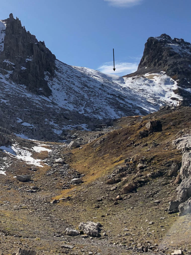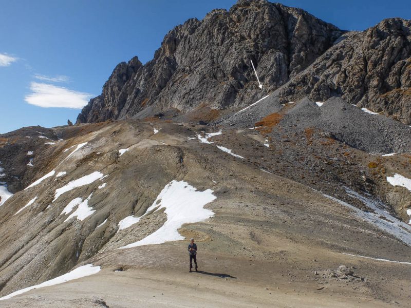 Der schwarze Pfeil markiert die Lage des Gipsfeldes, unserem nächsten Etappenziel. Der schattige Aufstieg über Fels und Schnee zum Gipsfeld: