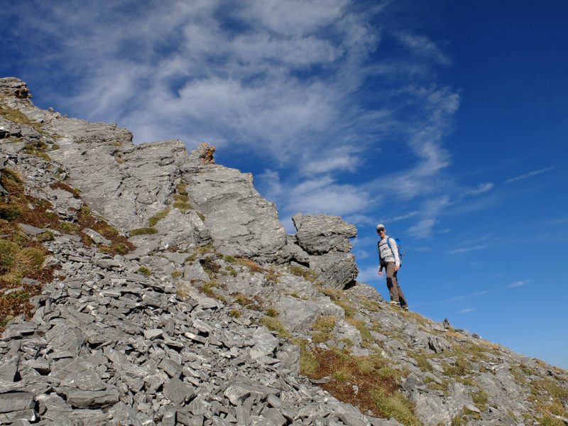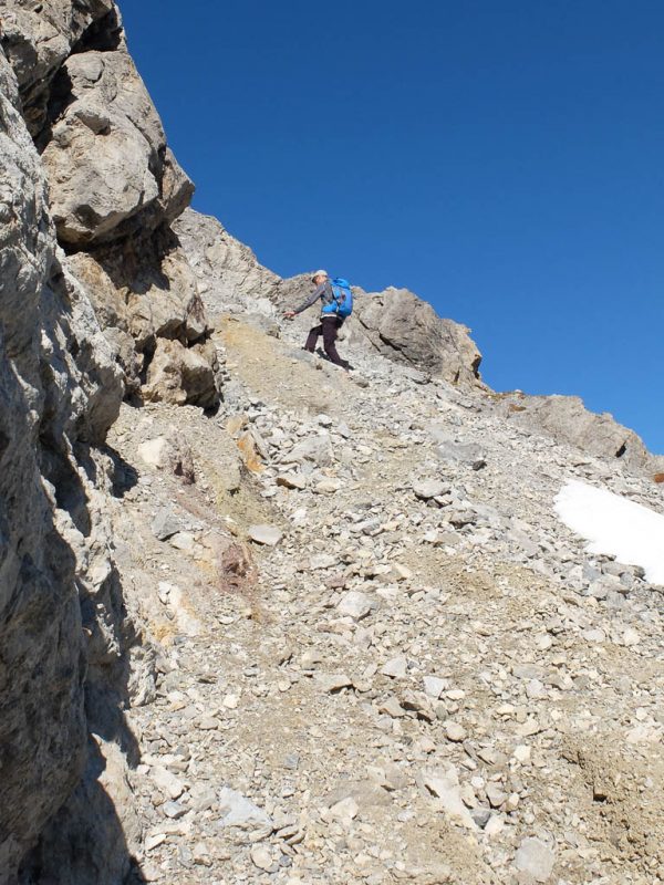 Der Aufstieg durch die Geröllrinne ist heikel, immer wieder geraten Steine ins Rutschen. Während ich mich noch mühsam nach oben kämpfe, hat es Guido schon so gut wie geschafft: