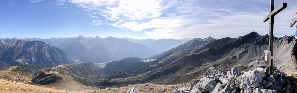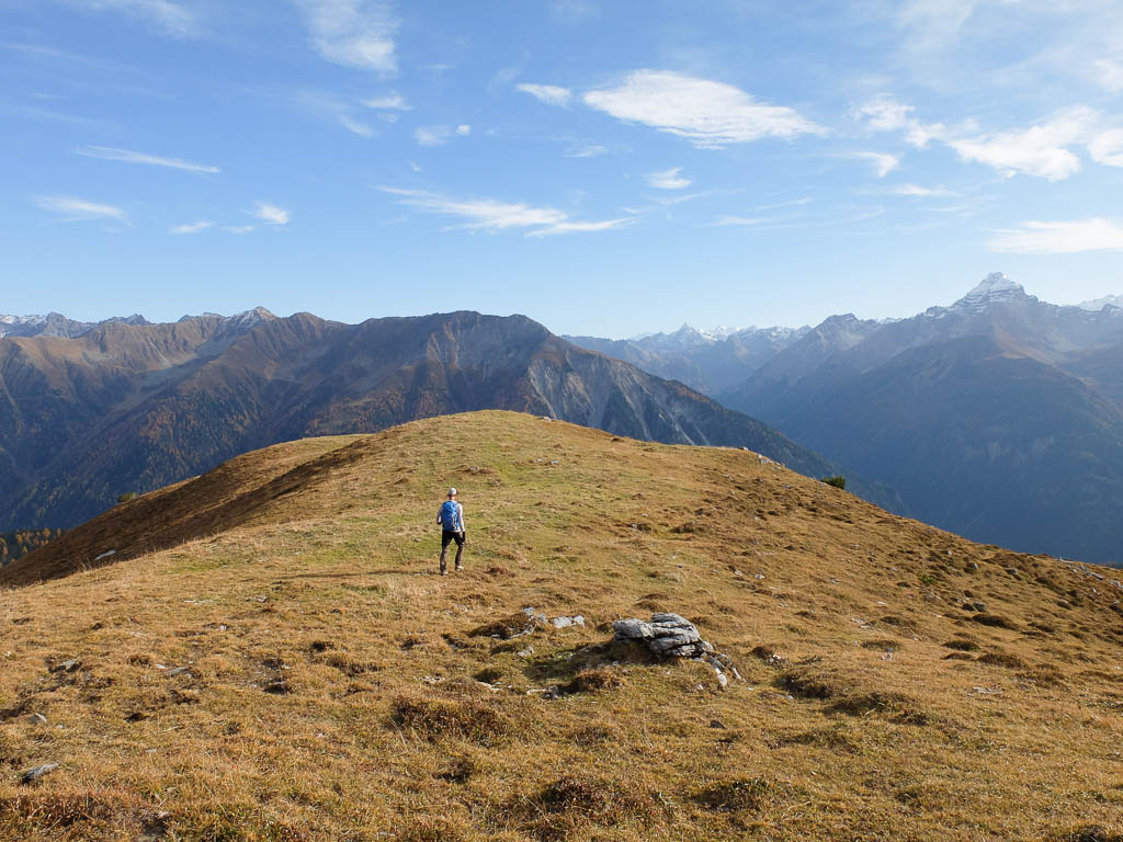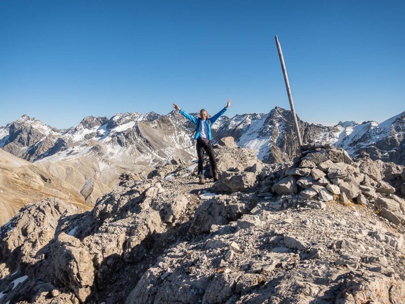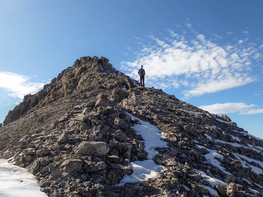 Gott sei Dank sehe ich erst hinterher, wie gefährlich diese Stelle ist: Wenn man hier den Halt verliert, fällt man im freien Fall Richtung Tal. Die letzten Meter bis zum Gipfel sind dagegen ein Klacks. Geschafft, ich stehe auf dem 2814 Meter hohen Gipshorn:
