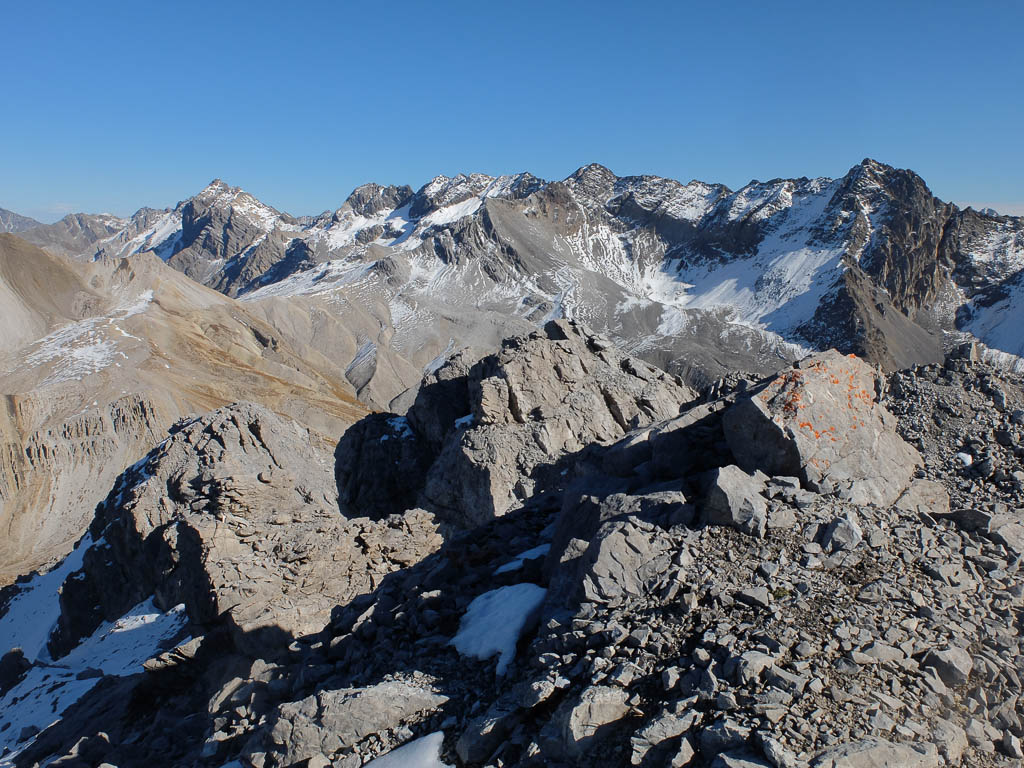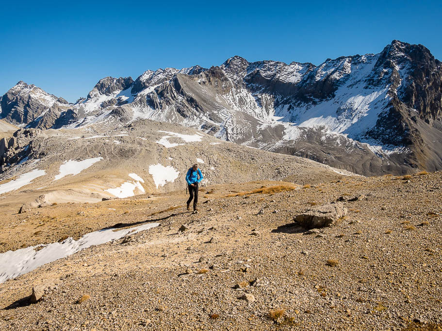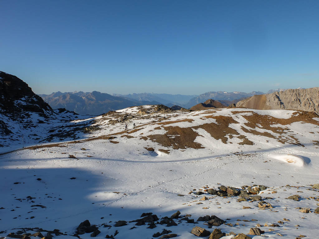Auf dem Weg zur Geröllrinne, hinter mit liegen die Gipfel von Gletscher Ducan, Chlein Ducan und Hoch Ducan, alles Gipfel über 3000 Meter: