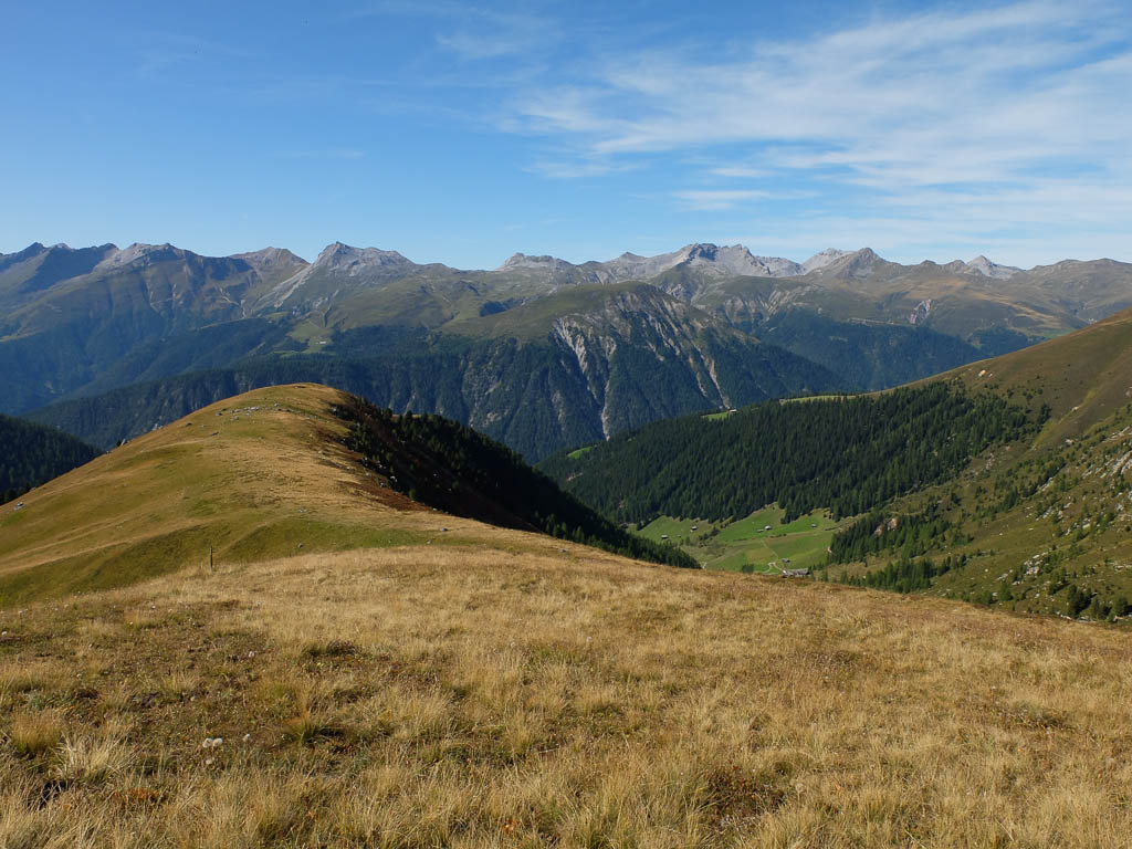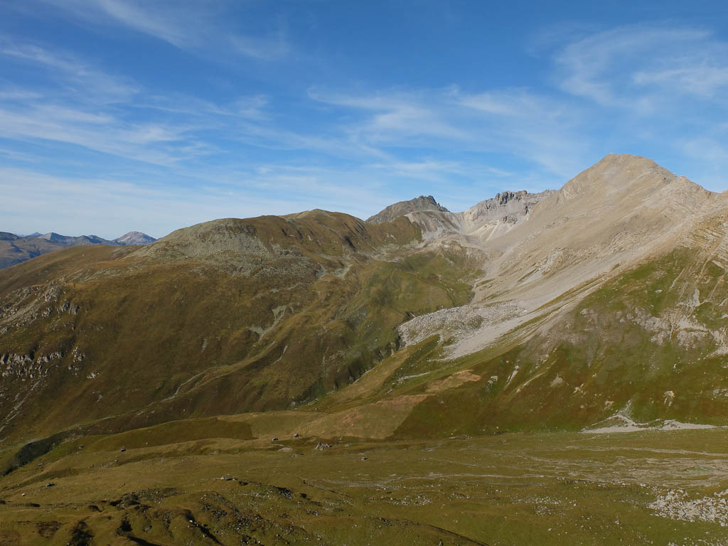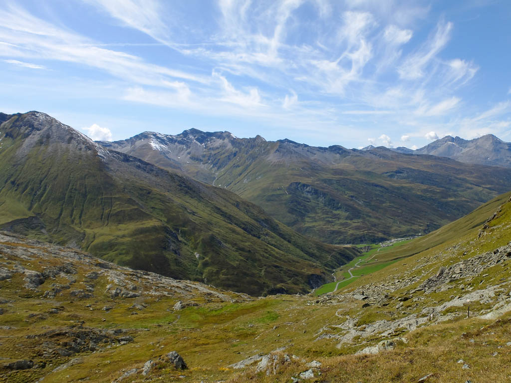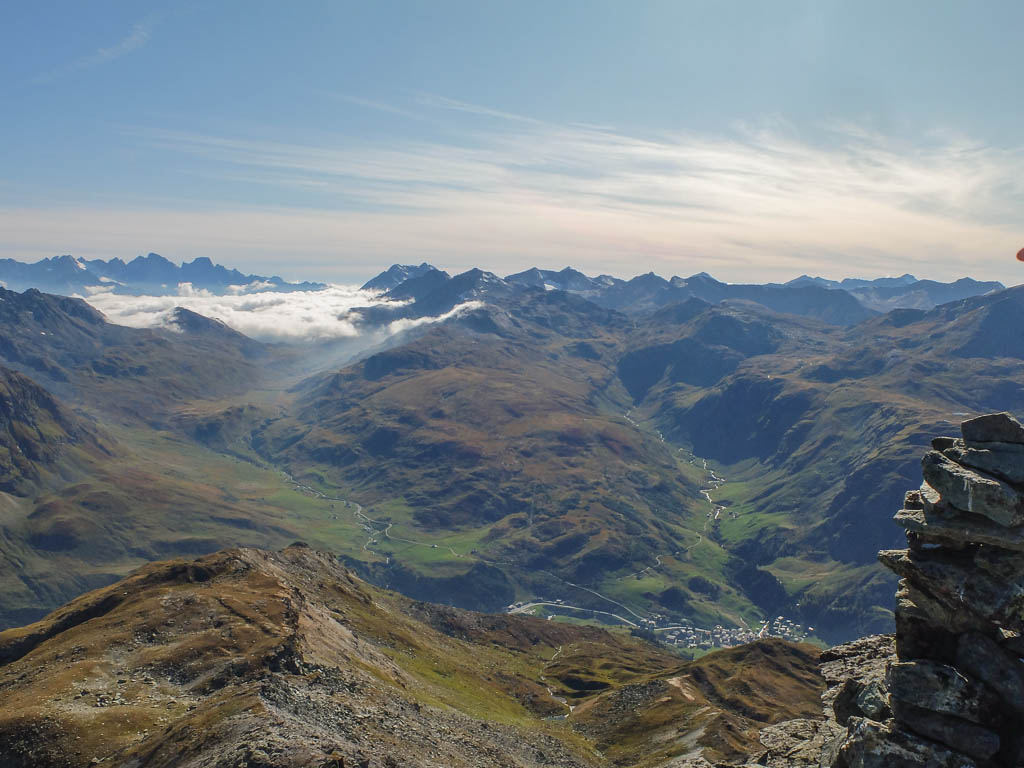 Der Blick zurück Richtung Westen, im Tal liegt Bivio, in der Bildmitte der Gipfel Uf da Flue, den wir am vierzehnten September besuchten:
