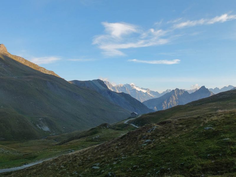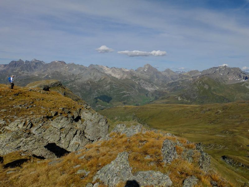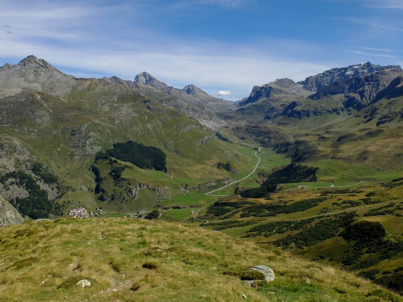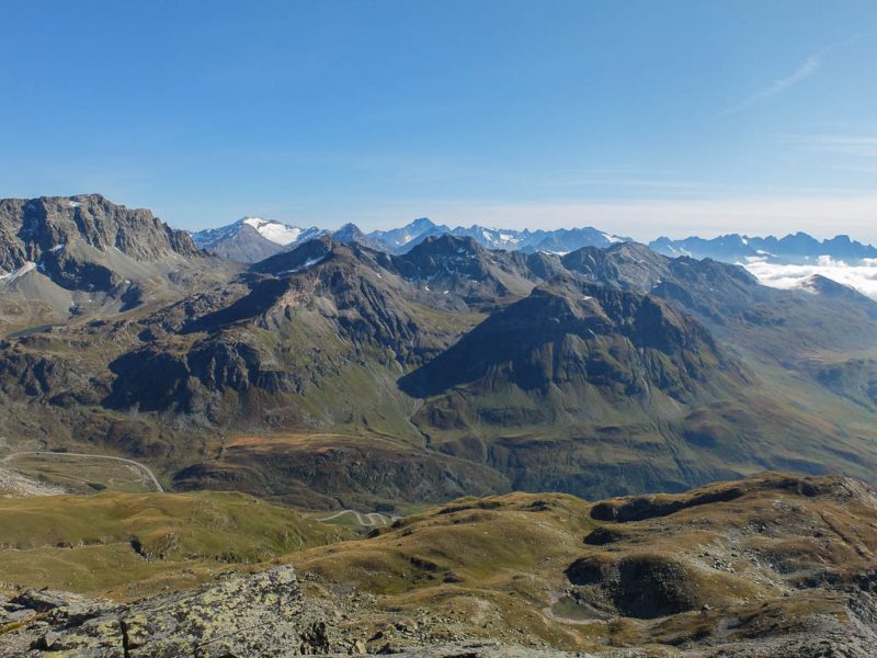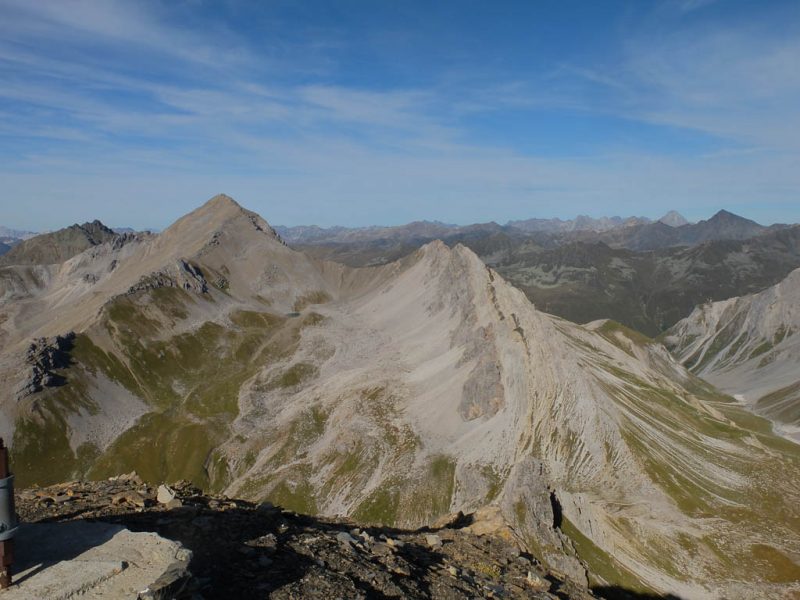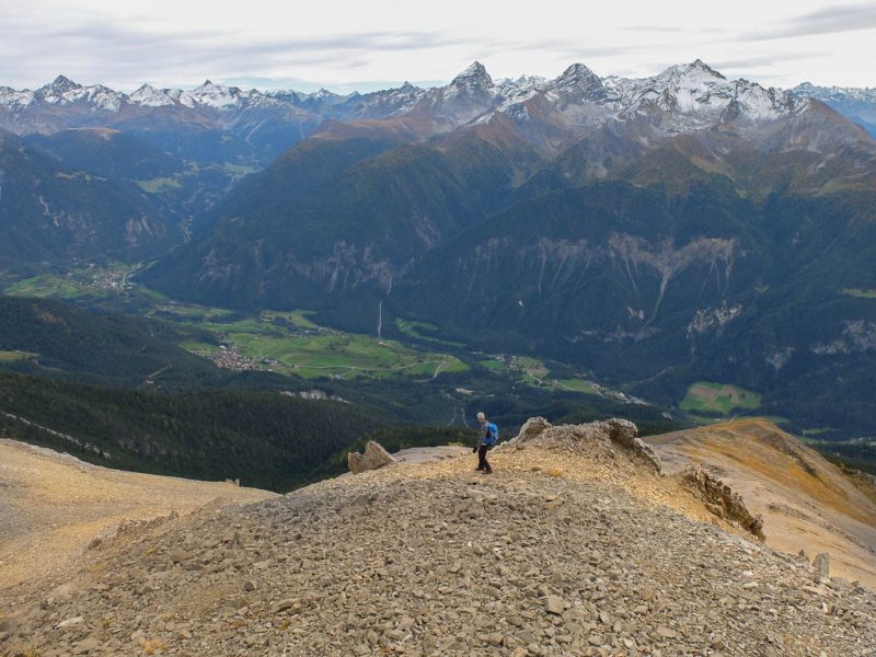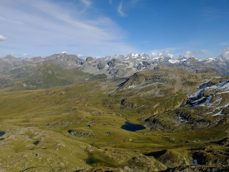 Der Blick zurück Richtung Westen, im Tal liegt Bivio, in der Bildmitte der Gipfel Uf da Flue, den wir am vierzehnten September besuchten: