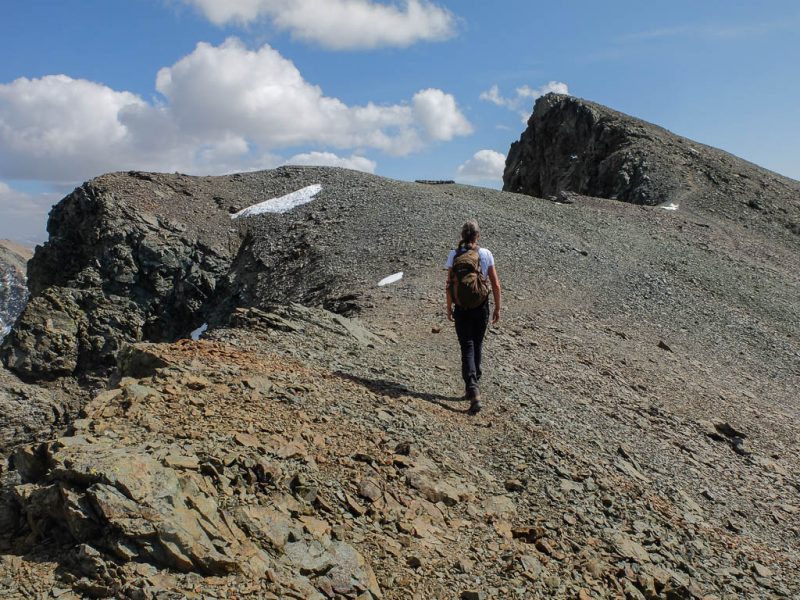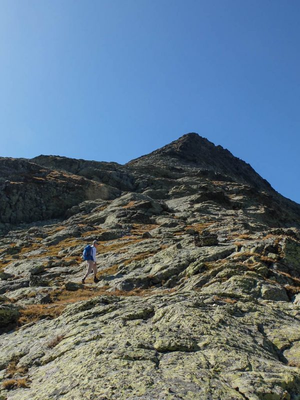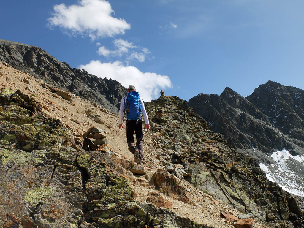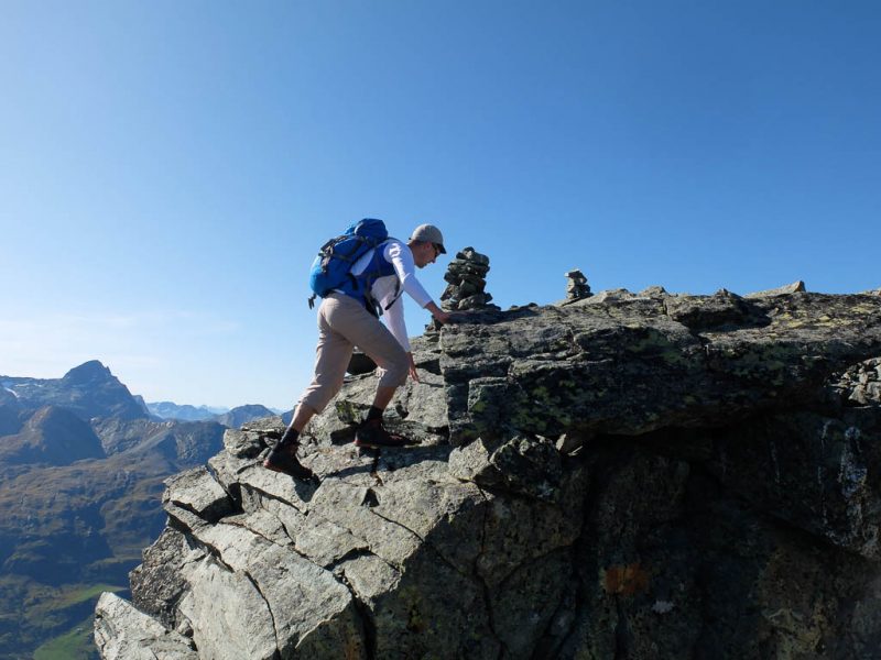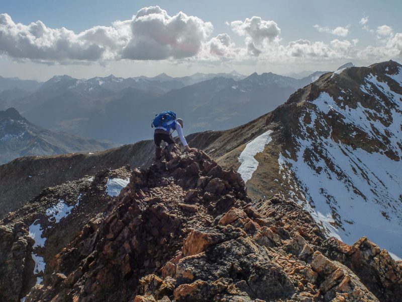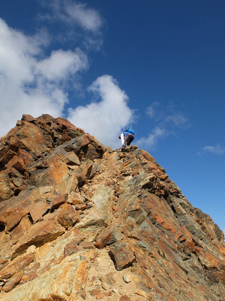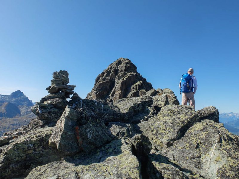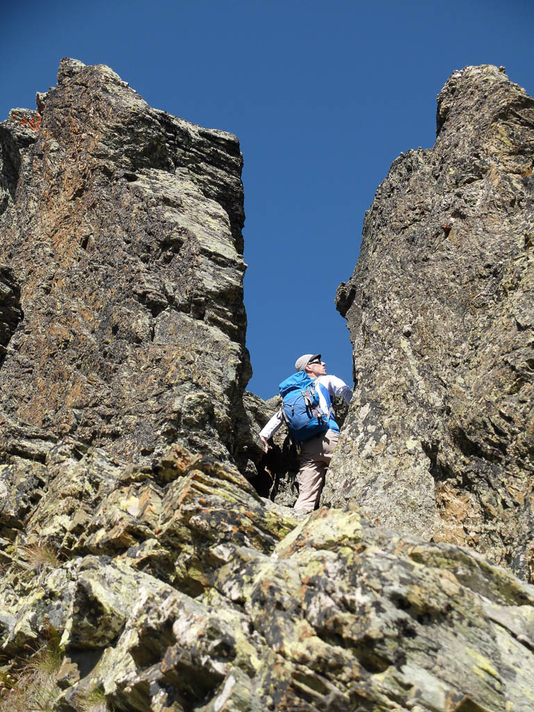 Schritt für Schritt, die Hände immer fest am Fels, umgehen wir die Scharte und klettern dann wieder zum Grat hinauf. Ab und zu begegnen wir während der Kletterei kleinen Steinmännern, die zeigen, dass wir wohl auf dem richtigen Weg sind. Zurück auf dem Grat: