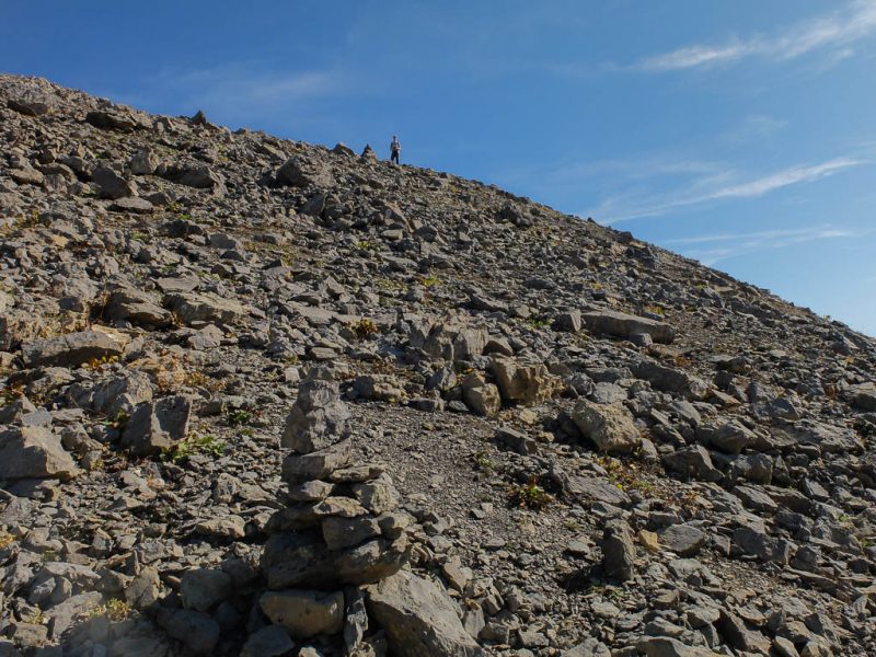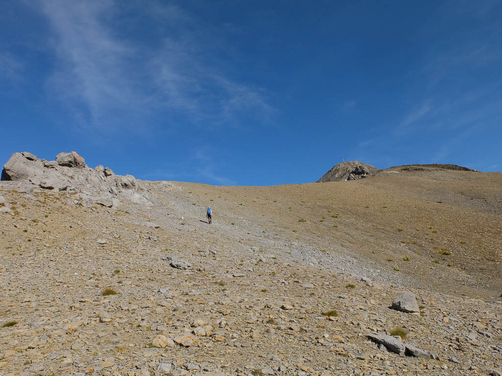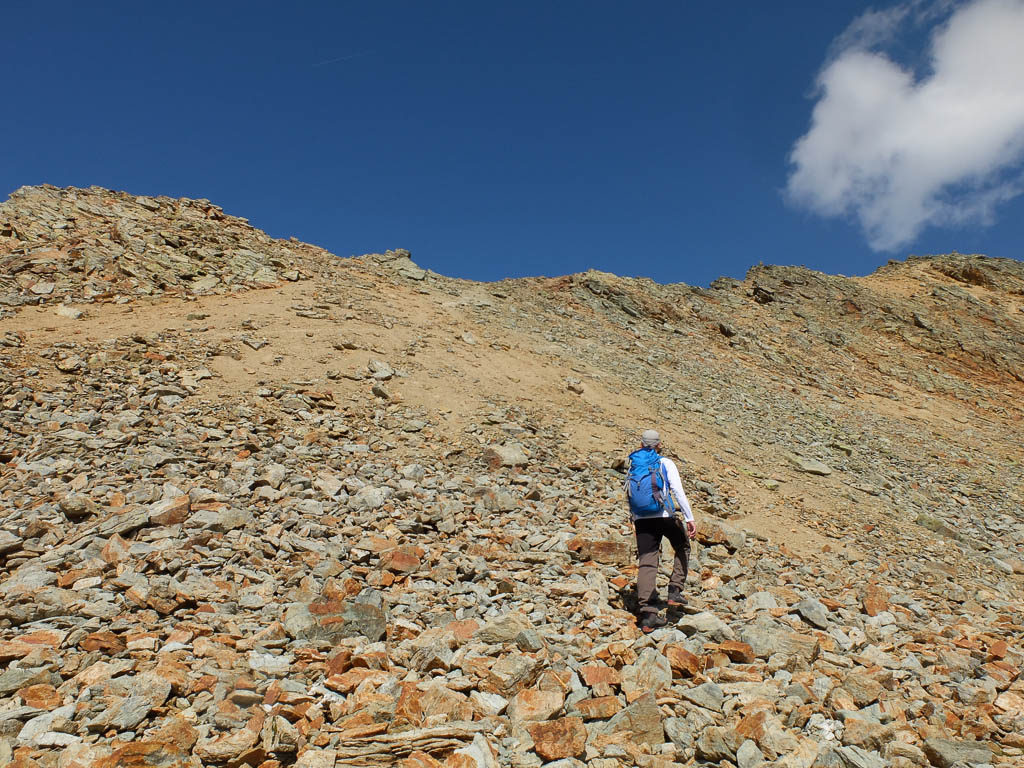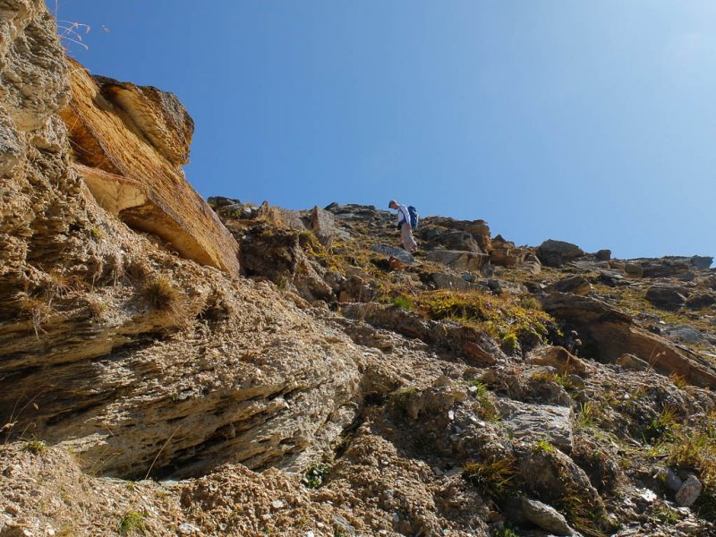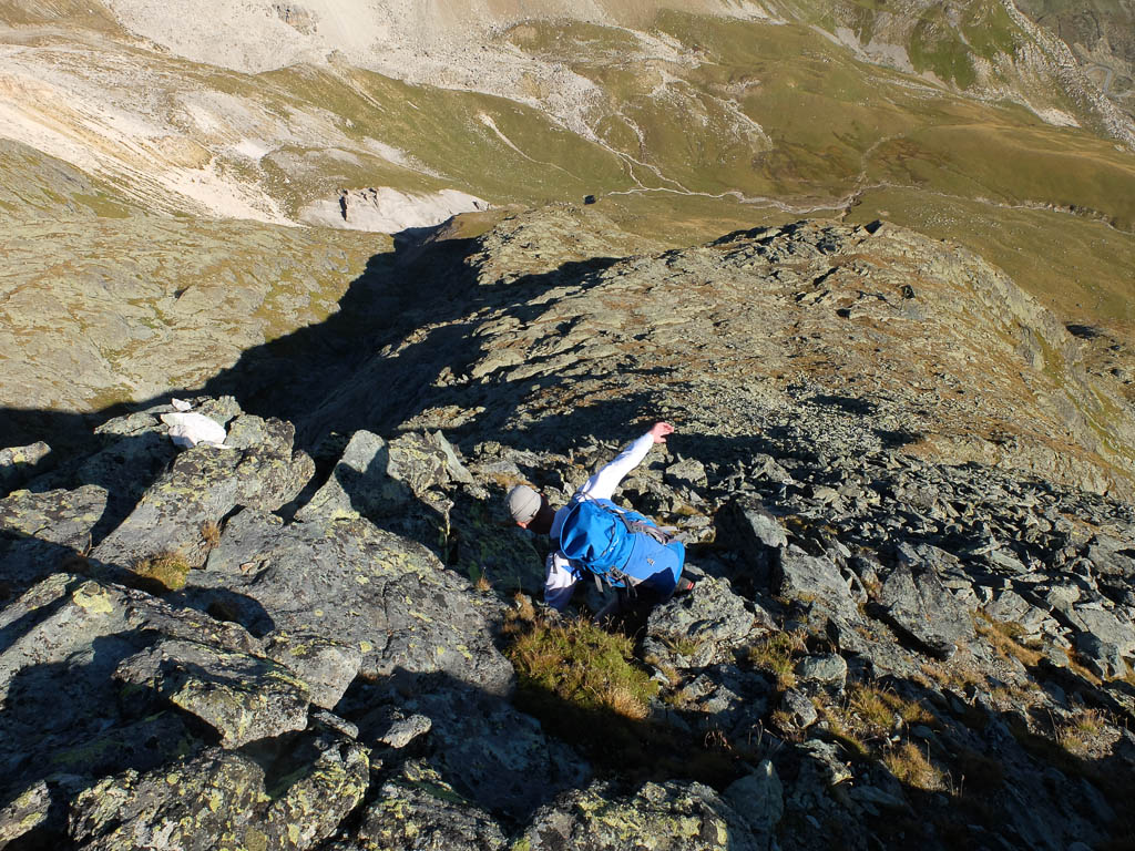 Bevor es endgültig hinauf zum Gipfel geht, müssen wir allerdings den Grat verlassen und ein kleines Stück absteigen. Da uns die komplette Umgehung einer Felsstufe zu mühsam erscheint, versuchen wir uns an einem Aufstieg entlang eines Geröllbands:
