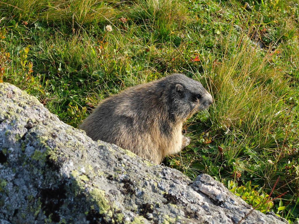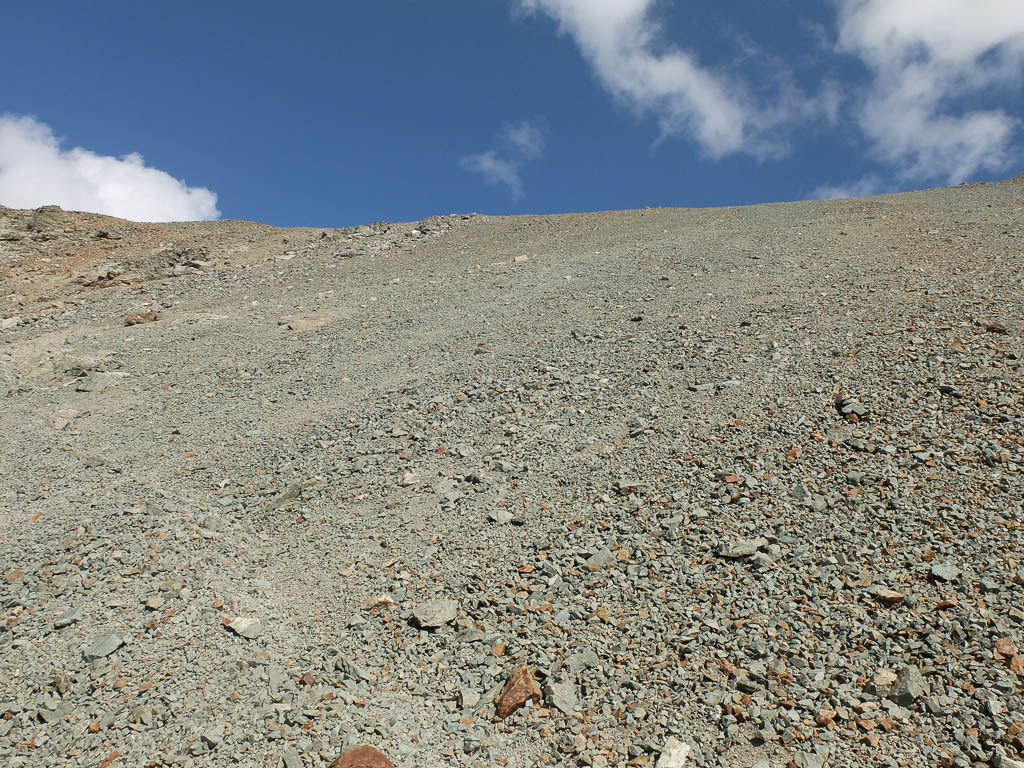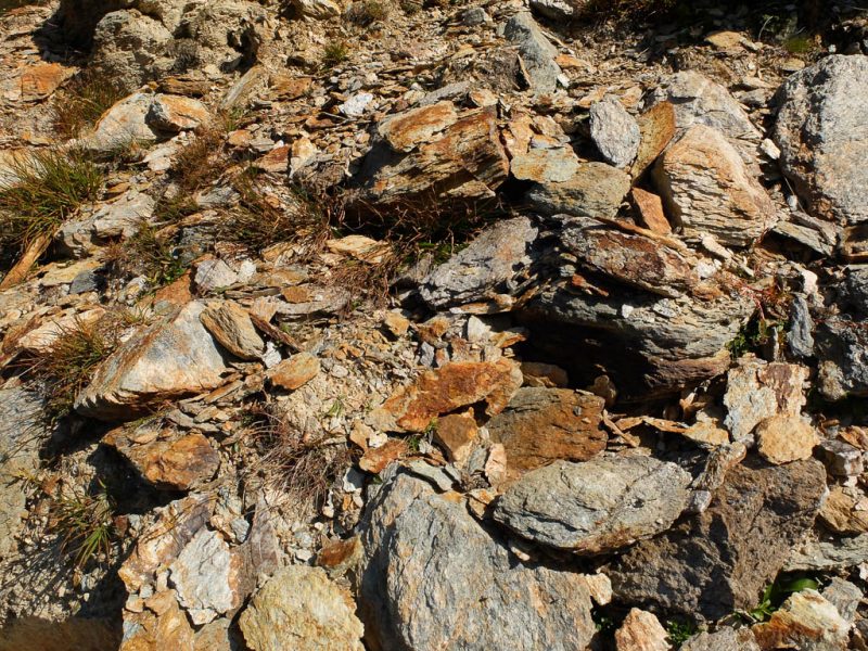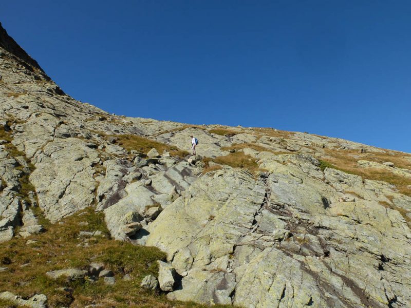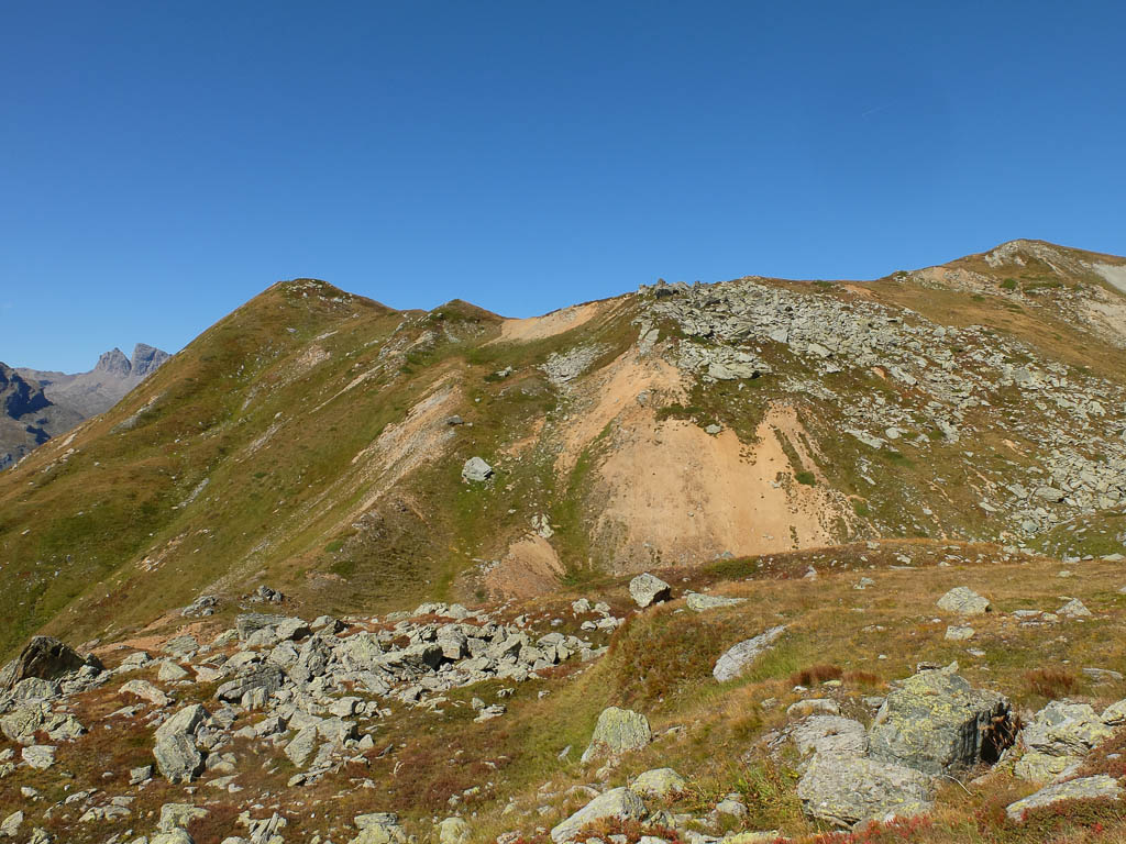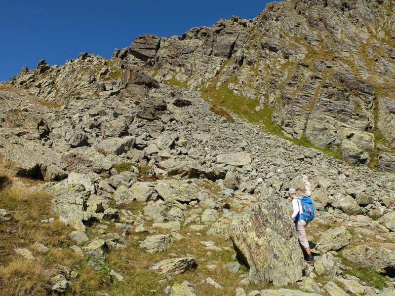 Für uns kommt daher als Aufstiegsroute auf den Piz Neir nur der Ostgrat in Frage, der im Führer ebenfalls mit „L“ bewertet ist, aber laut Tourenberichten auch tatsächlich einem „L“ entspricht. Weglos vom Piz Barscheinz über Gras, Felsen und Blockgeröll zum Ostgrat des Piz Neirs: