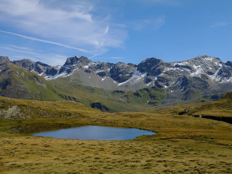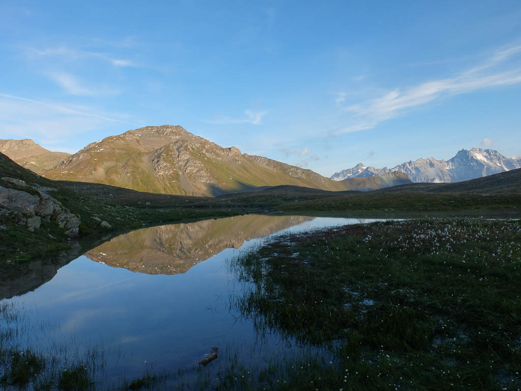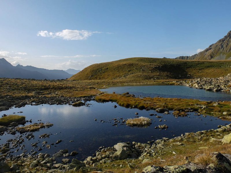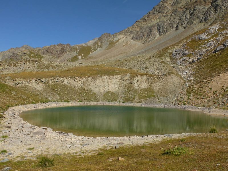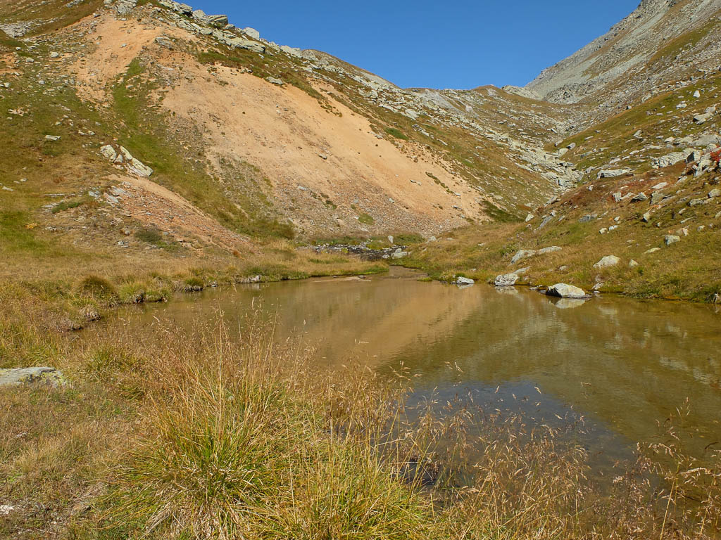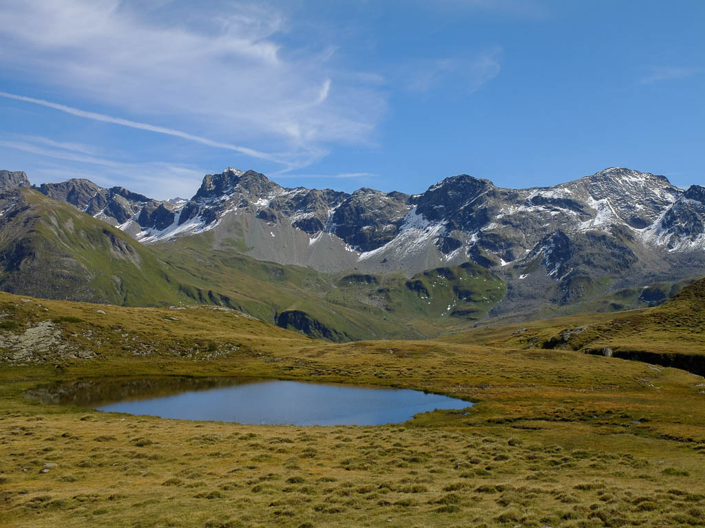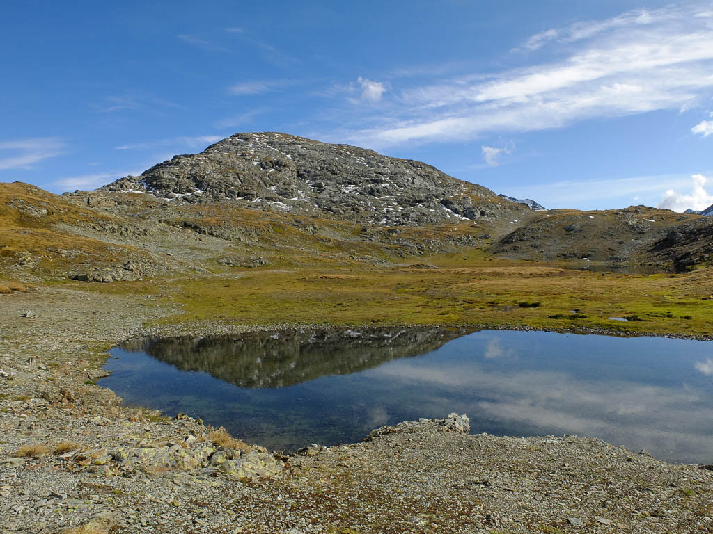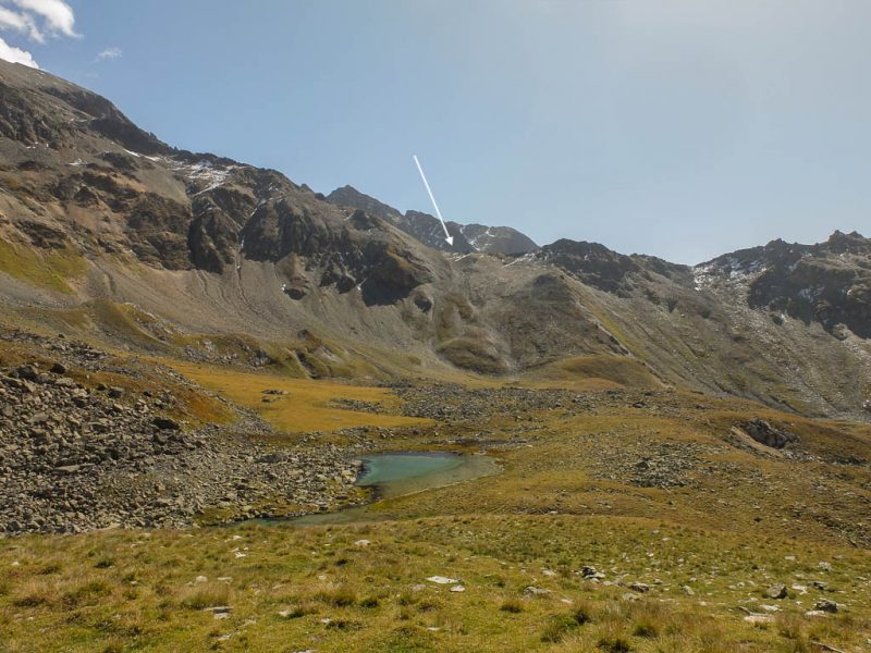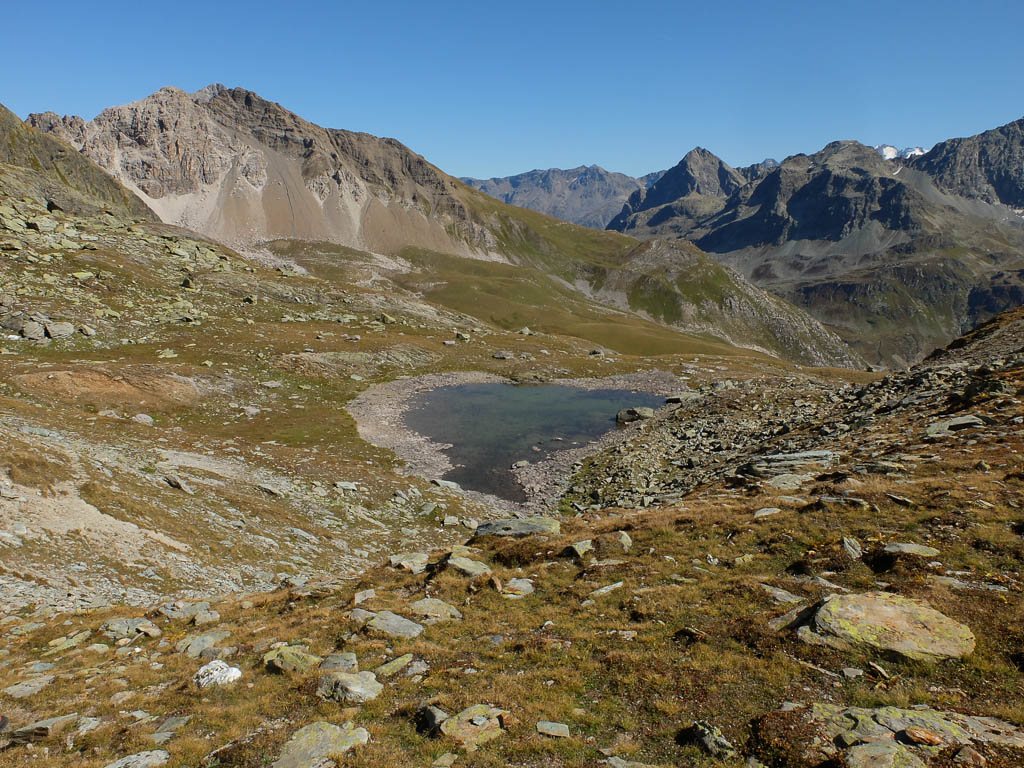 Vom Bleis Muntaneala steigen wir weglos Richtung Südosten zu einem kleinen, namenlosen Bergsee ab: