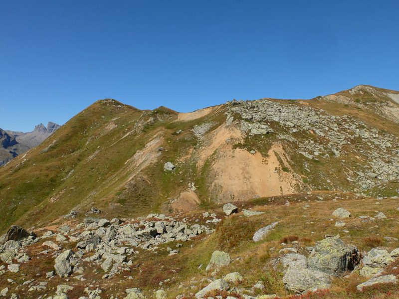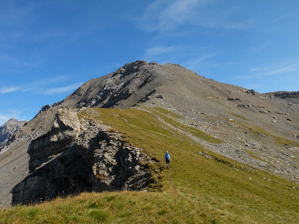Vom Bergsee aus geht es anfangs über Gras, später über Felsen hinauf zu einem auf den 2616 Meter hohen Piz Barscheinz führenden Grat: