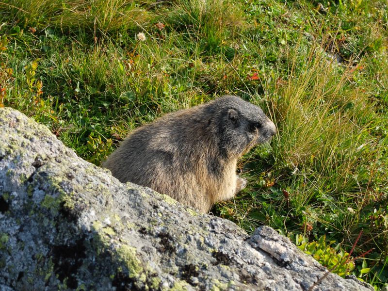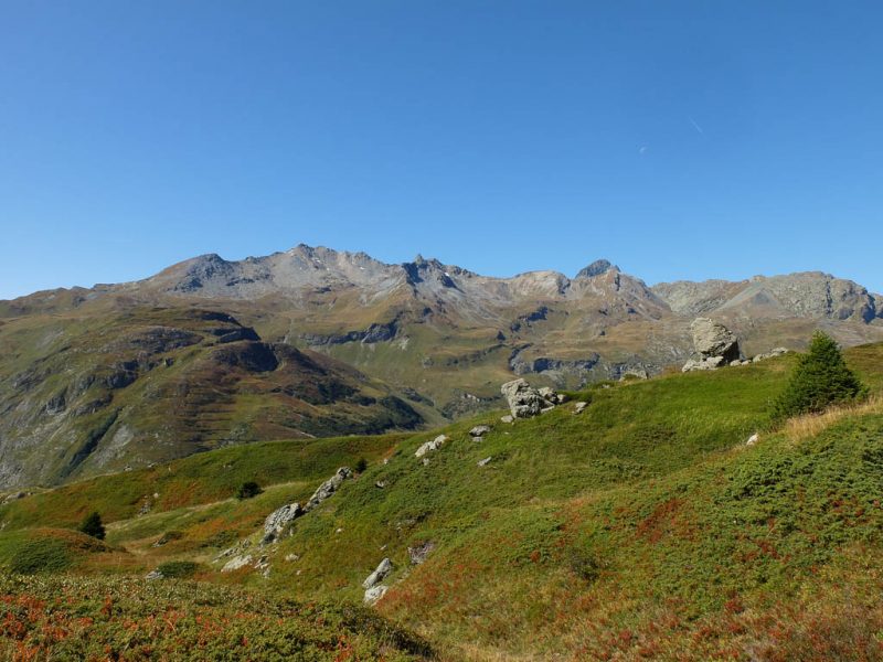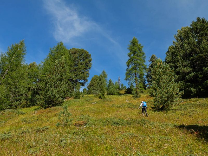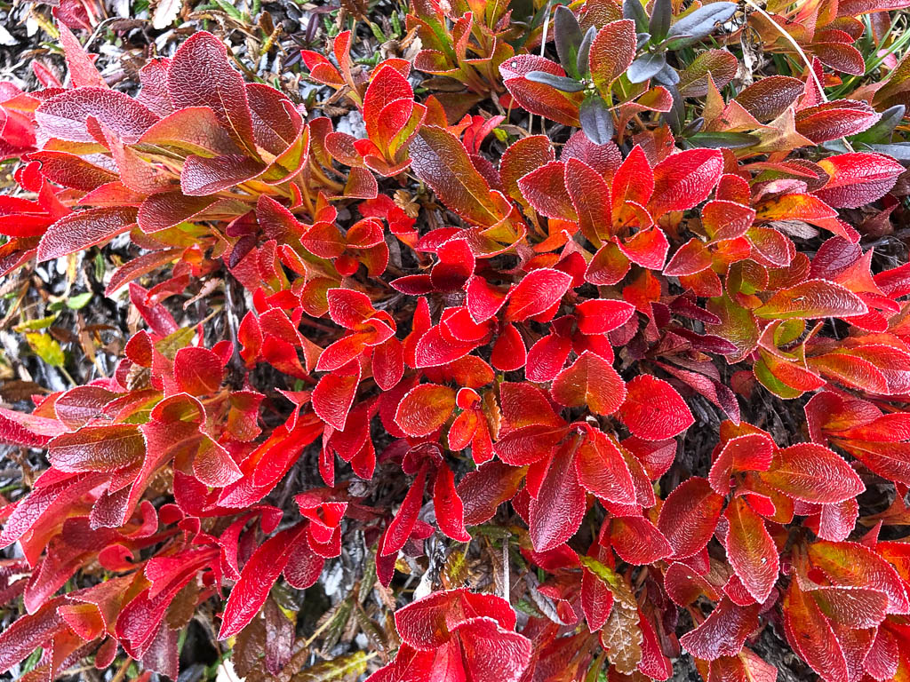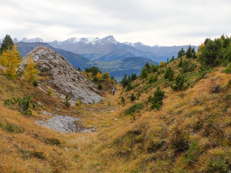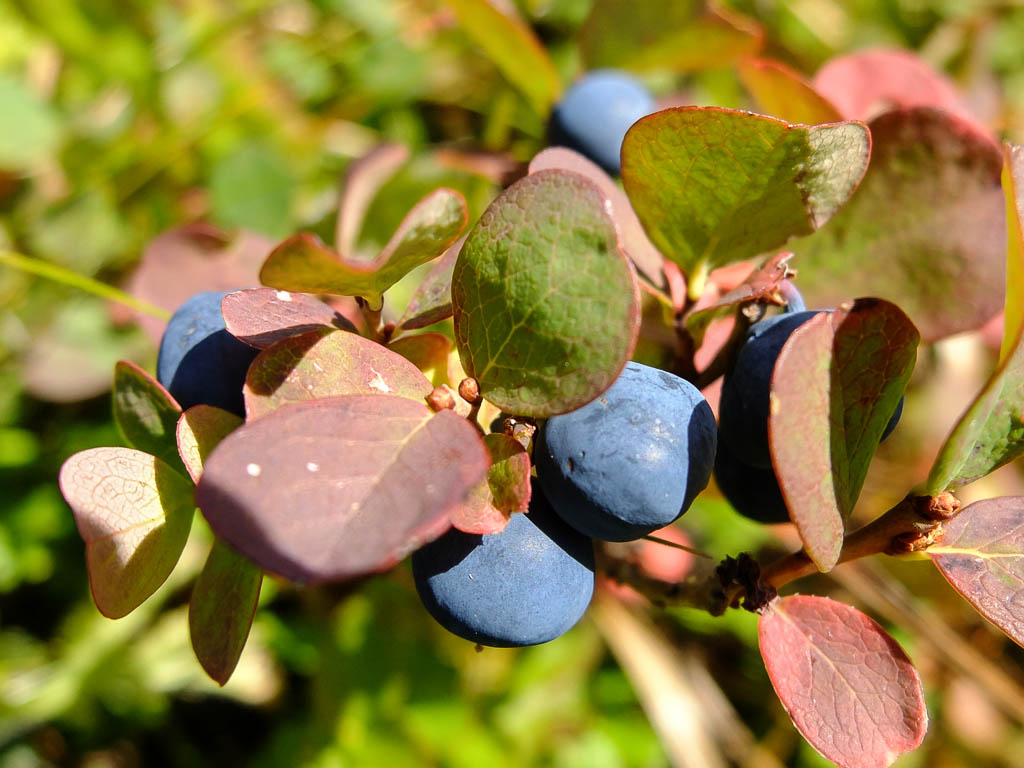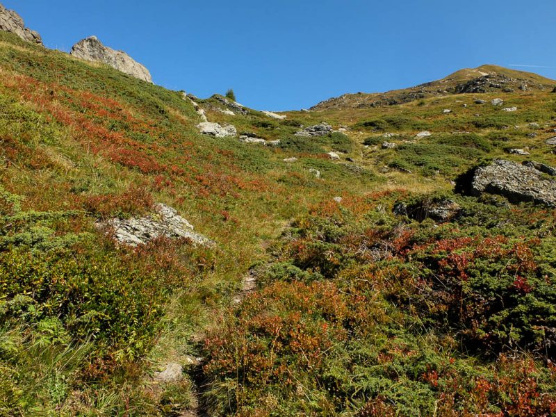 Startpunkt unserer heutigen Tour ist wie am vierzehnten September ein Parkplatz am Ortsrand von Bivio. Unser erstes Gipfelziel ist der 2452 Meter hohe Bleis Muntaneala, ein östlich von Bivio gelegener Aussichtsberg. Auf den Bleis Muntaneala führt ein offizieller Wanderweg, der allerdings auf OpenStreetMap (noch) nicht verzeichnet ist. Da Bivio selbst schon auf einer Höhe von fast 1800 Metern liegt, sind bis zum Gipfel nur rund 600 Höhenmeter zu überwinden. Die Vegetation entlang des Weges ist herbstlich angehaucht und besteht die unter anderem aus Walcholder, Heidelbeeren und Alpenrosen: