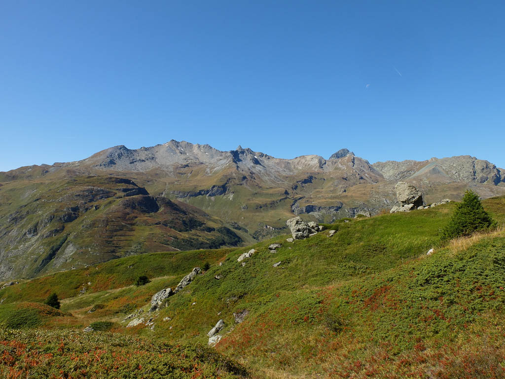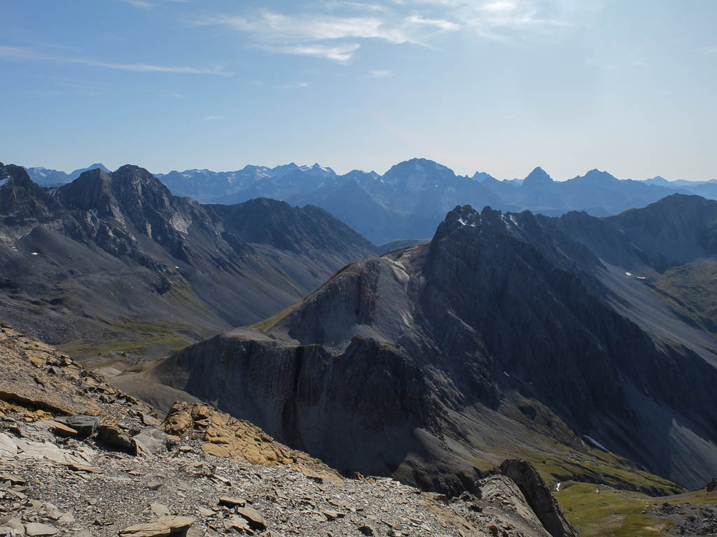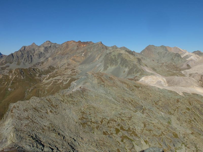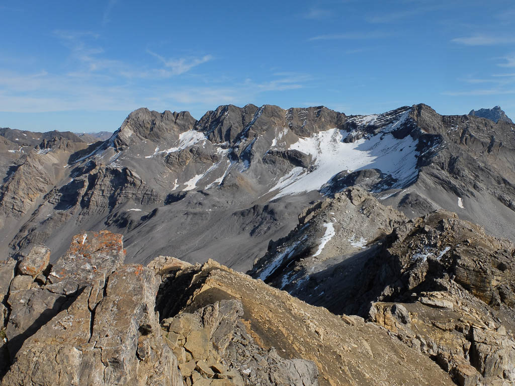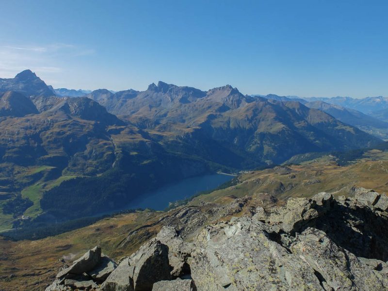 Der Blick nach Nordosten auf Piz Calderas, Tschima da Flix, Piz d‘ Agnel und Piz Surgonda (von links nach rechts):