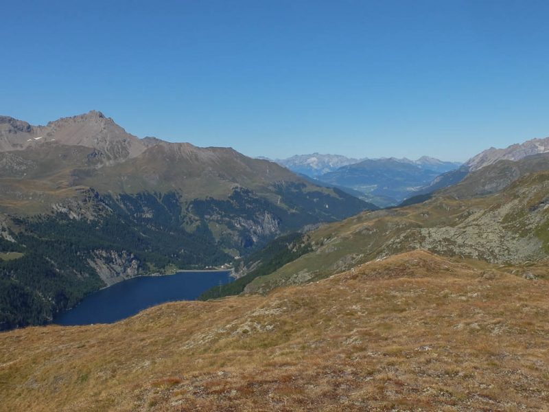 Die Aussicht vom Bleis Muntaneala ist fantastisch, aber da wir noch weitere Gipfelziele anvisieren, belasse ich es mit einer Aufnahme Richtung Norden, die den Lai da Marmorera zeigt:
