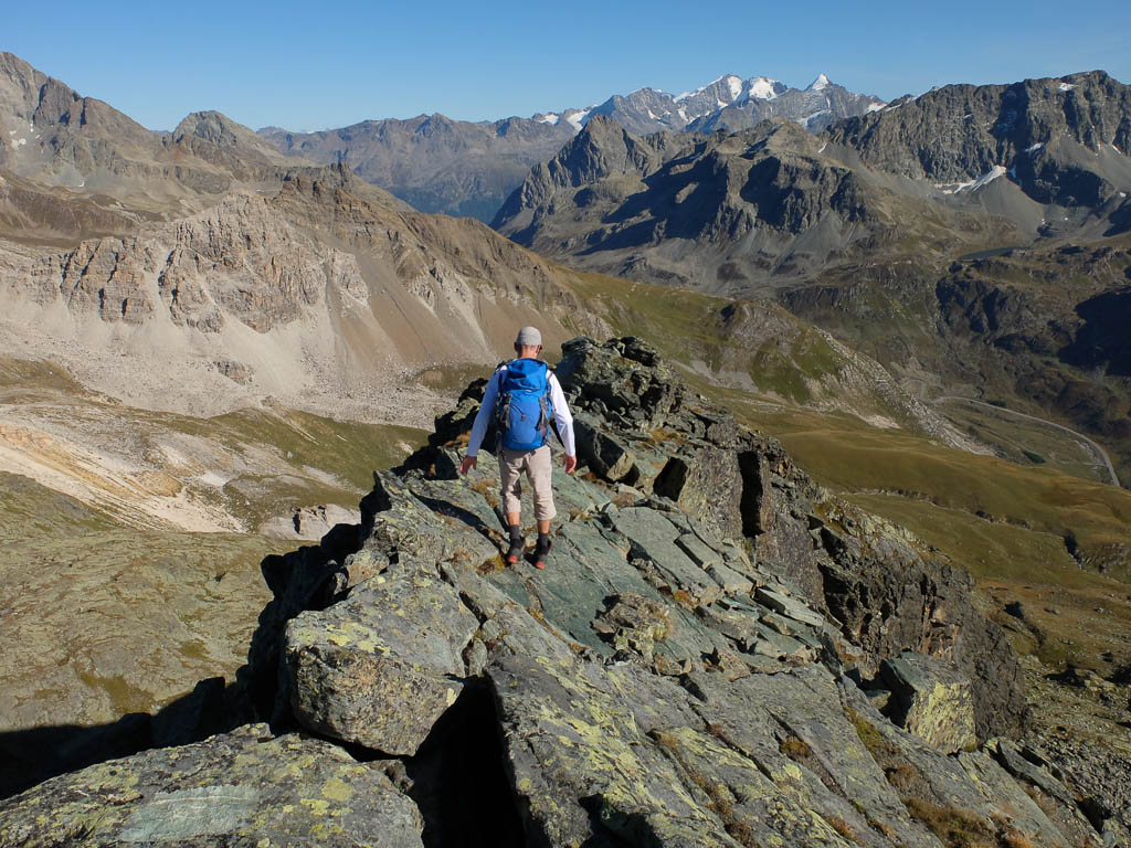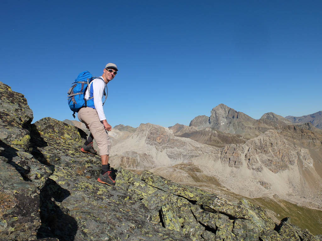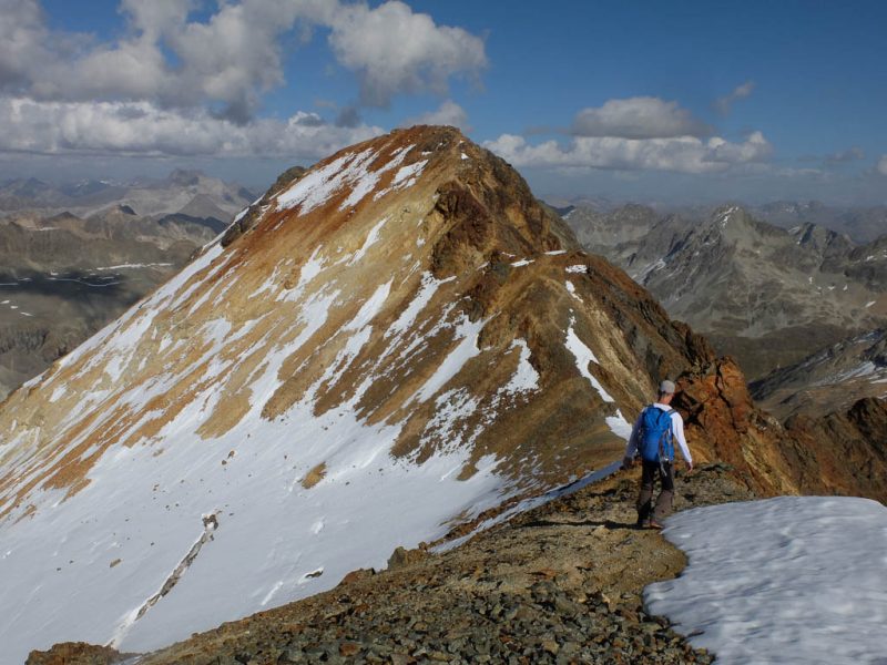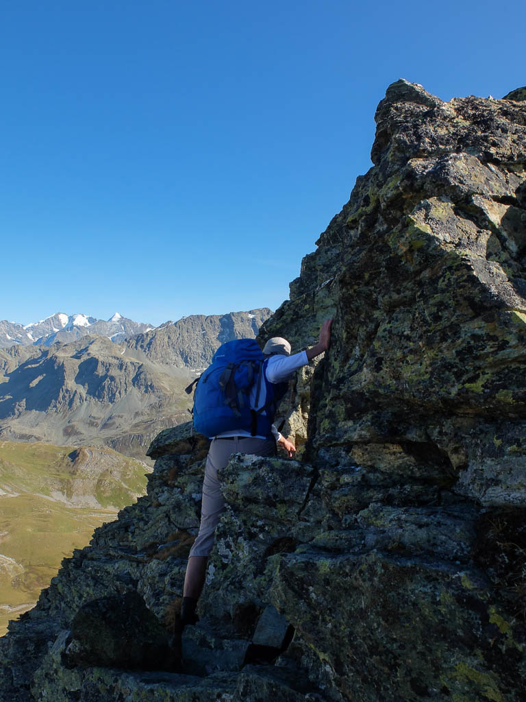 Nach einer kurzen Gipfelrast geht es auf den Abstieg, anfangs aufrecht über die Felsplatten des Ostgrats mit Blick auf Piz Bernina: