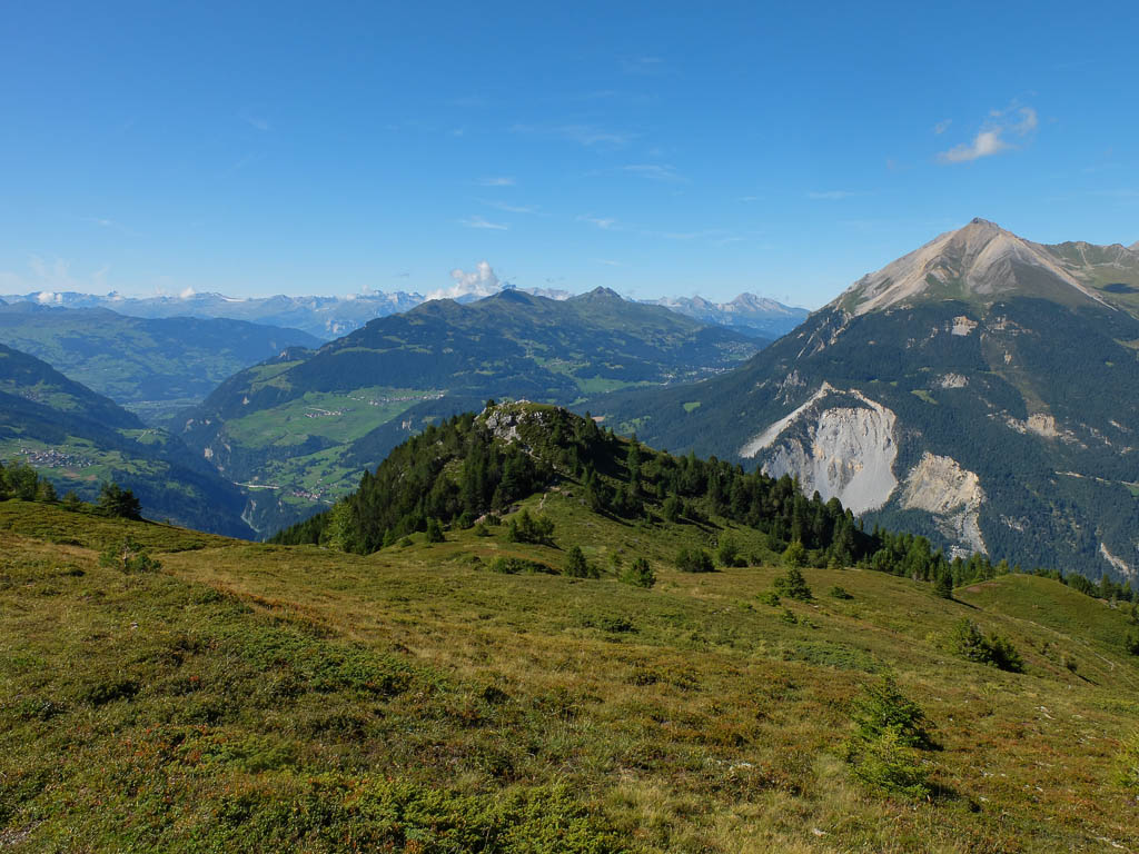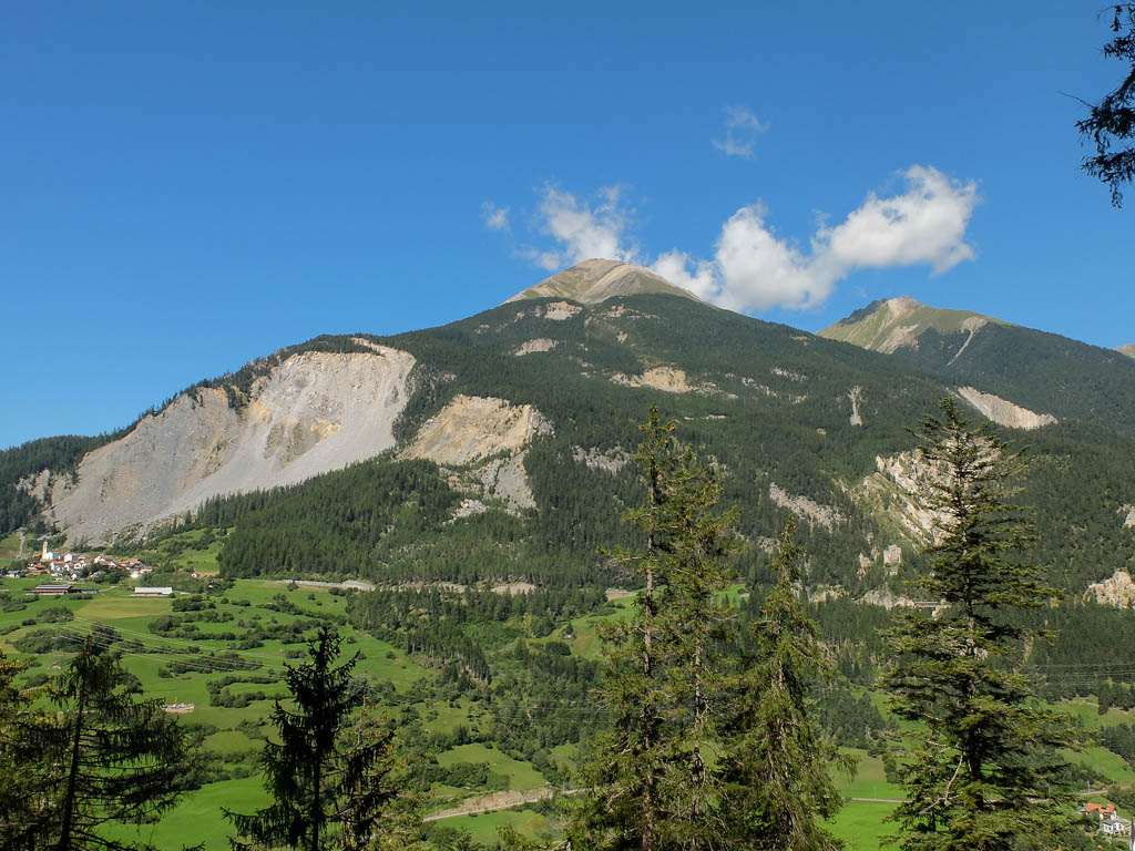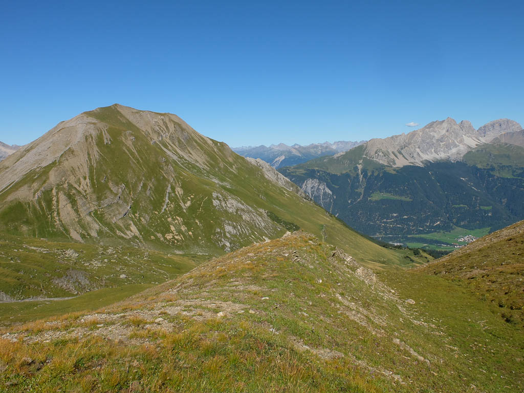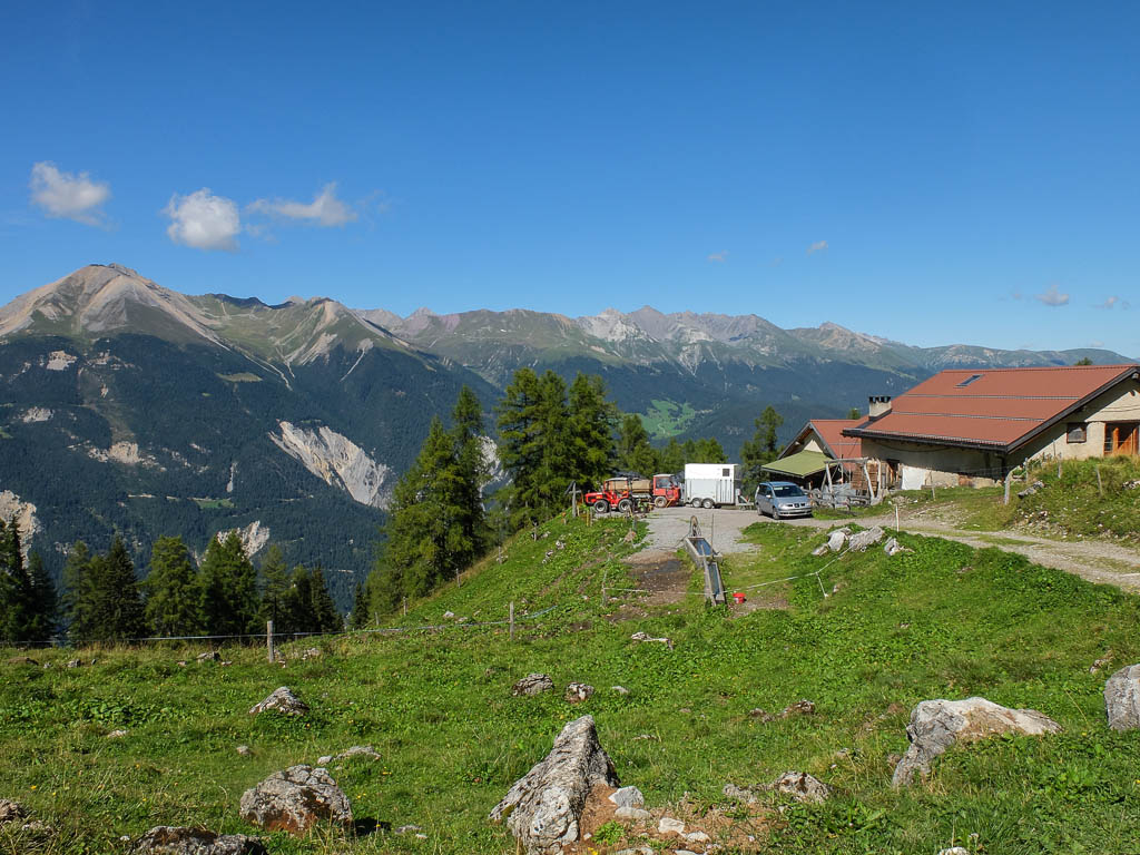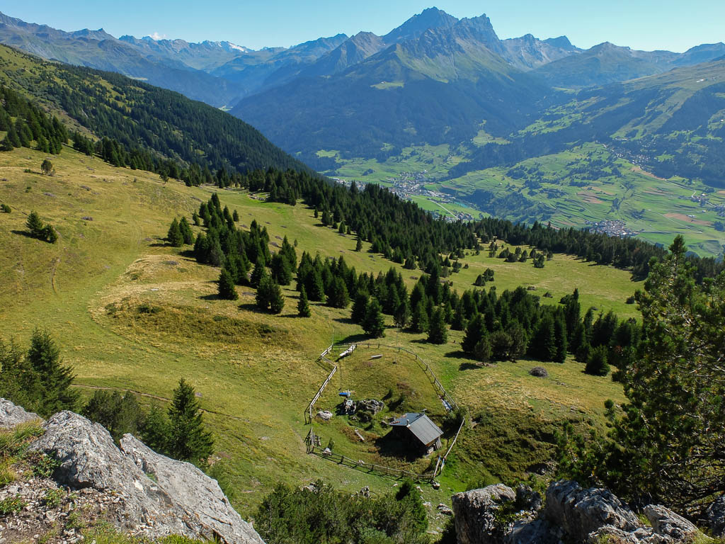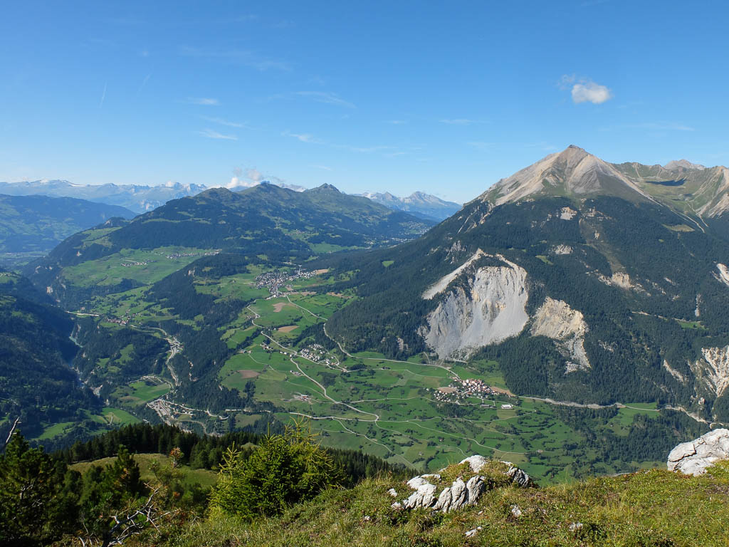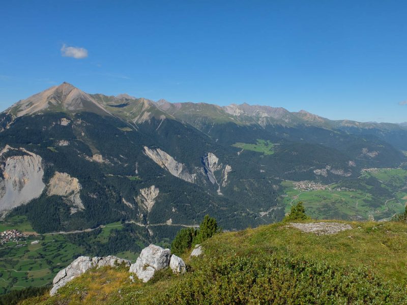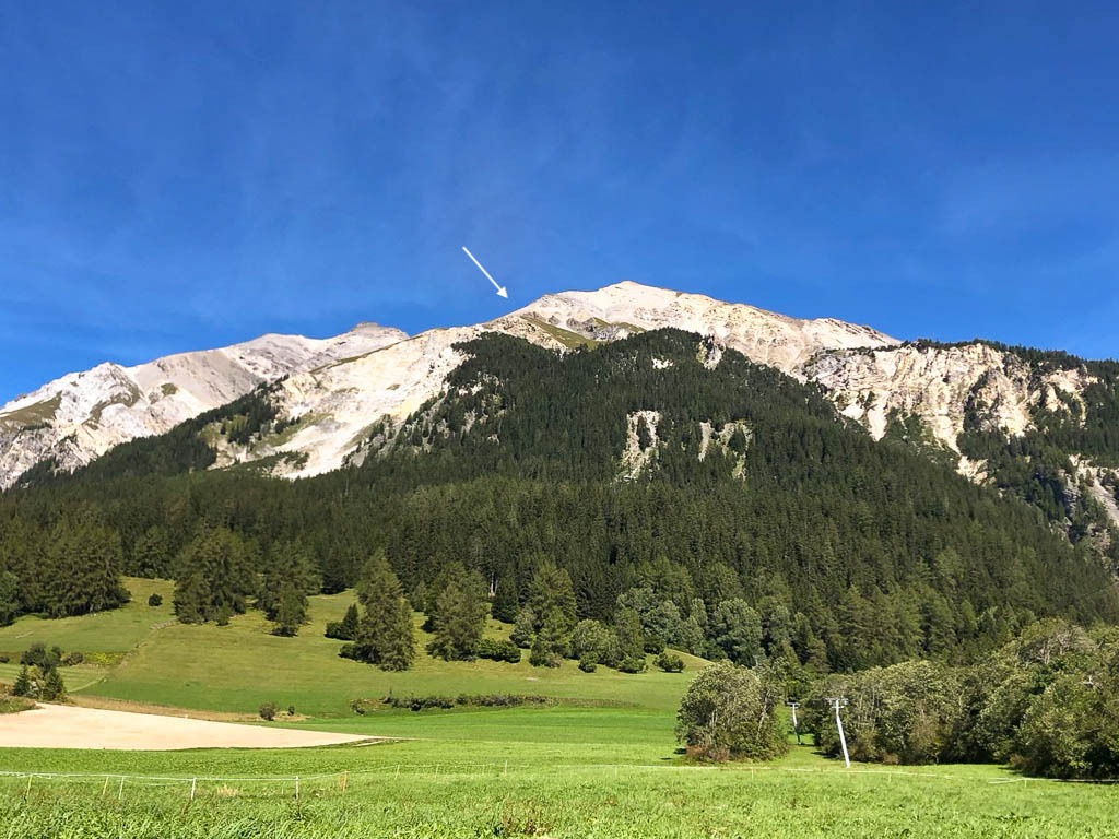 Heute steigen wir von Lenz aus über Vasternos nach Scasaluir, einer einsamen, auf rund 2200 Metern gelegenen Grasfläche an der Westflanke des Piz Linards, auf. Von Lenz aus ist diese Grasfläche deutlich zu sehen: