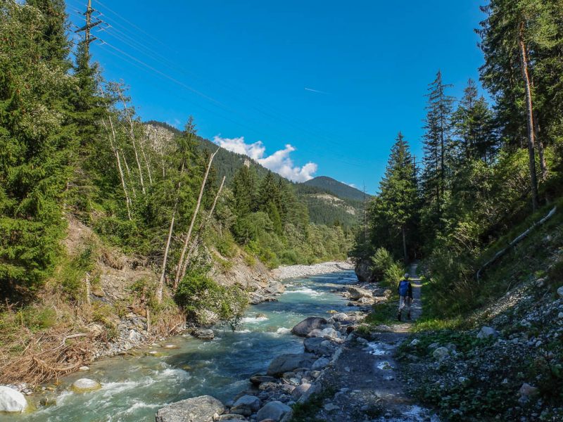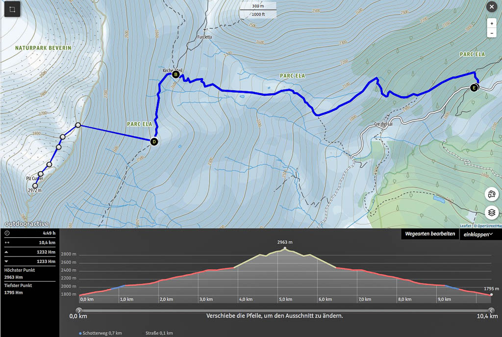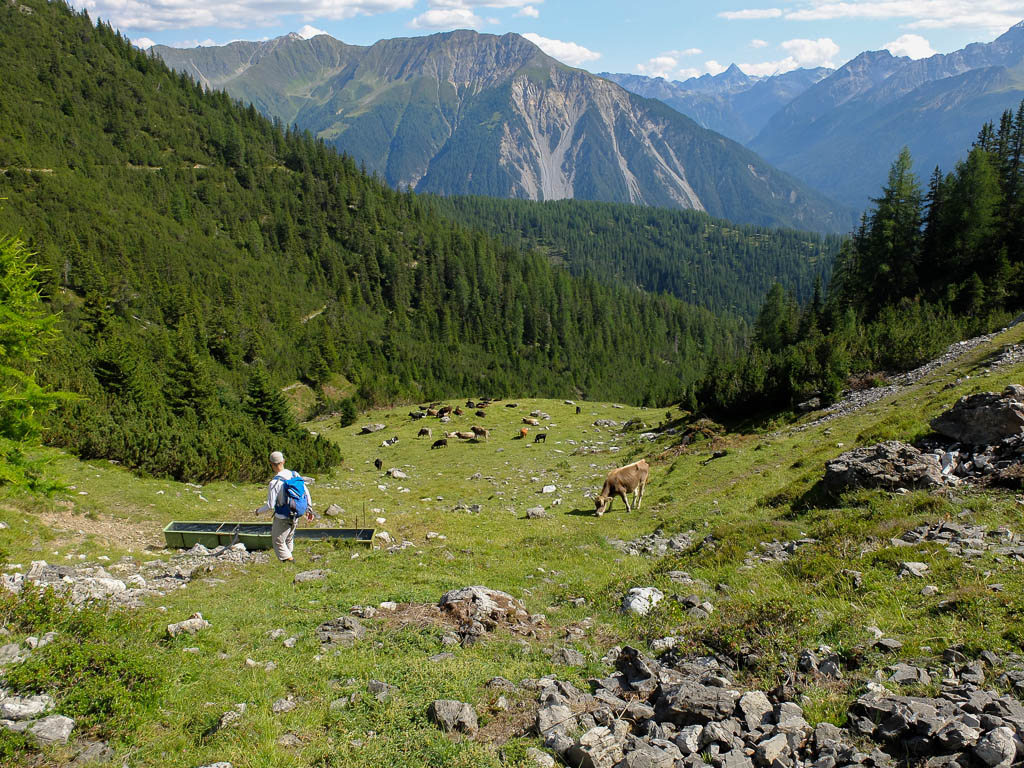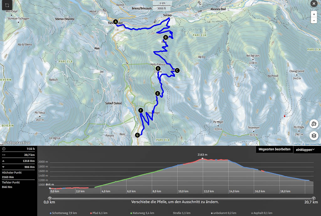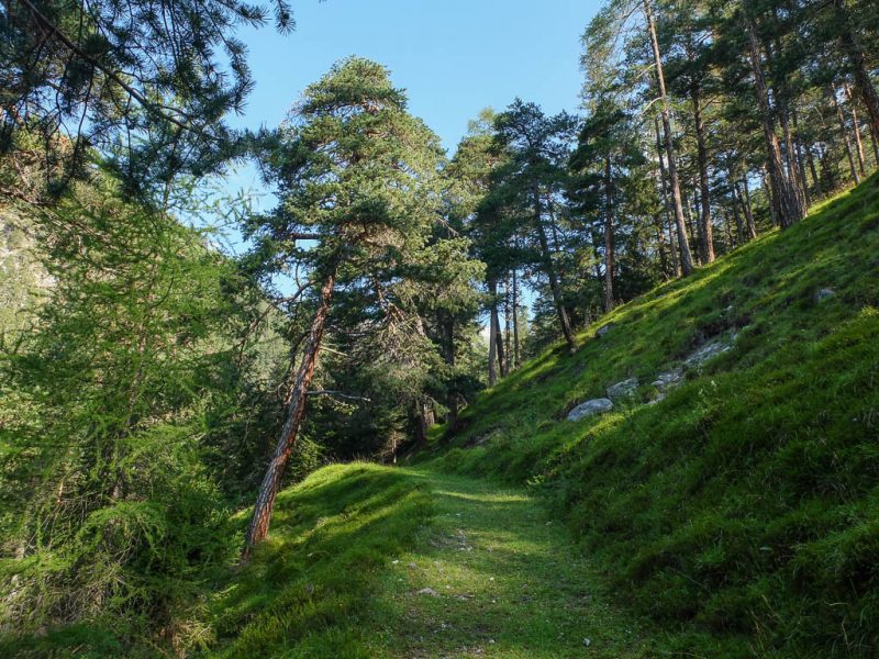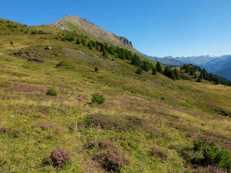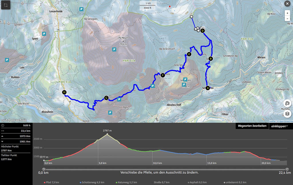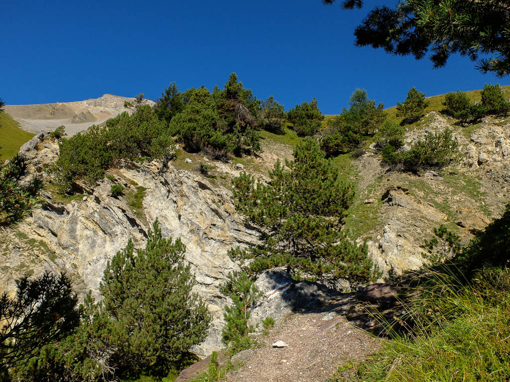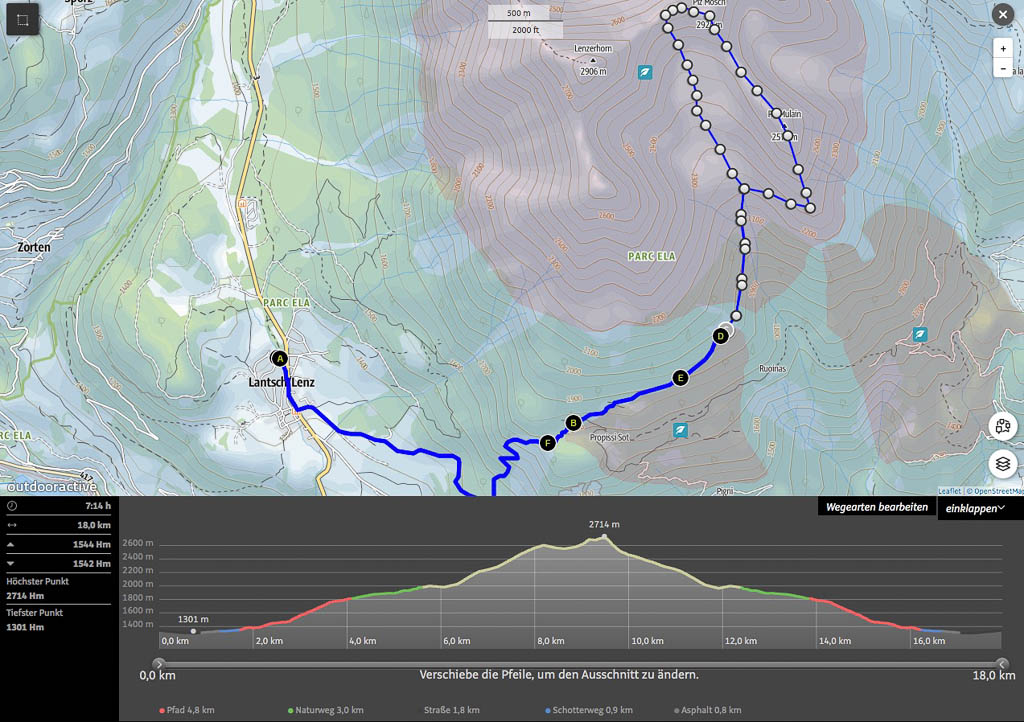 Heute steigen wir von Lenz aus über Vasternos nach Scasaluir, einer einsamen, auf rund 2200 Metern gelegenen Grasfläche an der Westflanke des Piz Linards, auf. Von Lenz aus ist diese Grasfläche deutlich zu sehen: