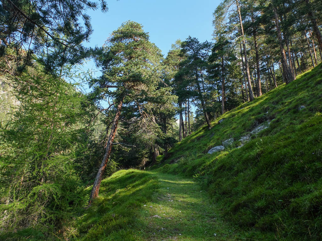 Je höher wir kommen, desto lichter wird der Wald und das Grün der Bäume bildet einen herrlichen Kontrast zum Blau des Himmels. Hier sind wir kurz unterhalb der Baumgrenze: