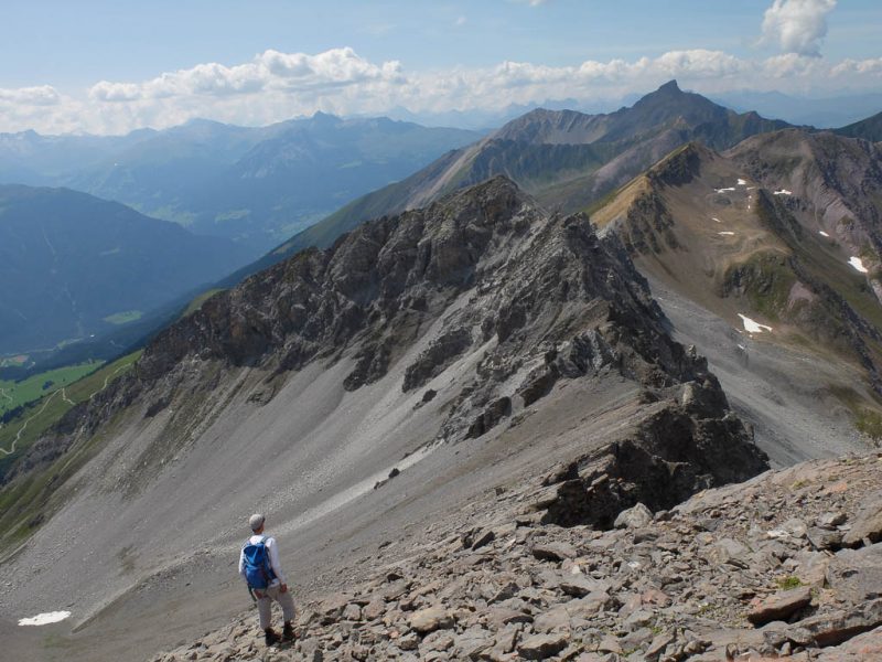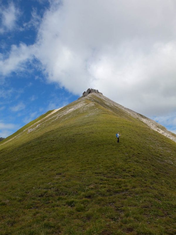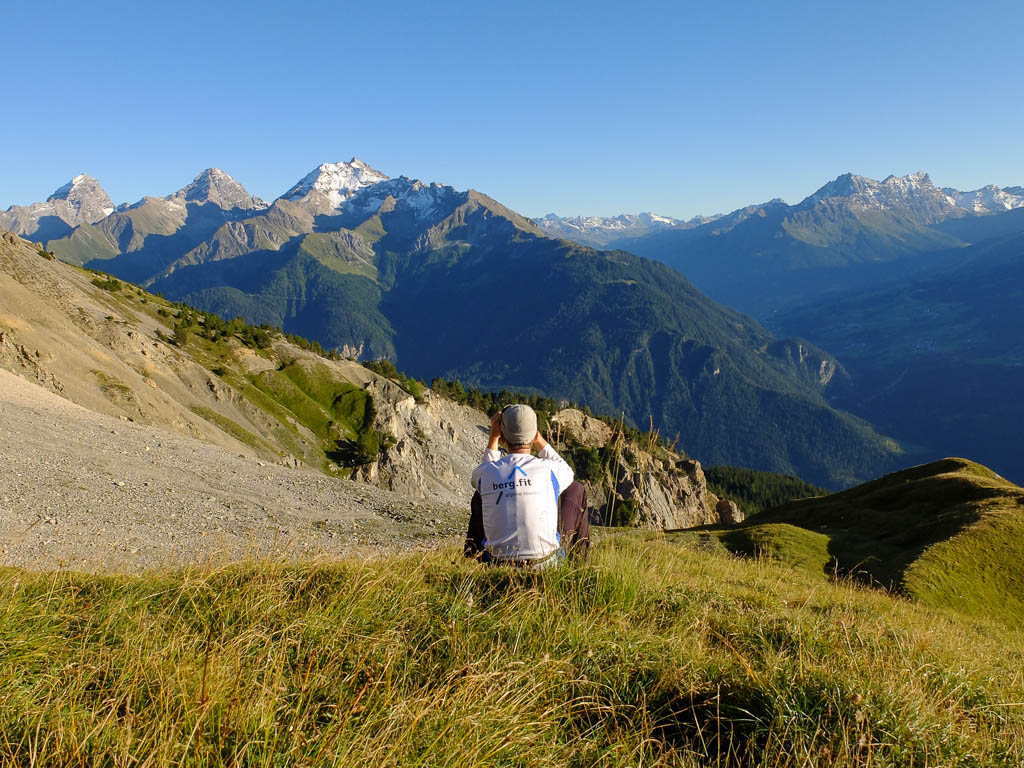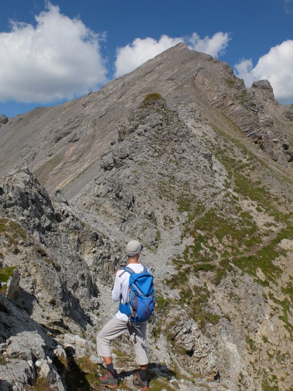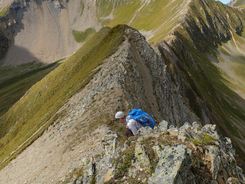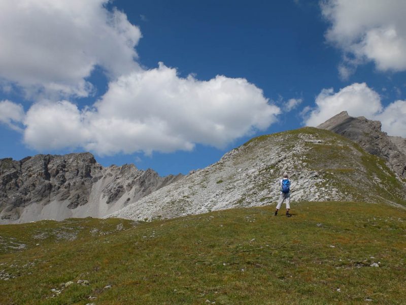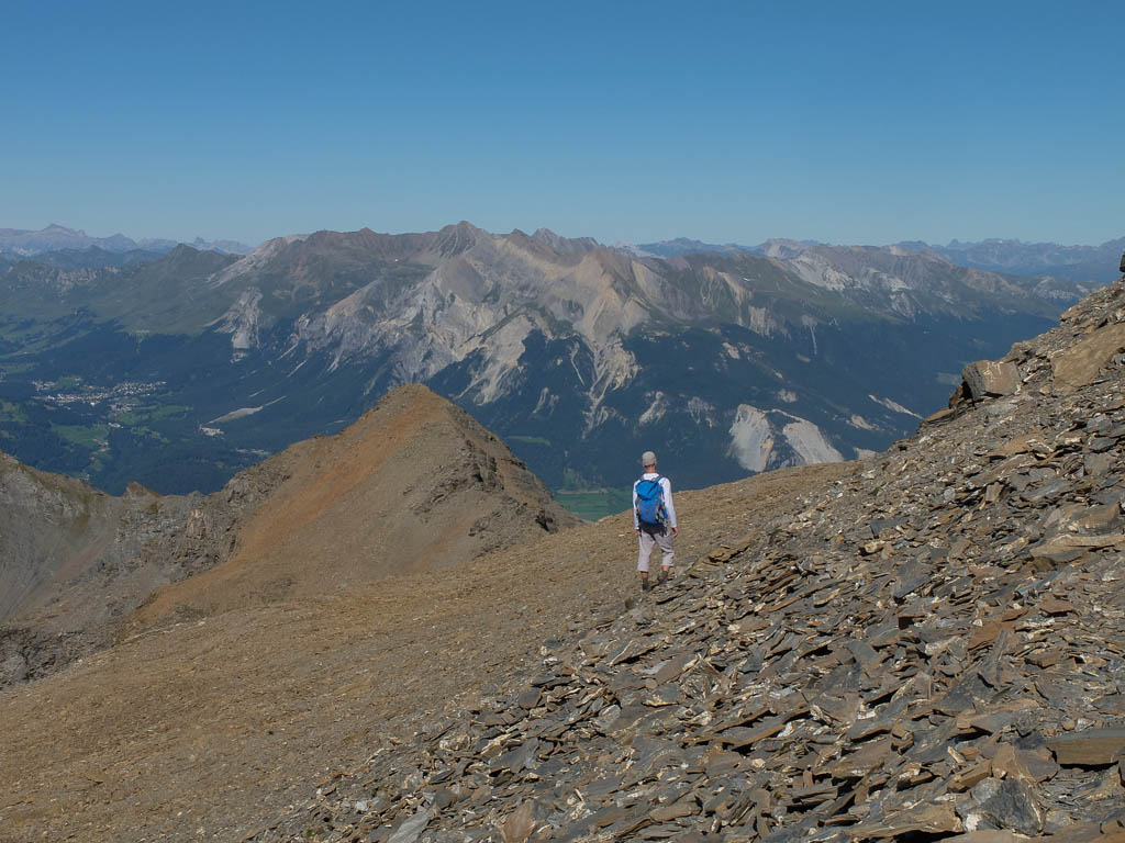 Während ich mich voller Begeisterung dem Fotografieren der Alpenblumen widme, ist Guido schon ein gutes Stück weiter den grasdurchsetzten Westgrats des Piz Linards hinaufgestiegen: