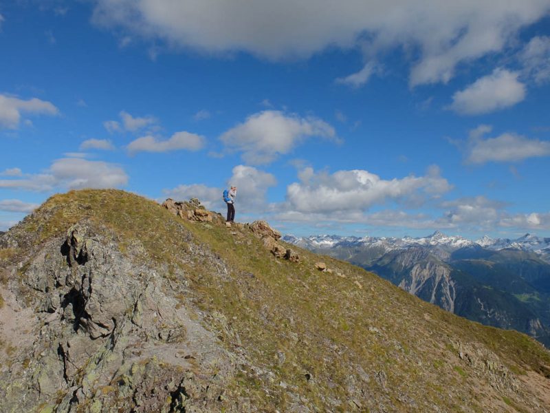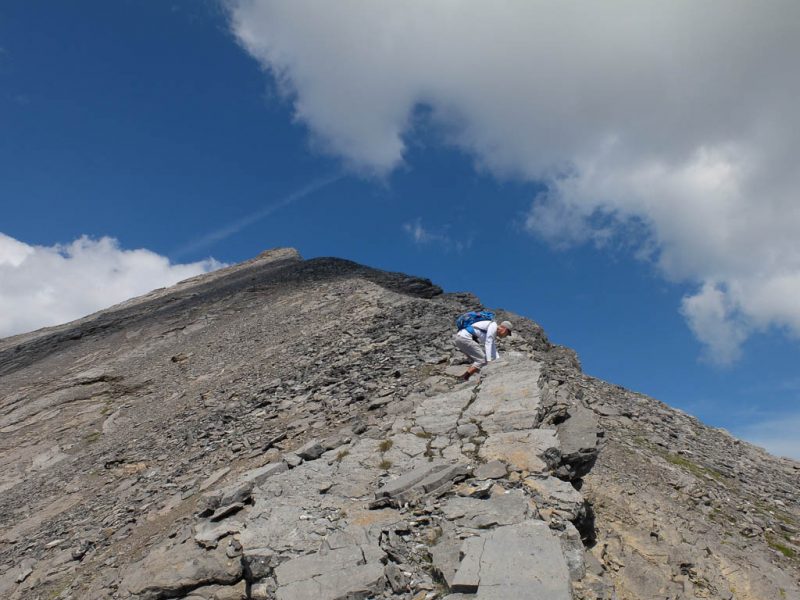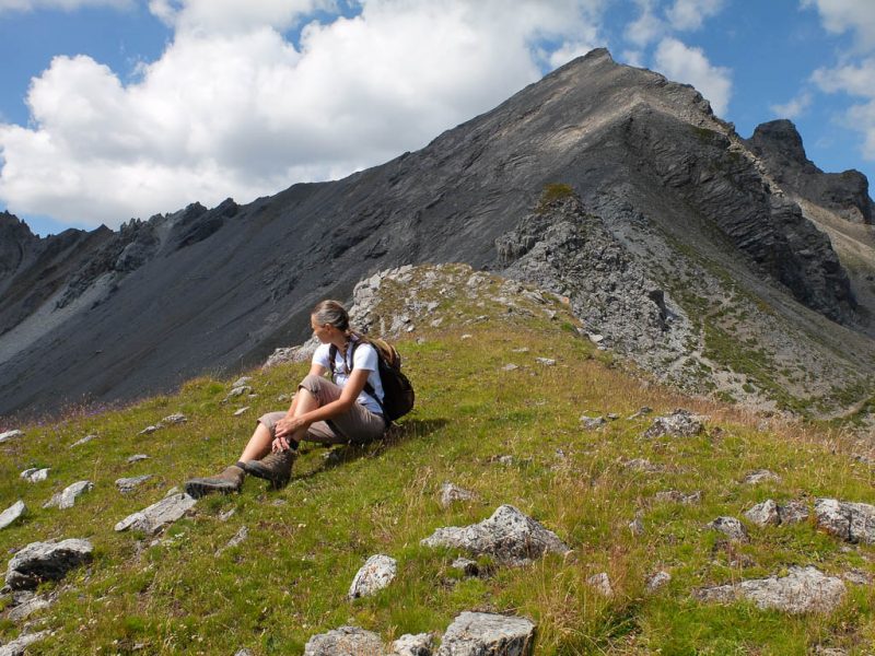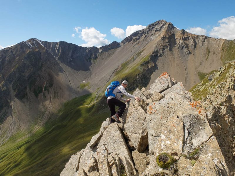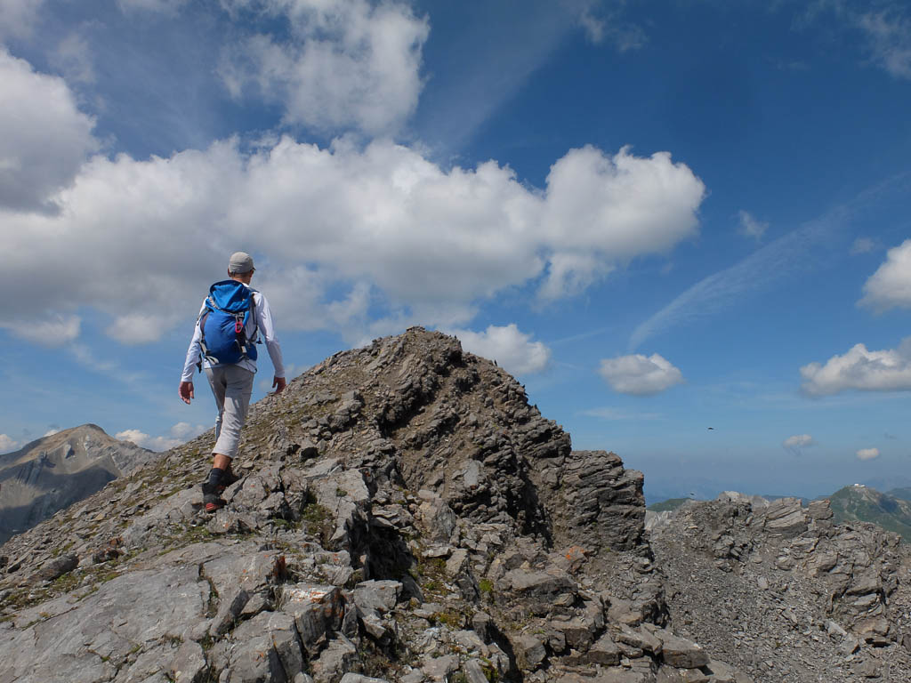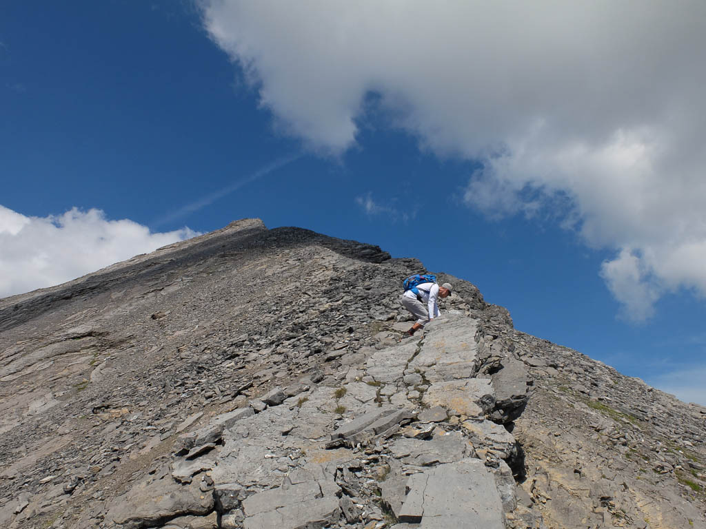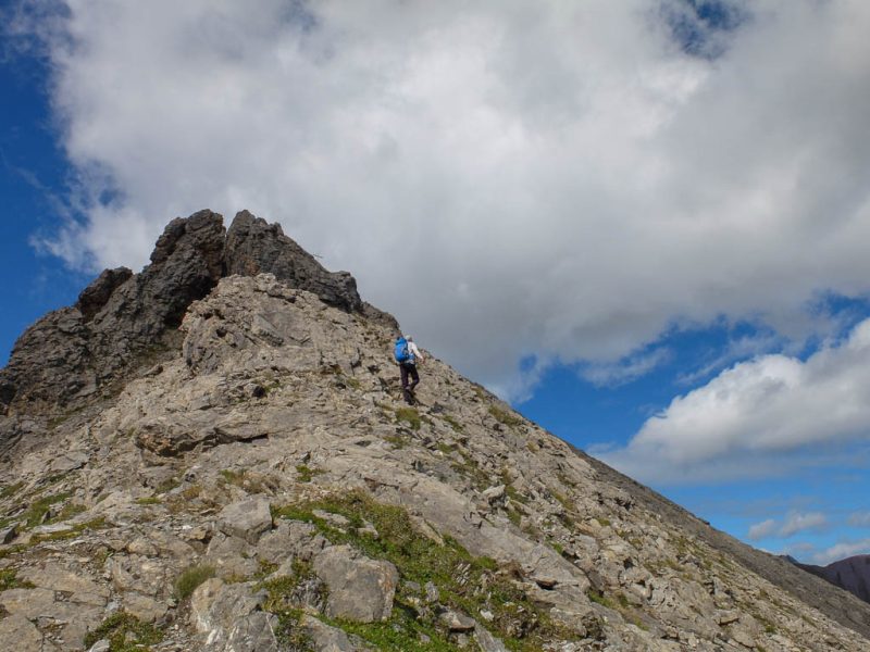 Während ich mich voller Begeisterung dem Fotografieren der Alpenblumen widme, ist Guido schon ein gutes Stück weiter den grasdurchsetzten Westgrats des Piz Linards hinaufgestiegen: