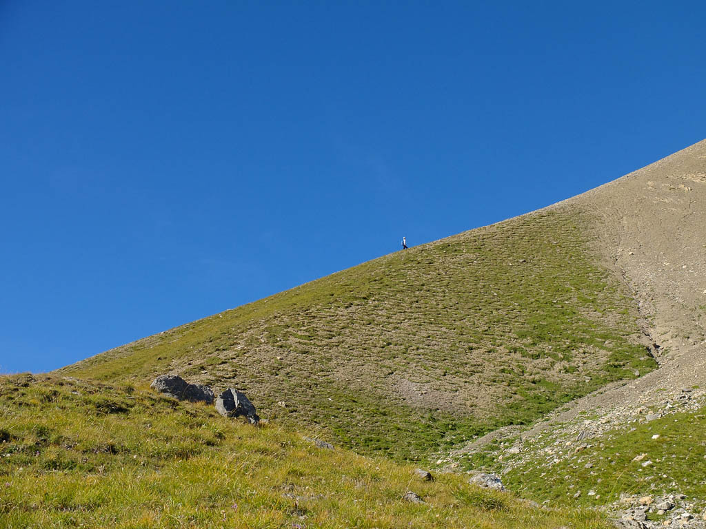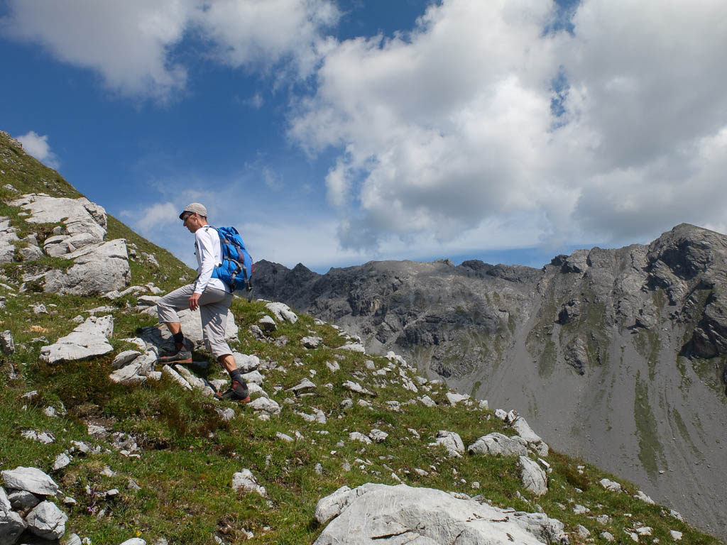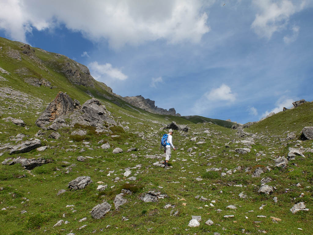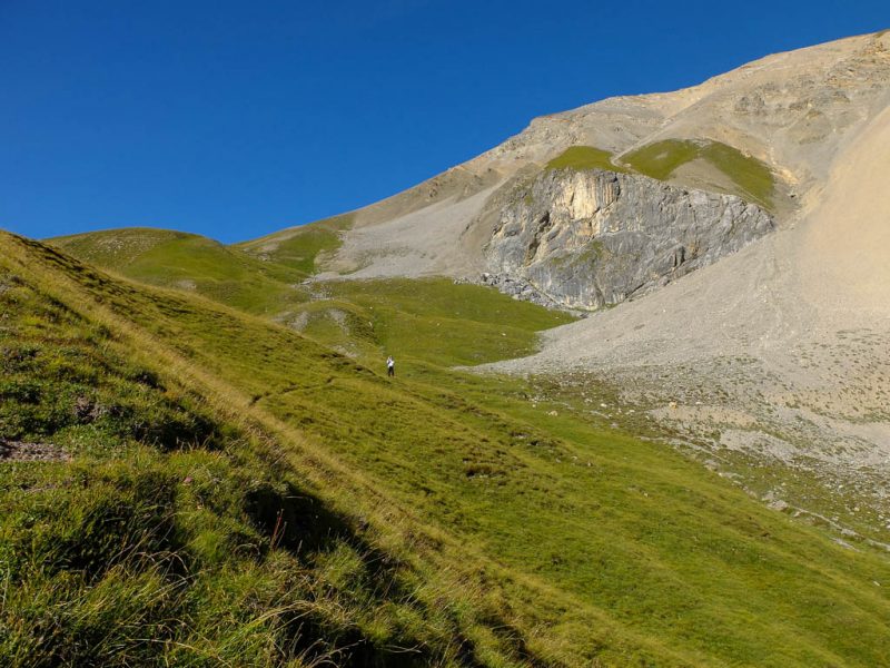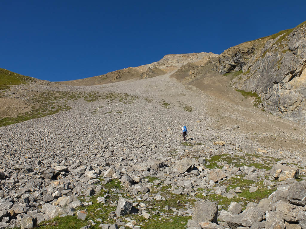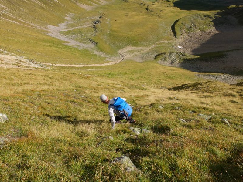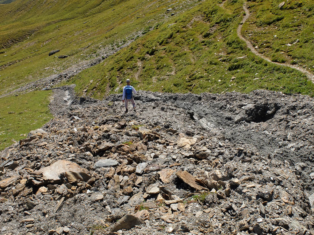 Eine halbe Stunde später steigt Guido über das Geröll, über das wir aufgestiegen sind, ab. Ich wähle stattdessen den für mich einfacheren Weg über Gras: