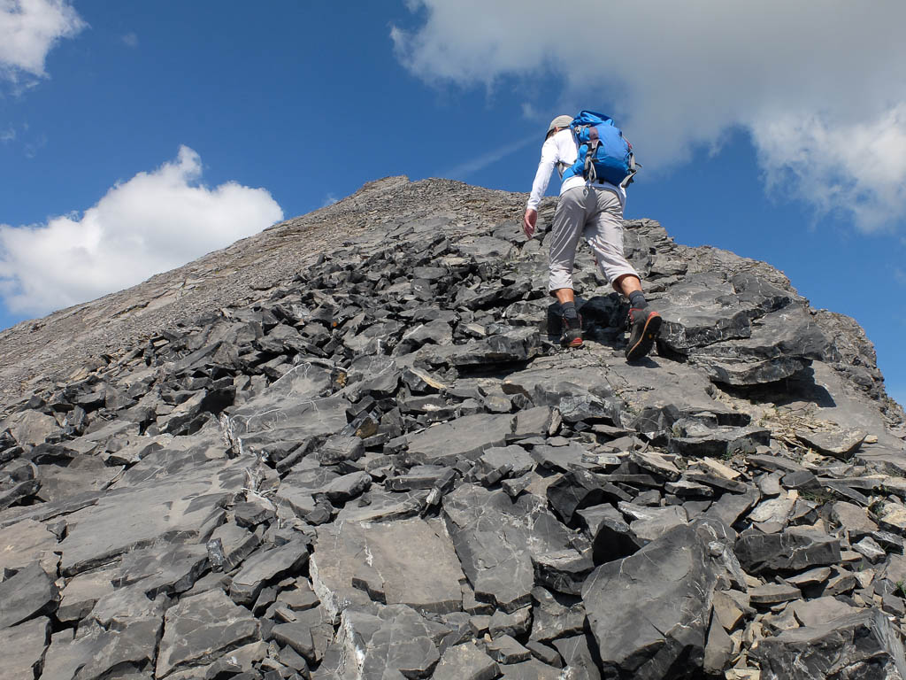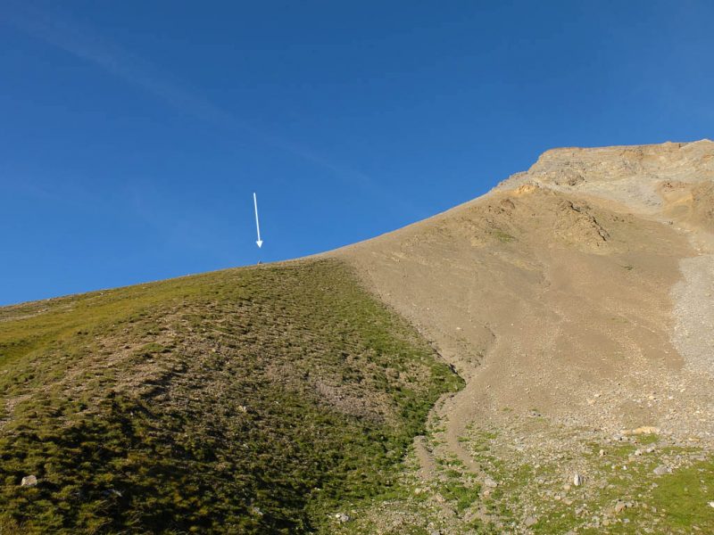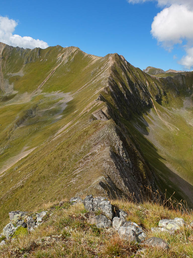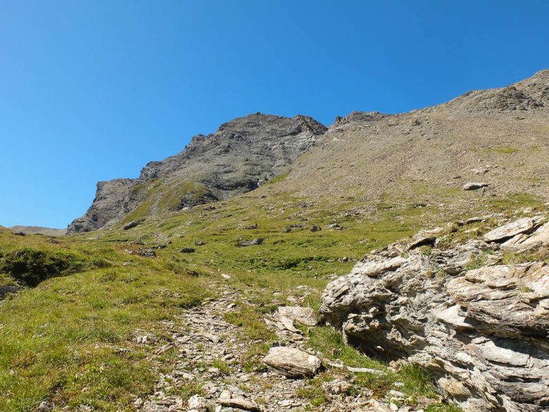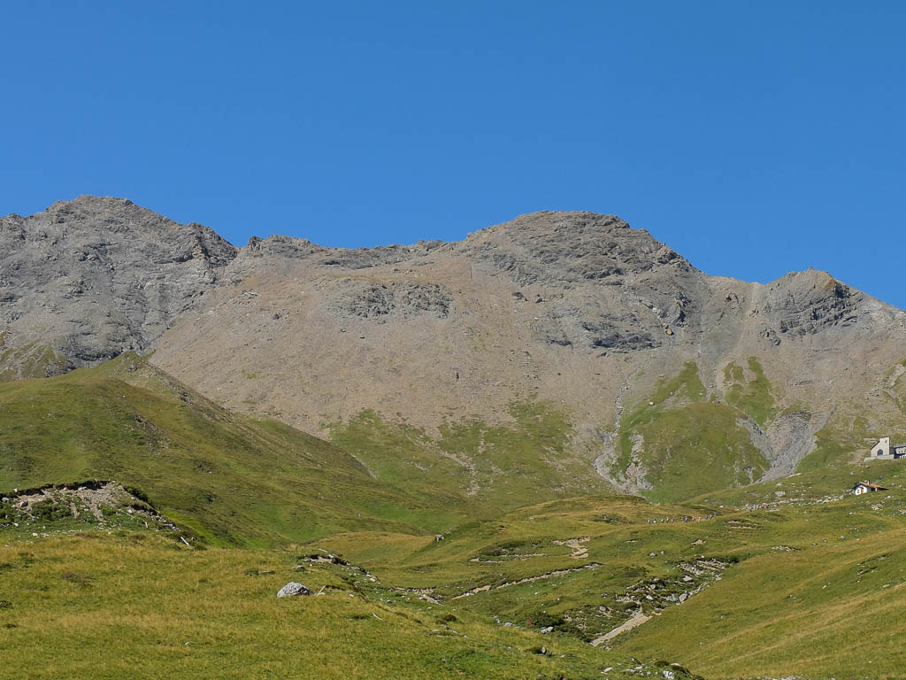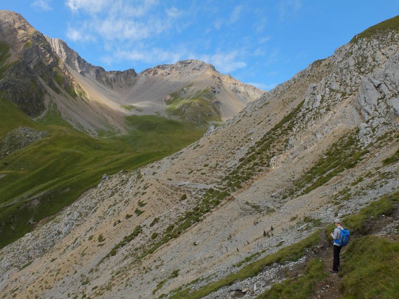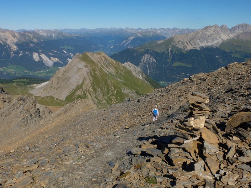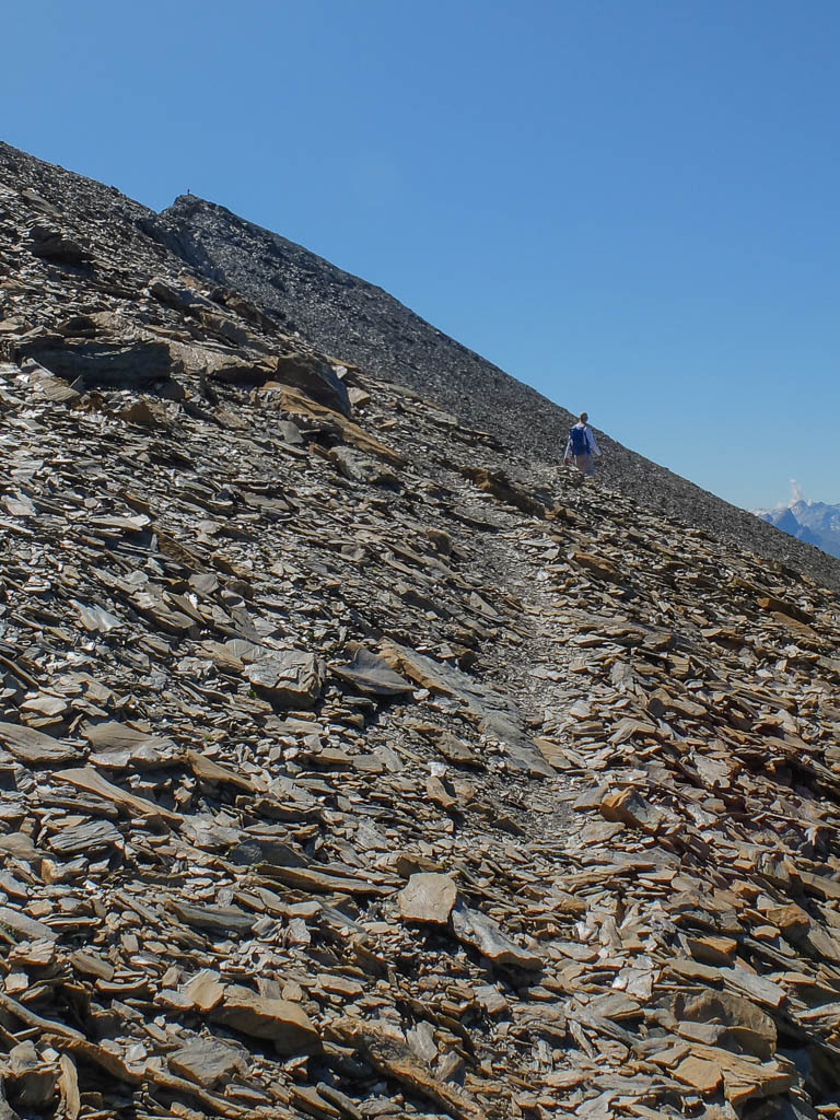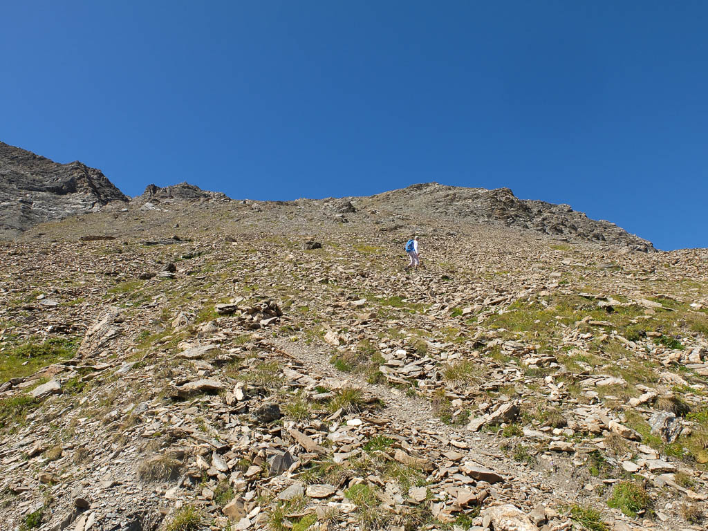 Eine halbe Stunde später steigt Guido über das Geröll, über das wir aufgestiegen sind, ab. Ich wähle stattdessen den für mich einfacheren Weg über Gras:
