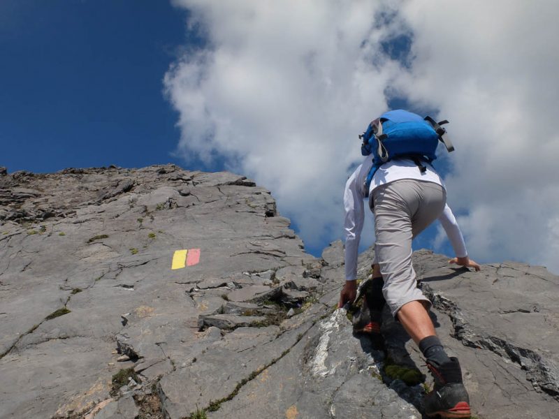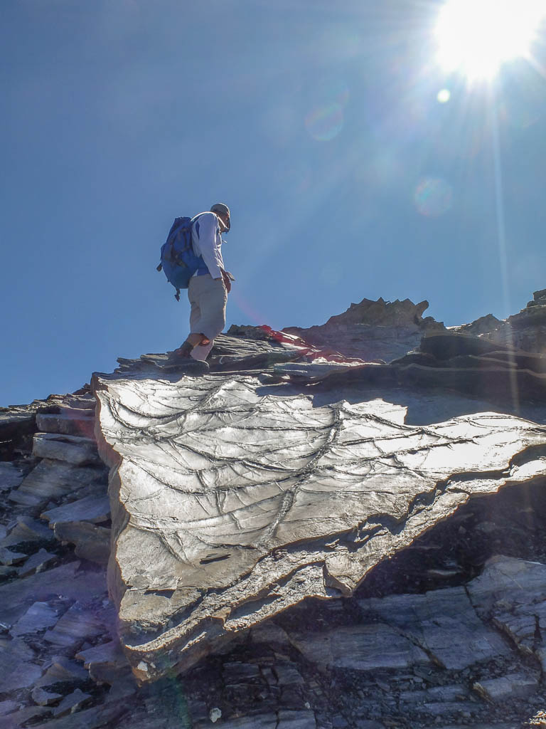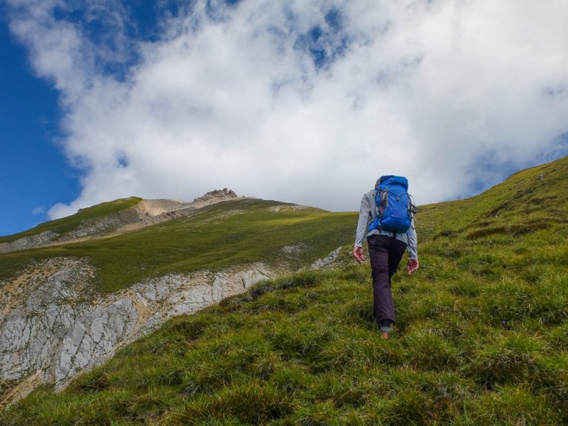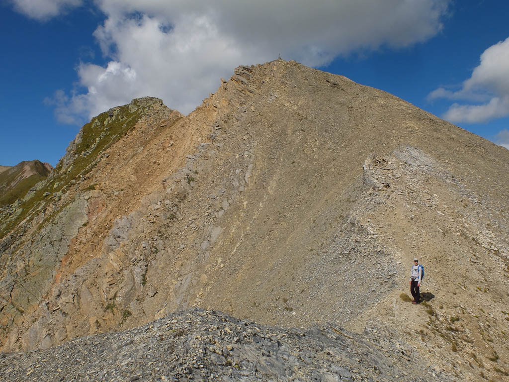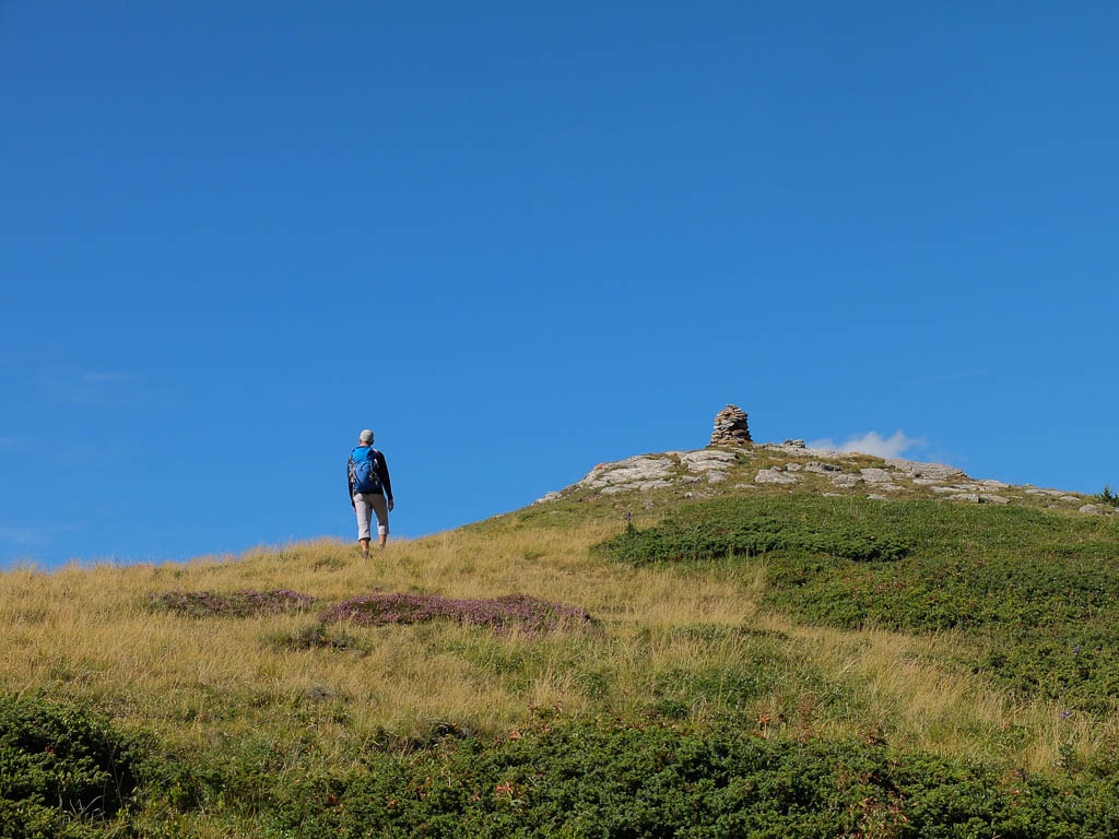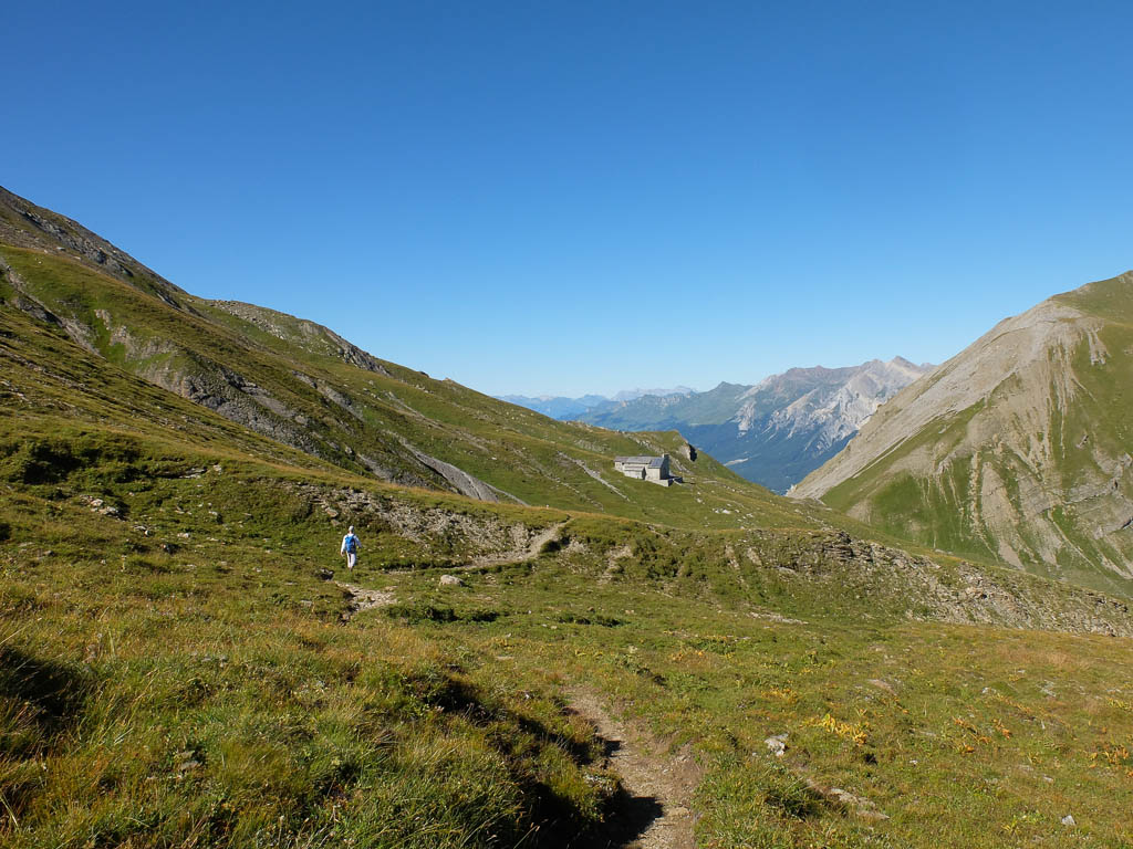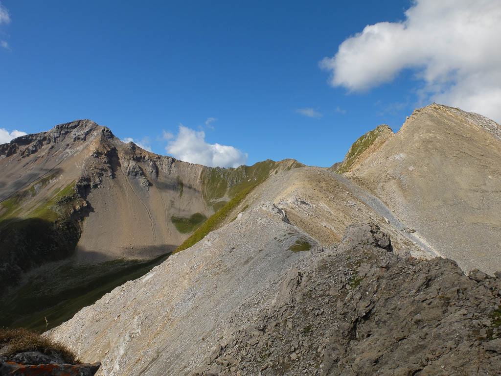 Eine halbe Stunde später steigt Guido über das Geröll, über das wir aufgestiegen sind, ab. Ich wähle stattdessen den für mich einfacheren Weg über Gras:
