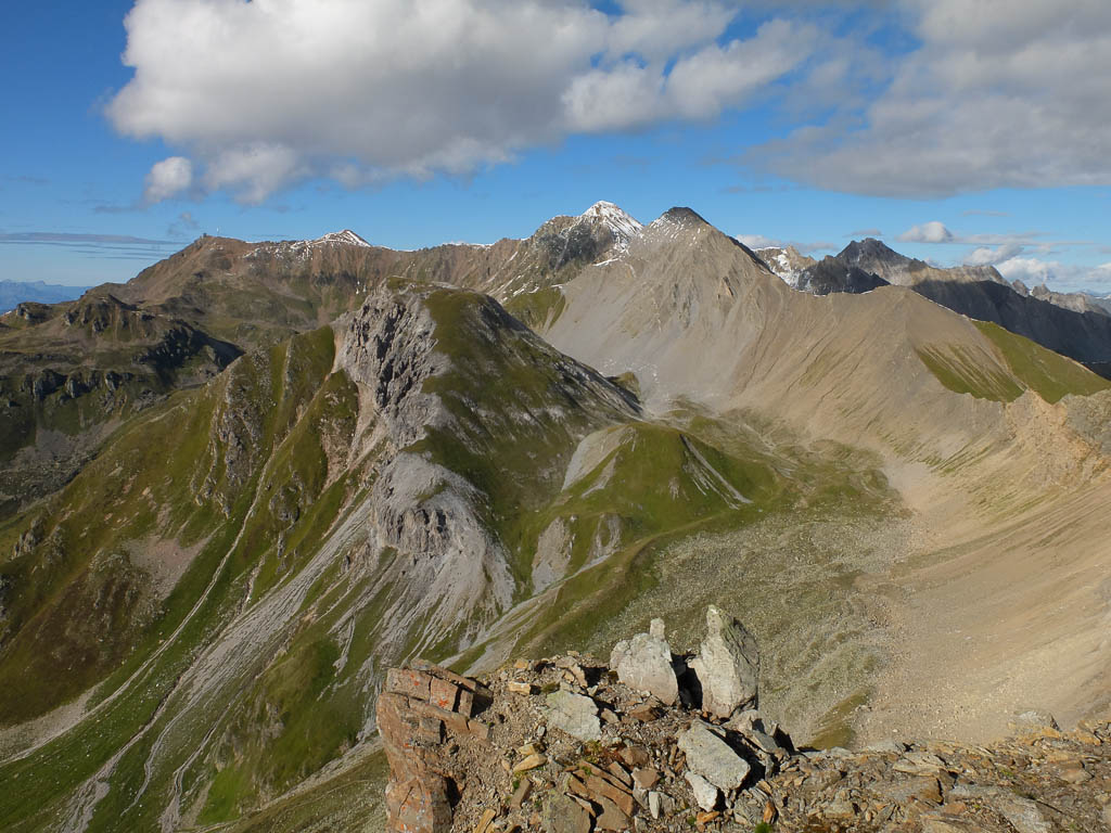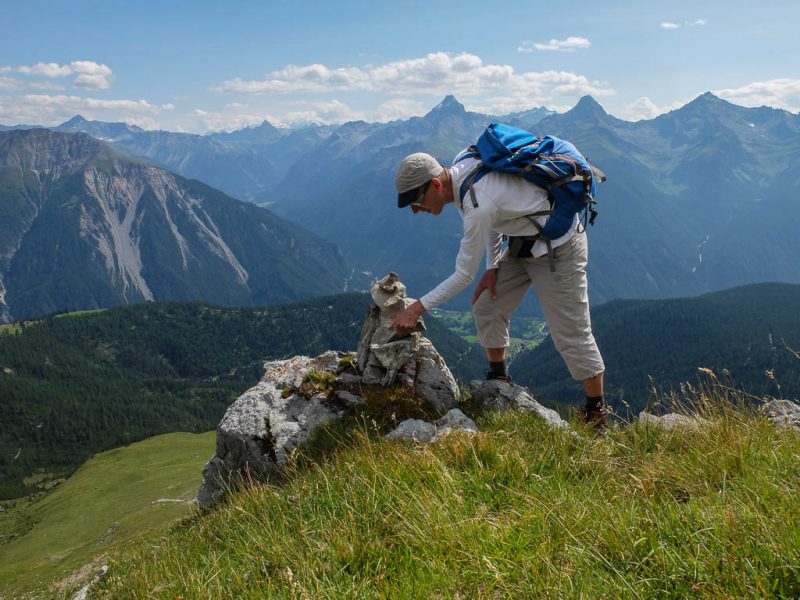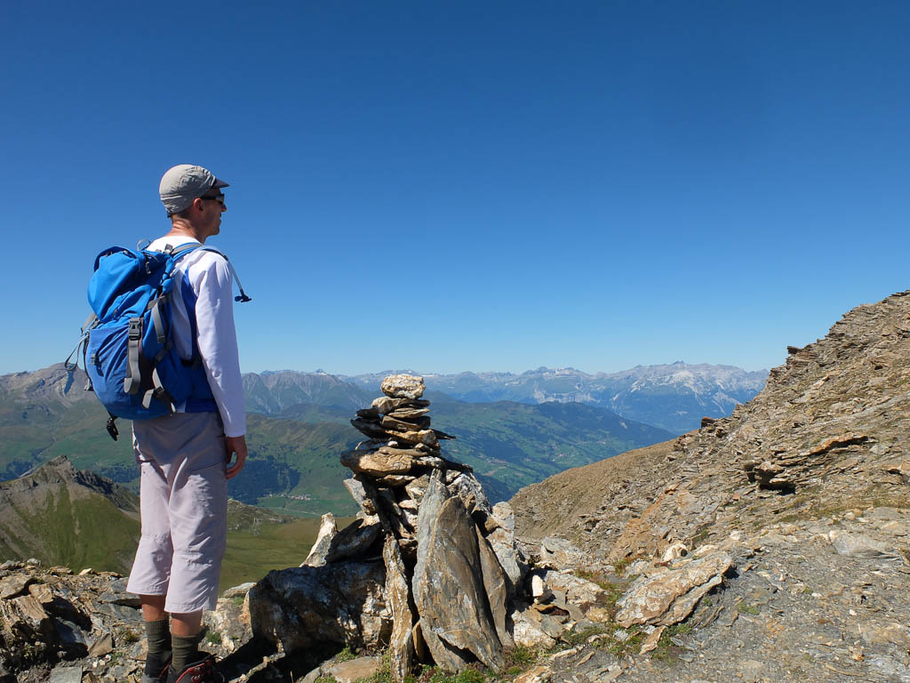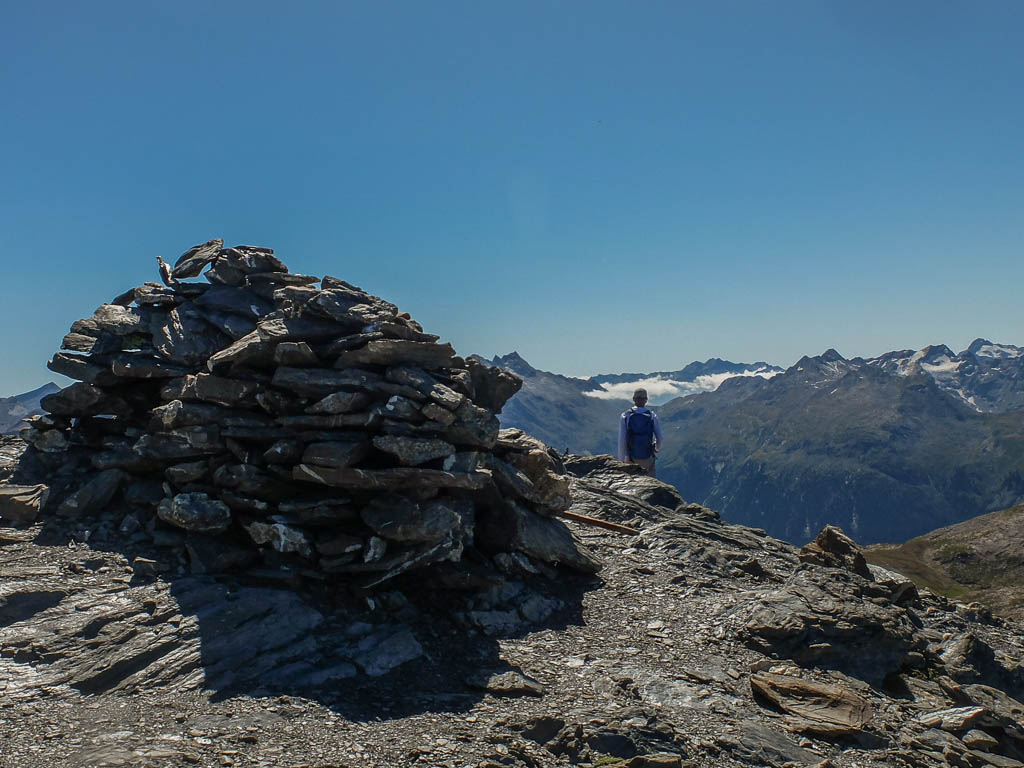 Ich folge ihm bis auf rund 2400 Meter Höhe und mache dort Halt, weil ich sehe, dass Guido wieder absteigt: Er hält einen weiteren Aufstieg bis zum Gipfel des Piz Linards über den Westgrat zwar prinzipiell für möglich, aber aufgrund der fortgeschrittenen Uhrzeit nicht für ratsam. Auf dem höchsten heute erreichten Punkt errichtet Guido zur Orientierung für den nächsten Aufstiegsversuch über den Westgrat einen Steinmann:
