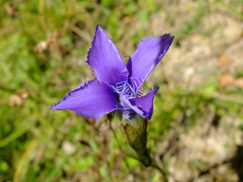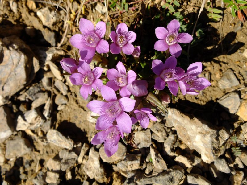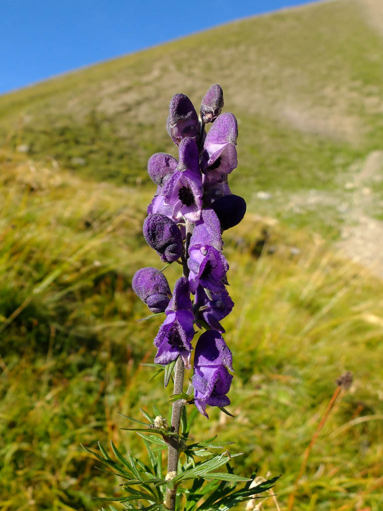 Je höher wir kommen, desto kleiner wird das Geröll und desto mühsamer wird es, darüber aufzusteigen. Ich bin daher heilfroh, als wir wieder mit Gras durchsetzte Flächen erreichen. Aber nicht nur Gras wächst hier, ich entdecke Blauen Eisenhut, Fransenenzian, Kranzenzian und Edelweiß:
