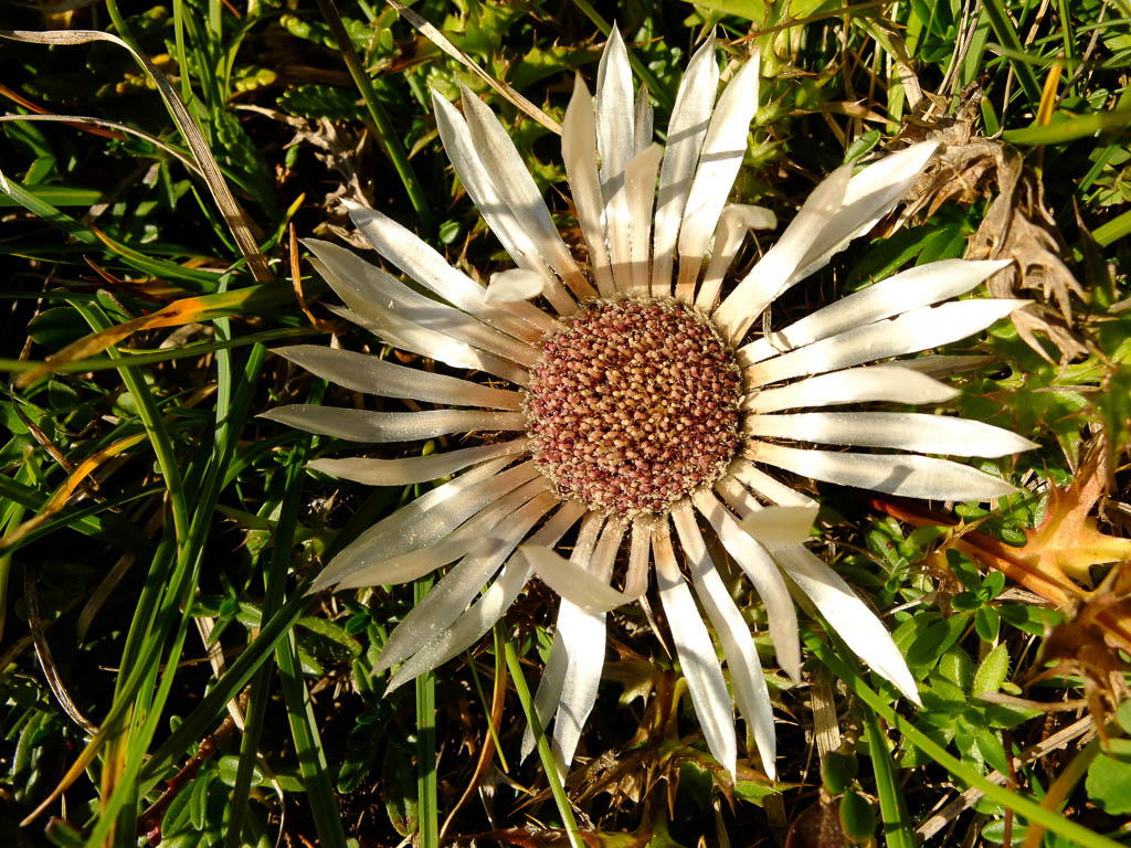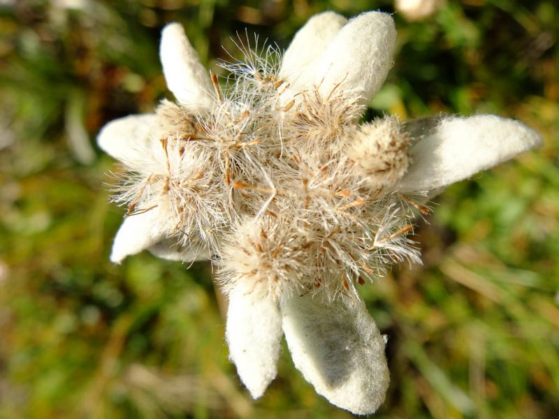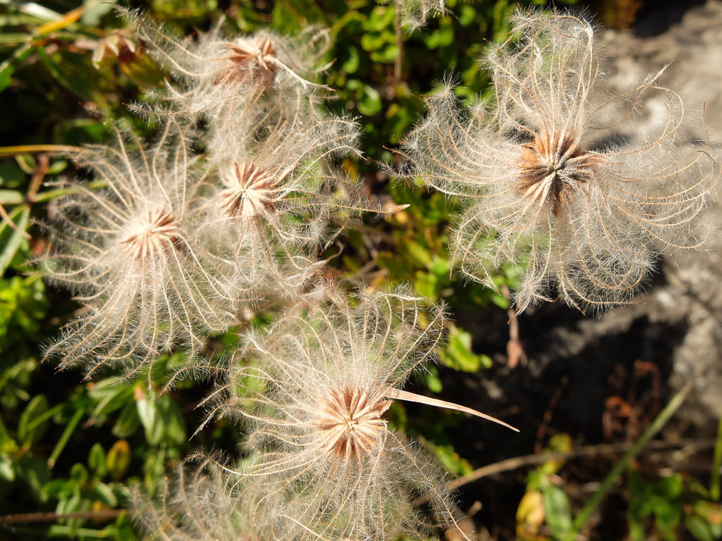 Auf der Grasfläche in der Nähe des Brunnens sitzend genießen wir gut eine halbe Stunde lang gemeinsam den Blick auf die Berge und auf die Wunder, die in unserer Nähe zu bestaunen sind, so zum Beispiel die Blüten der Silberdistel und die Samenstände der Silberwurz: