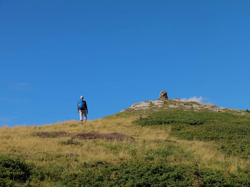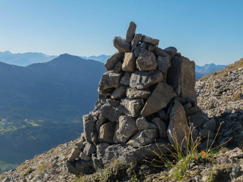 Zurück auf der Grasfläche von Scasaluir ist der errichtete Steinmann gut zu erkennen: