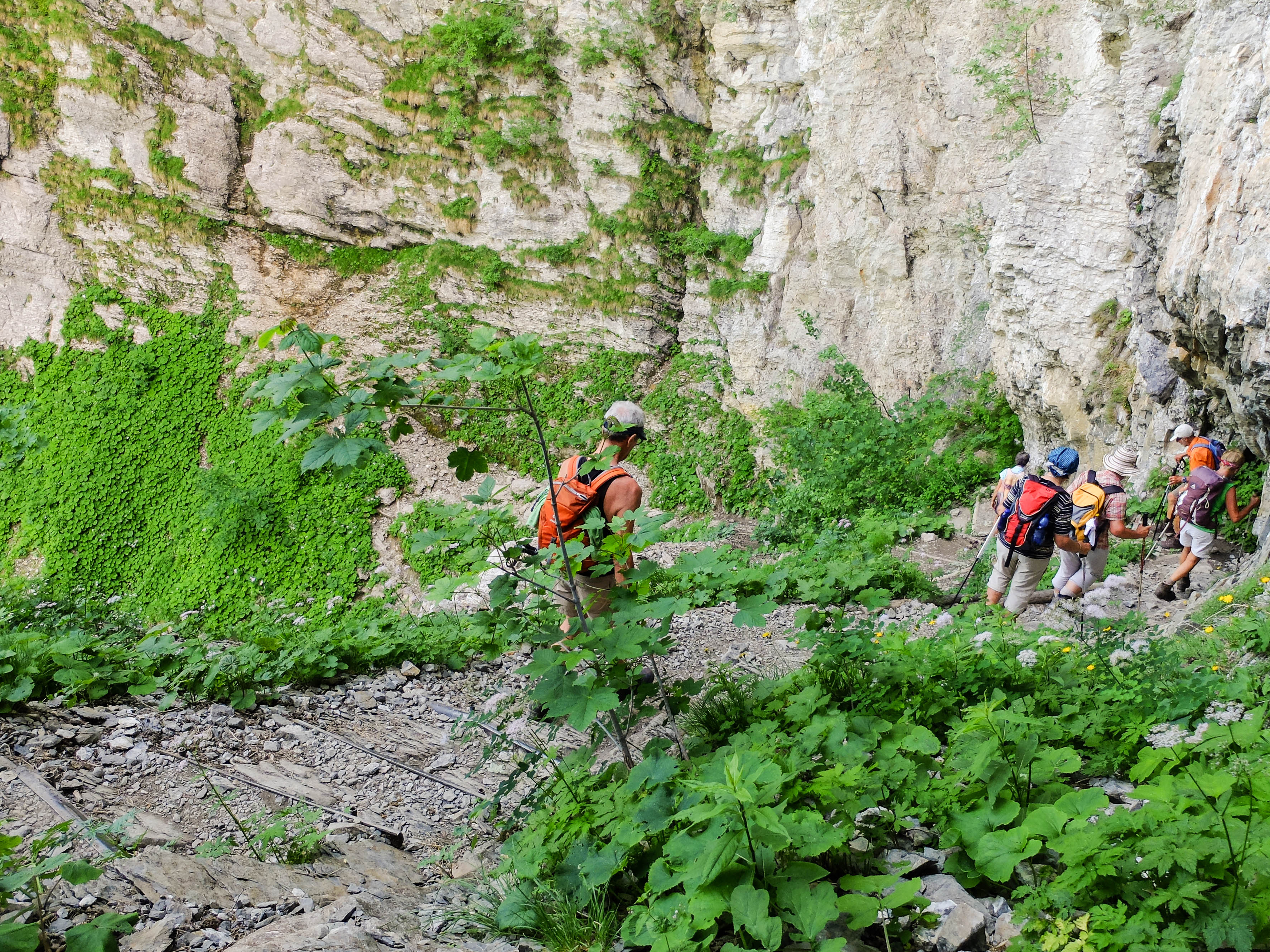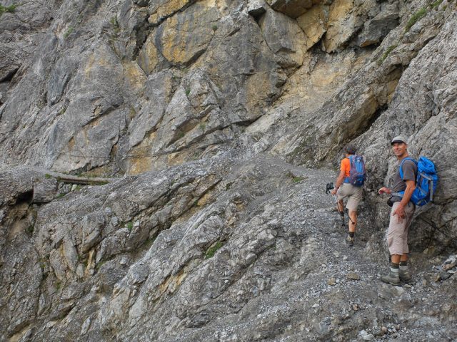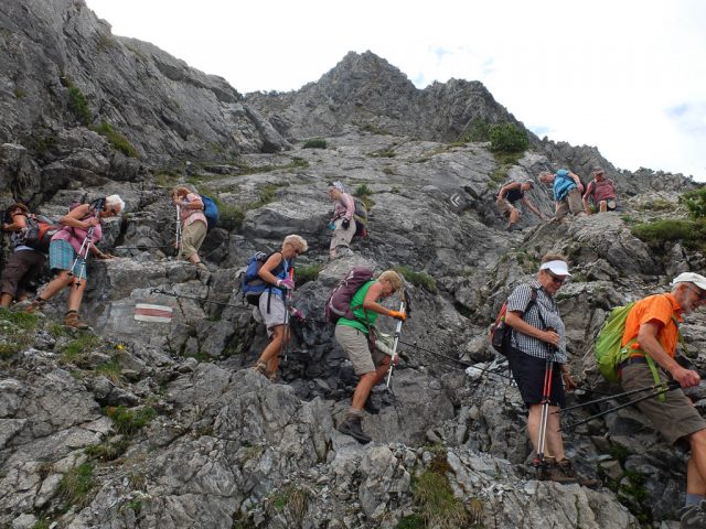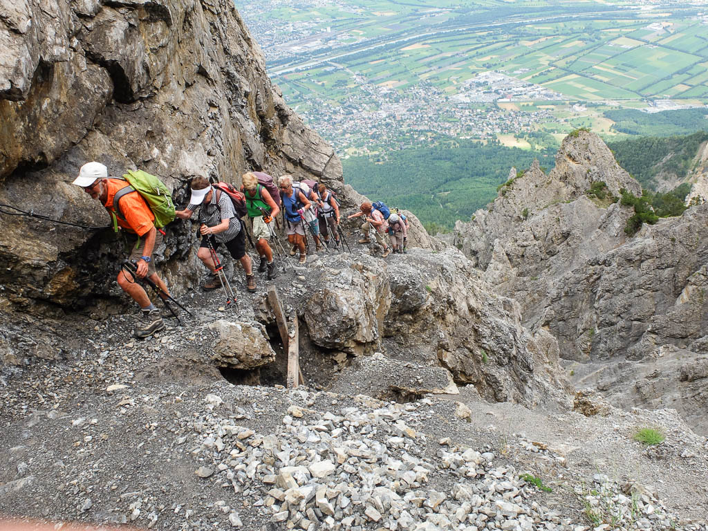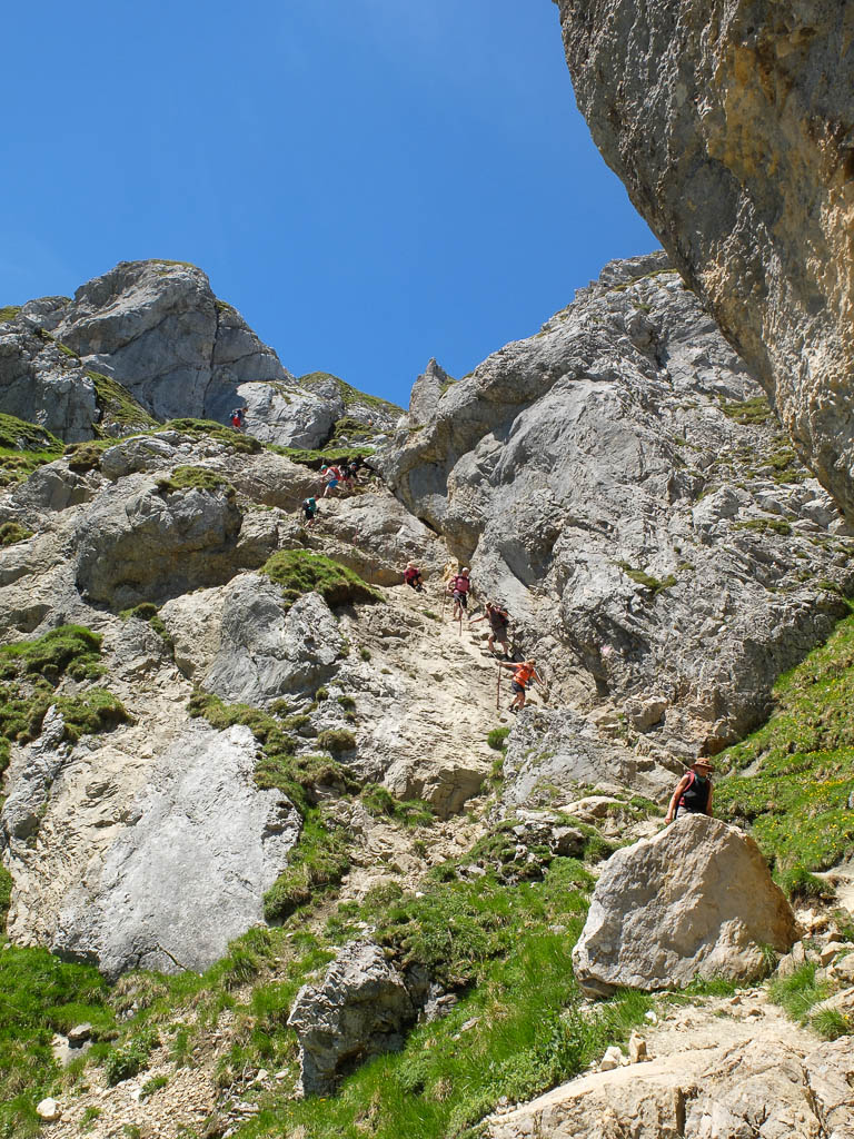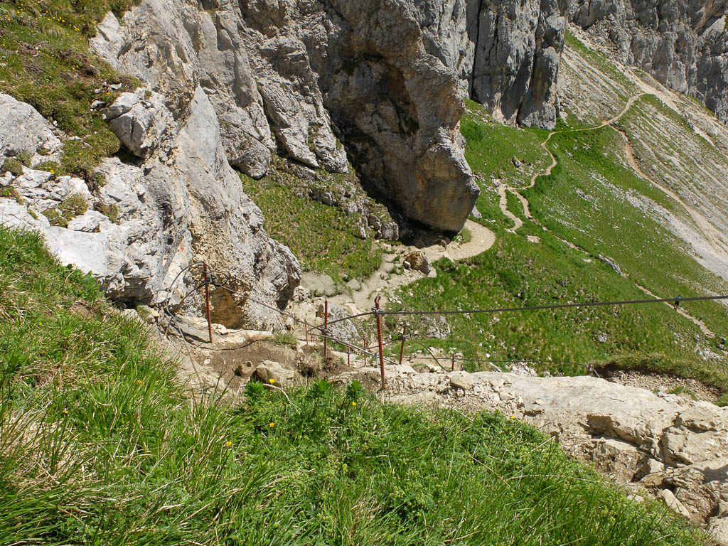 Der Fürstensteig war ein 1898 in die Nordwestwand des Alpsitz geschlagener Wanderweg der Schwierigkeiststufe T3. Auch wenn der Fürstensteig recht breit angelegt und an schwierigeren Passagen gut mit Drahtseilen gesichert war, erforderte er vollkommene Aufmerksamkeit. Ein Absturz in dem steilen Gelände wäre sehr ungesund! Ich fand es bewundernswert, dass auch die älteren Teilnehmer der Tour, von denen einige weit über 70 waren, die Strecke problemlos bewältigten. Es war ganz klar zu sehen, Bergwandern hielt fit! Impressionen vom Fürstensteig:
