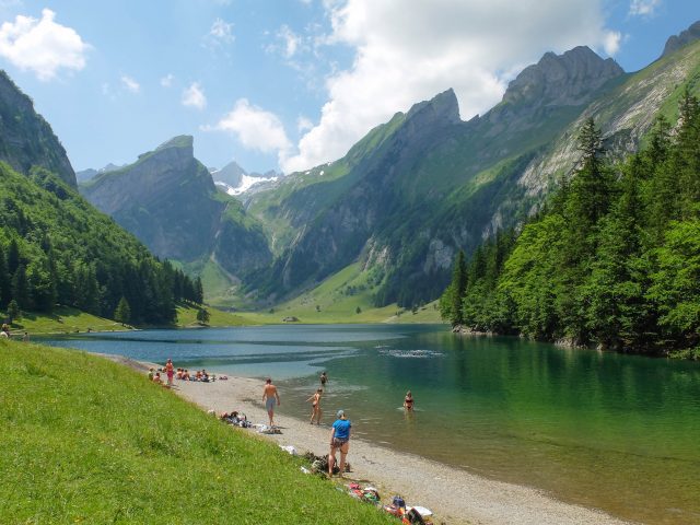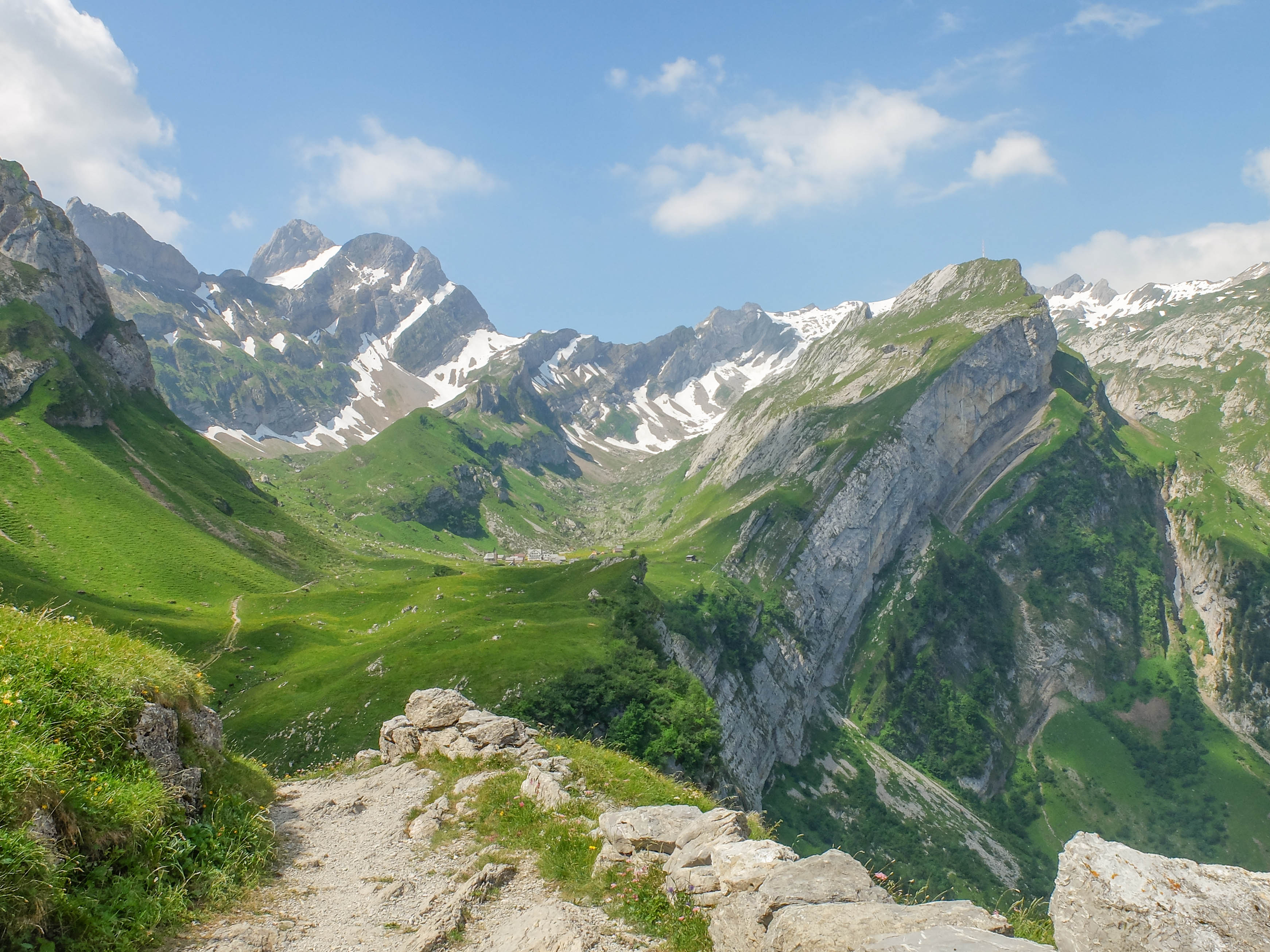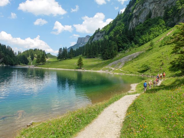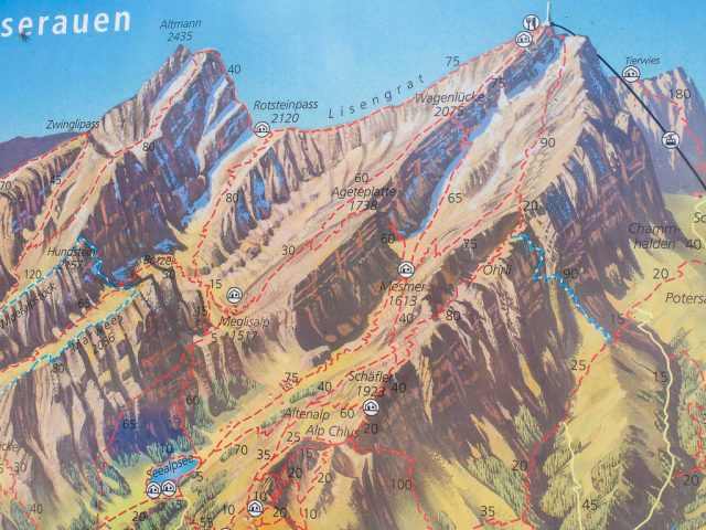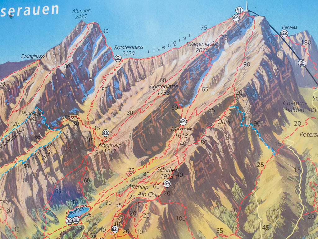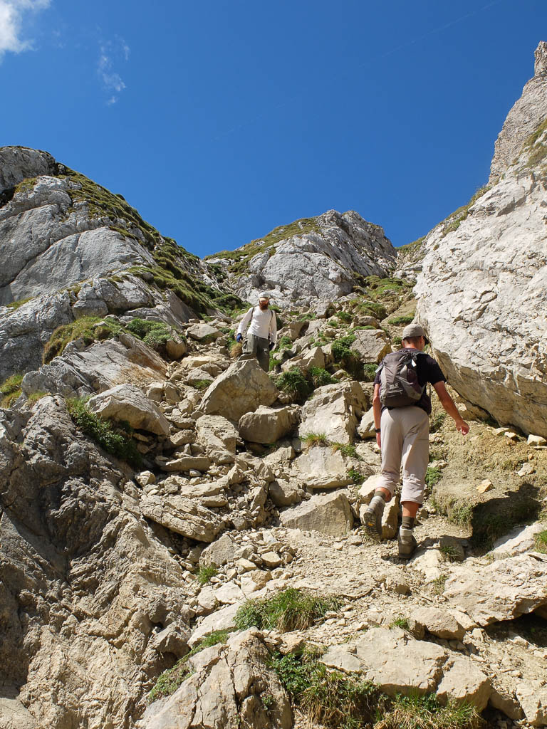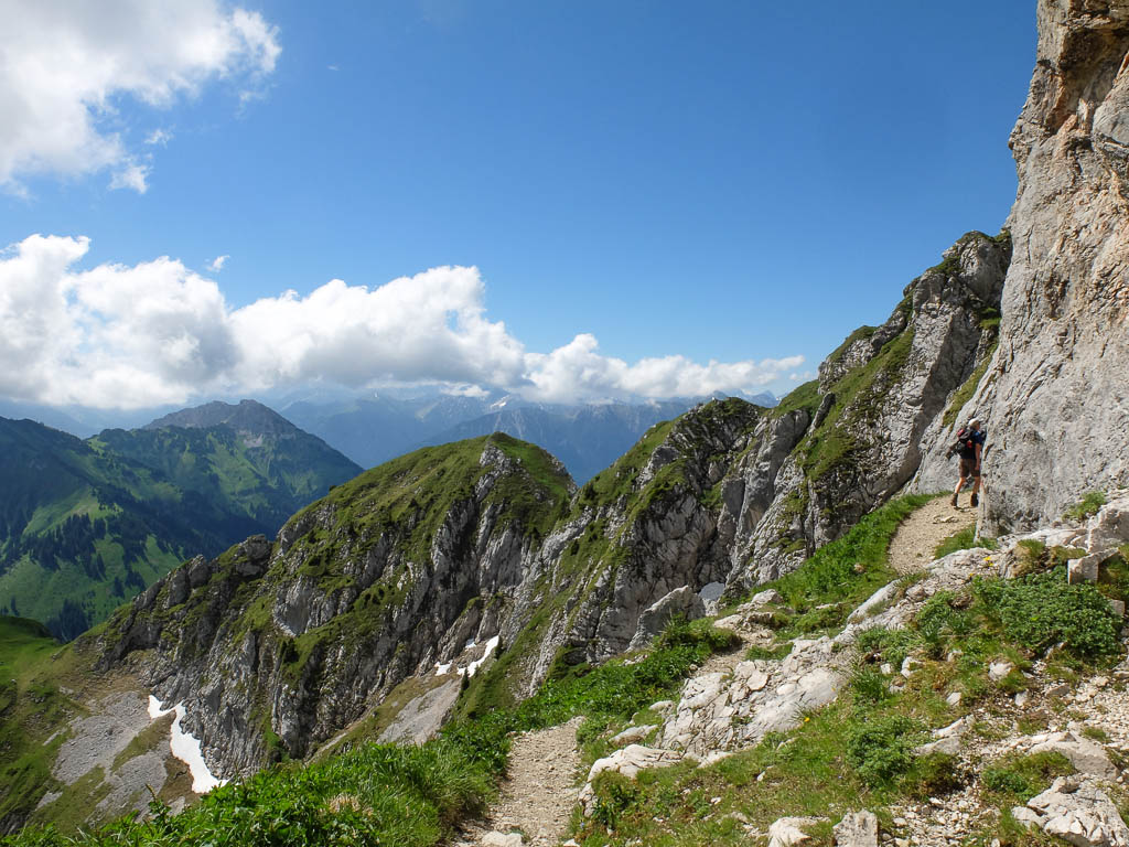 Der Fürstensteig war ein 1898 in die Nordwestwand des Alpsitz geschlagener Wanderweg der Schwierigkeiststufe T3. Auch wenn der Fürstensteig recht breit angelegt und an schwierigeren Passagen gut mit Drahtseilen gesichert war, erforderte er vollkommene Aufmerksamkeit. Ein Absturz in dem steilen Gelände wäre sehr ungesund! Ich fand es bewundernswert, dass auch die älteren Teilnehmer der Tour, von denen einige weit über 70 waren, die Strecke problemlos bewältigten. Es war ganz klar zu sehen, Bergwandern hielt fit! Impressionen vom Fürstensteig: