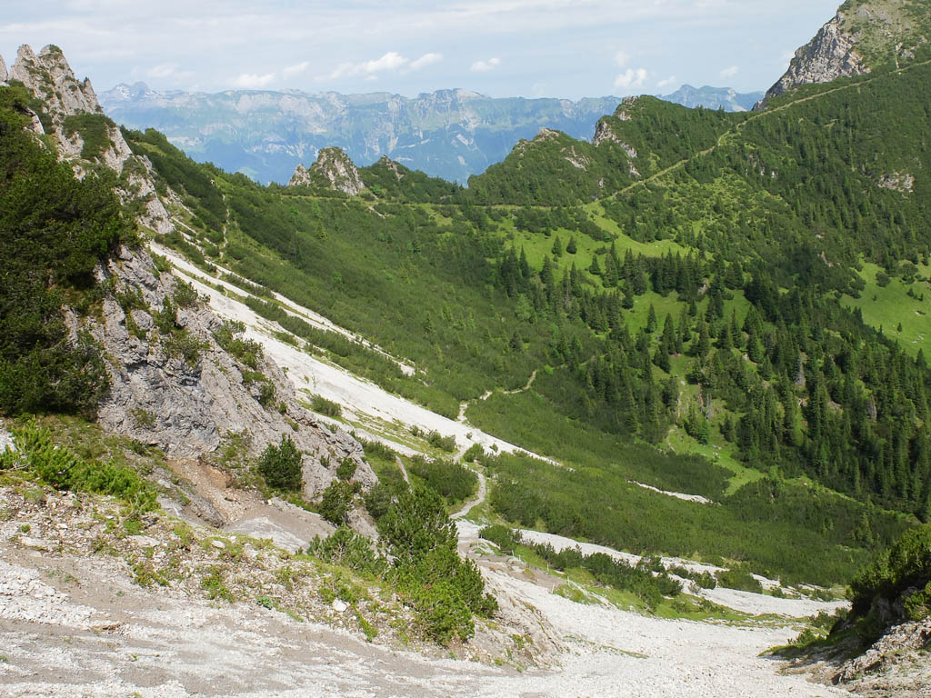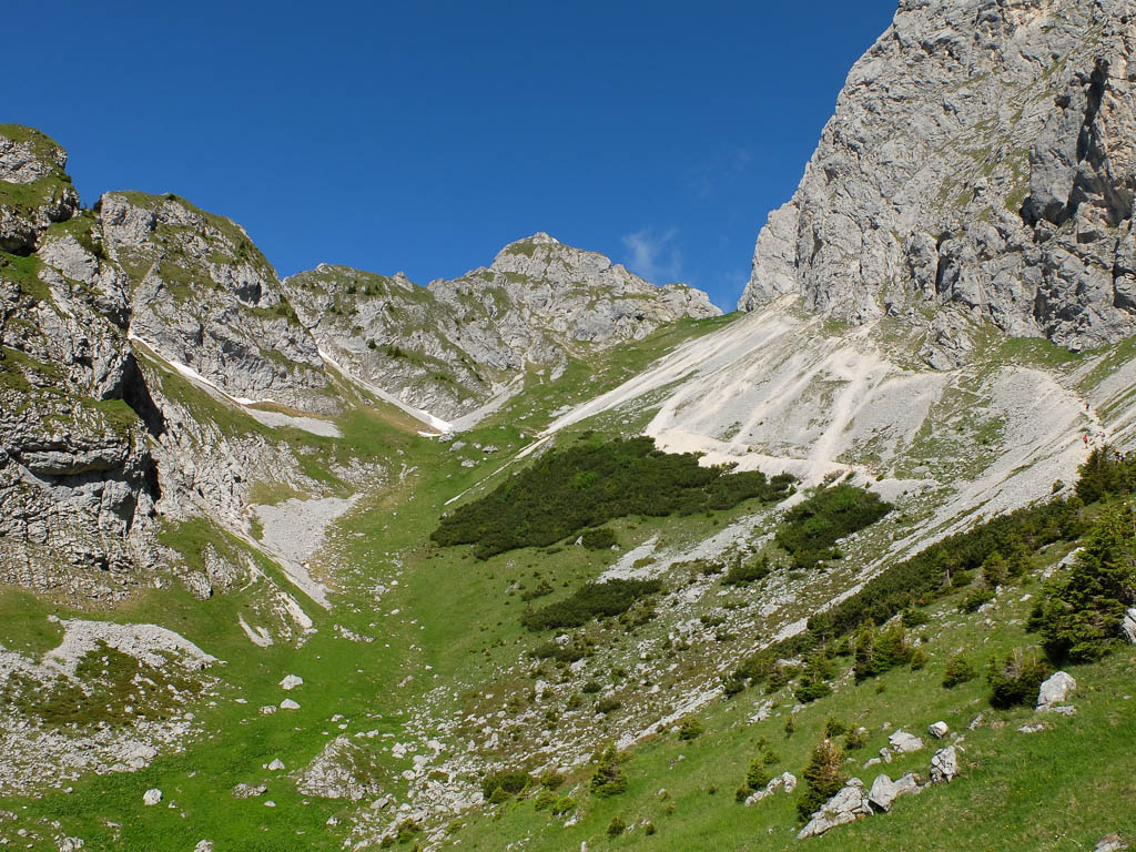 Hier lag der Galfeisattel, von dem aus es über ein Kar hinauf zum Bargällakamin ging. Der Blick während des Aufstiegs auf Kuegrat (2123 Meter) und Gafleispitz (1999 Meter), im Hintergrund waren die drei Schwestern, die Hausberge von Liechtenstein, zu sehen: