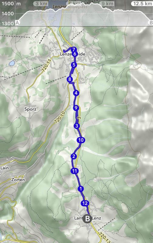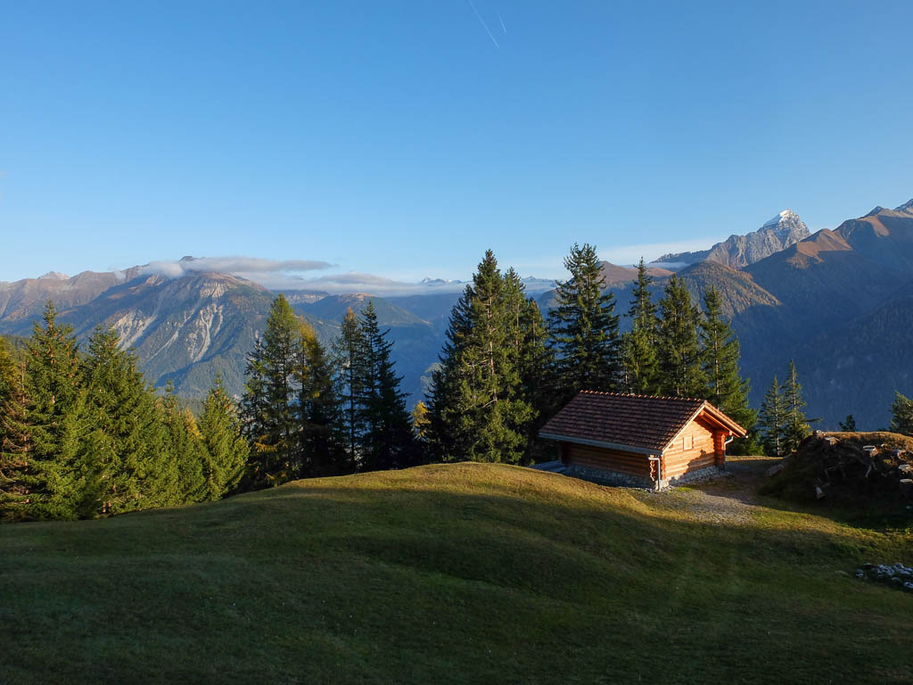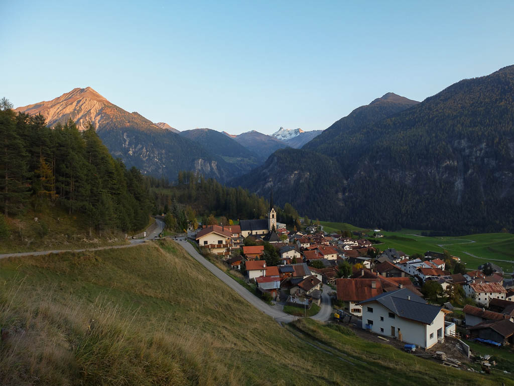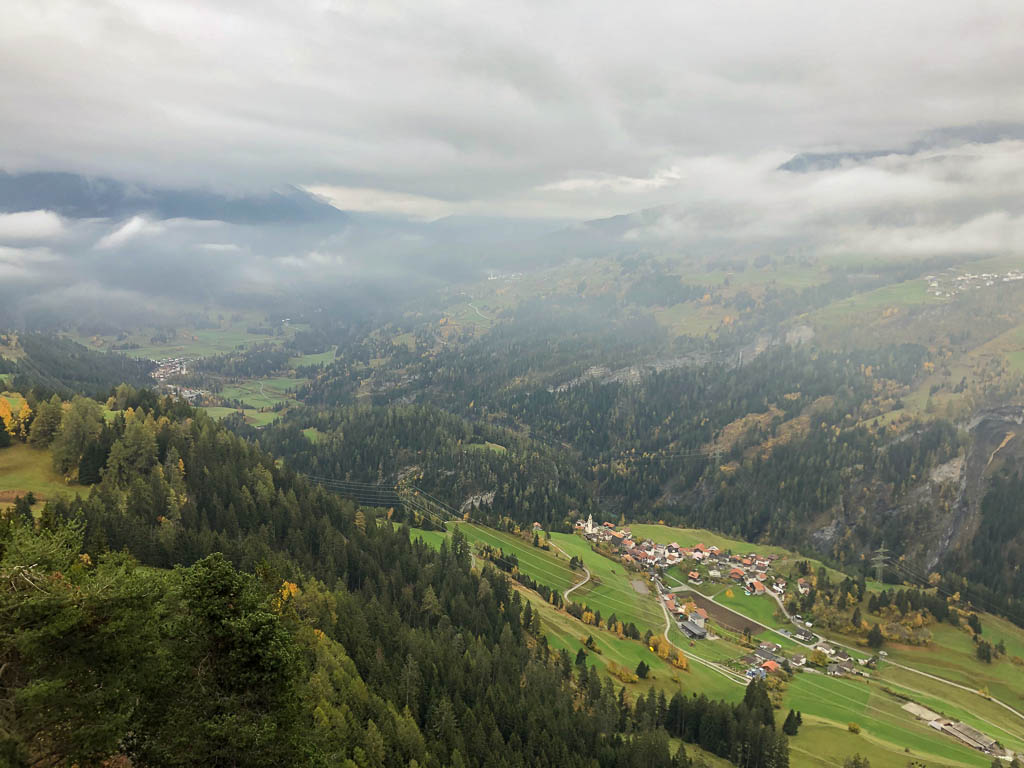 Der Pfeil zeigt auf das namensgebende Gipsfeld. Das Gipshorn ist laut SAC-Führer „Bündner Alpen 6“ über zwei Routen zu erreichen: Zum einen über den Nordostgrat, zum anderen über den Nidellöffel. Welche Route wir nehmen, wollen wir erst im Laufe der Wanderung entscheiden. Start der Tour ist wieder einmal der Bahnhof von Monstein. Von dort aus wandern wir über Monstein und Inneralp hinauf zur Alpsiedlung Mäschenboden. Der Blick von Mäschenboden talwärts: