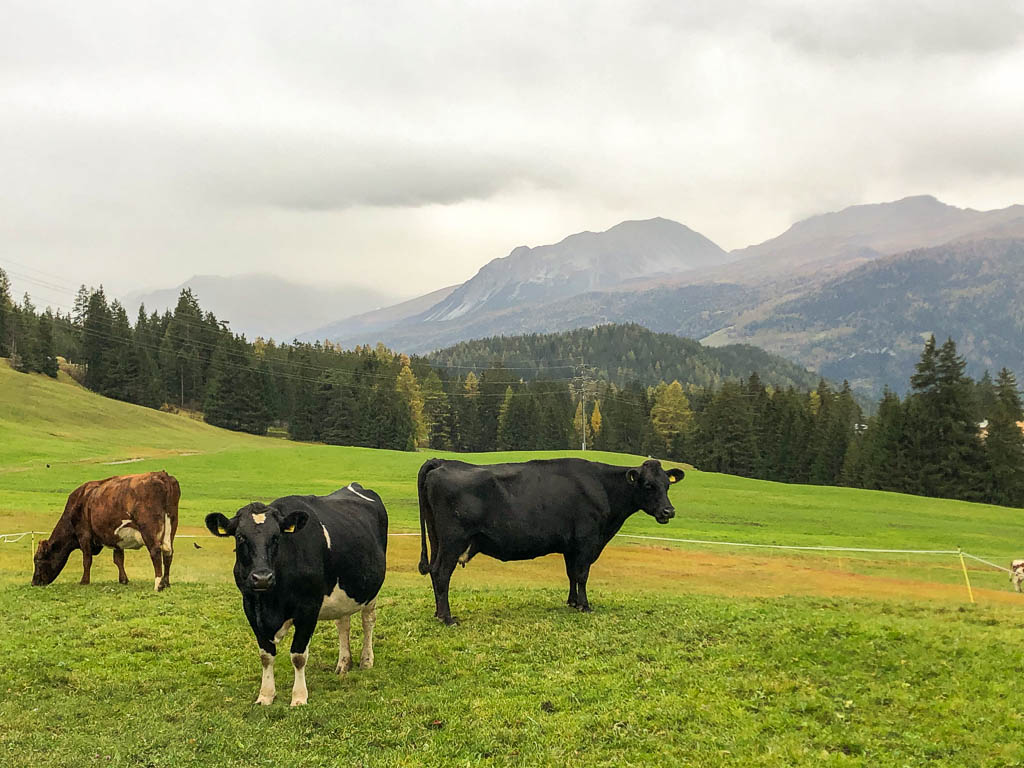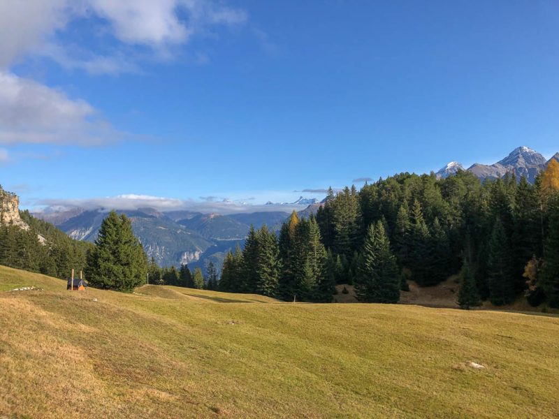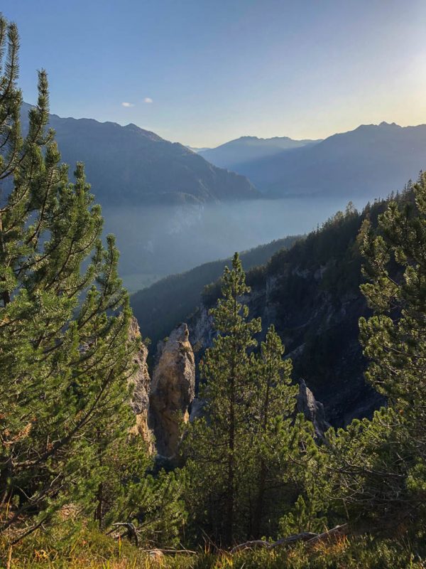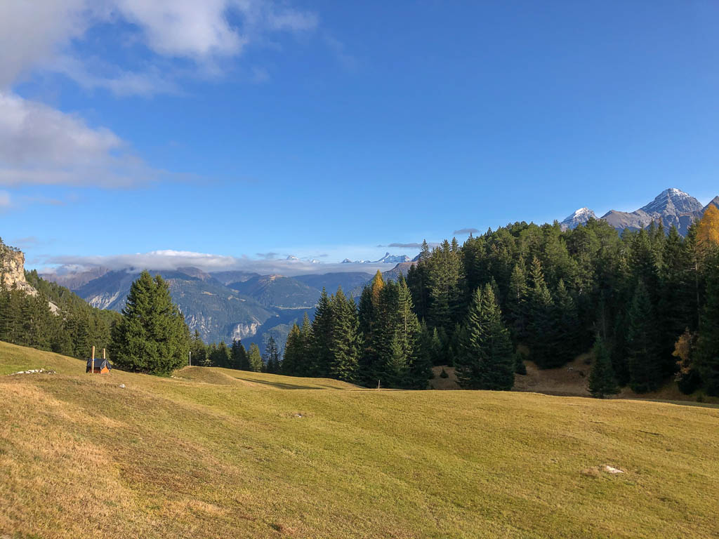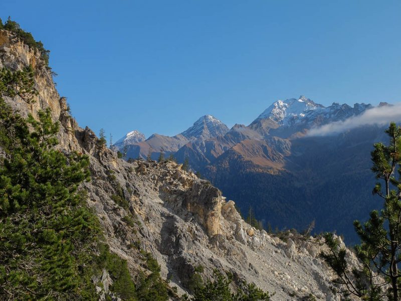 Nach der imposanten, weißgrauen Felsenlandschaft rund ums Gipshorn begrüßt uns auf dem Weg hinunter von Fanezmeder nach Monstein der goldene Herbst der Bündner Berge: